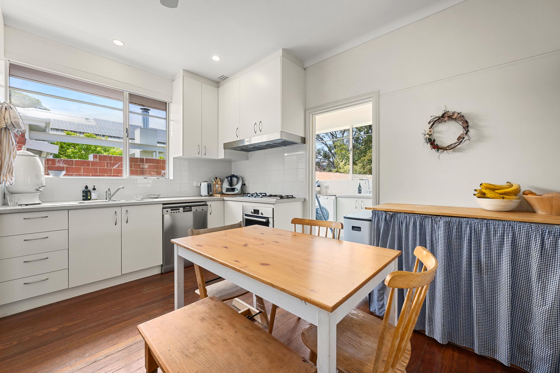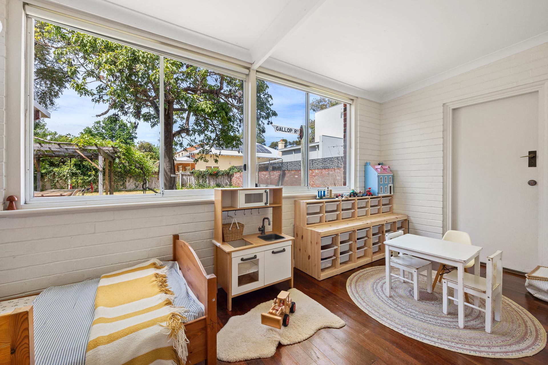 There is a separate laundry with a shower and WC adjoining the kitchen, a rear paved terrace, and an outdoor WC, as per the style of home at the time this was built in the early 1950s. In fact, this entire street is a steeped in history. James Gallop was one of the original landowners in the area and an old Gallop Road street sign still takes pride of place in the rear garden of this property.