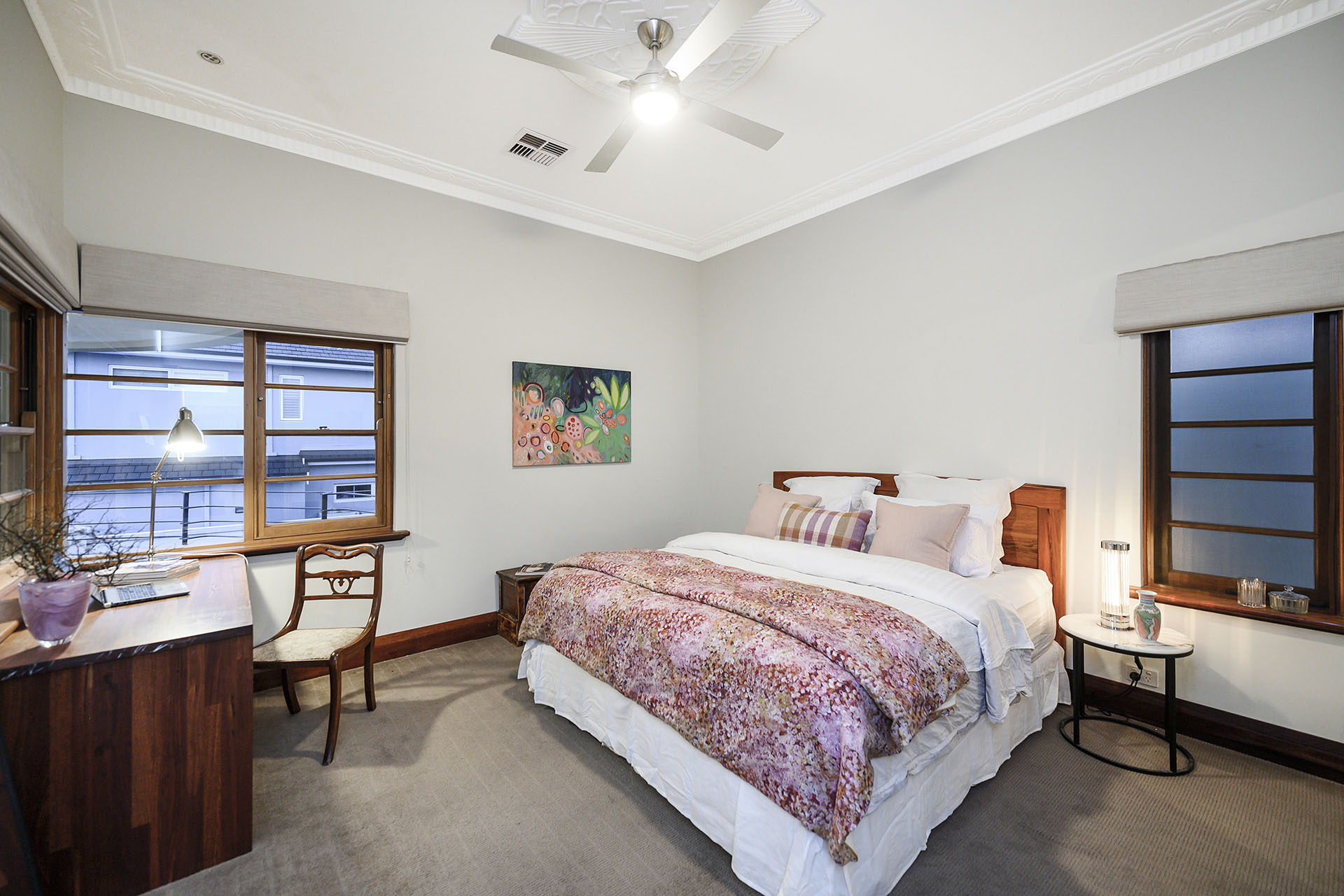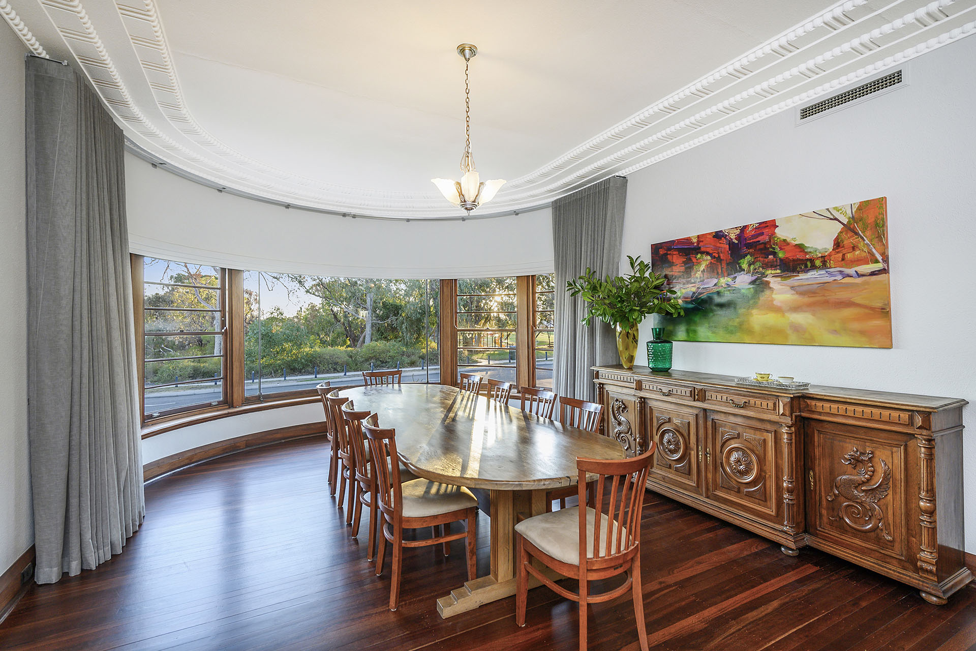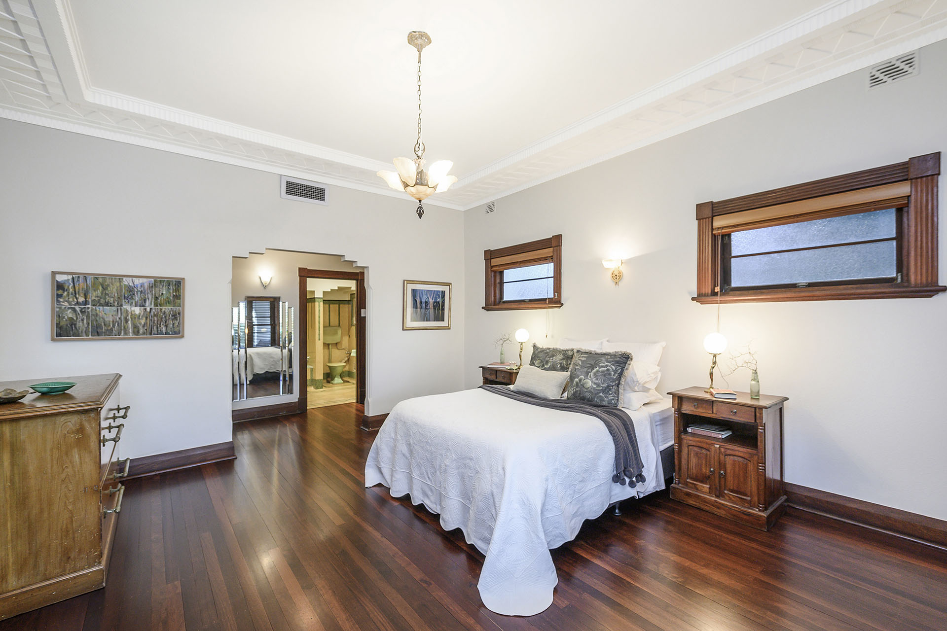 Inside, the sense of scale is immediate. Five grand bedrooms – each considerably more spacious than the modern standard – soar beneath gallery-height ceilings adorned with detailed cornicing in a unique ornamentation. Every surface, from the polished Jarrah floorboards to the sculptural architraves and original fireplaces, speaks to a period of handcrafted excellence which exudes quality and passion.