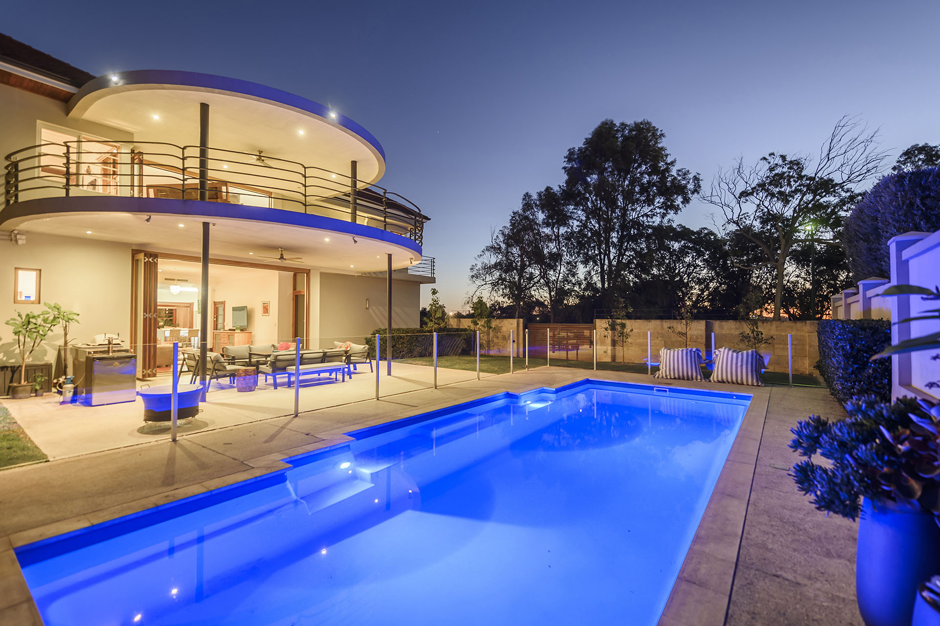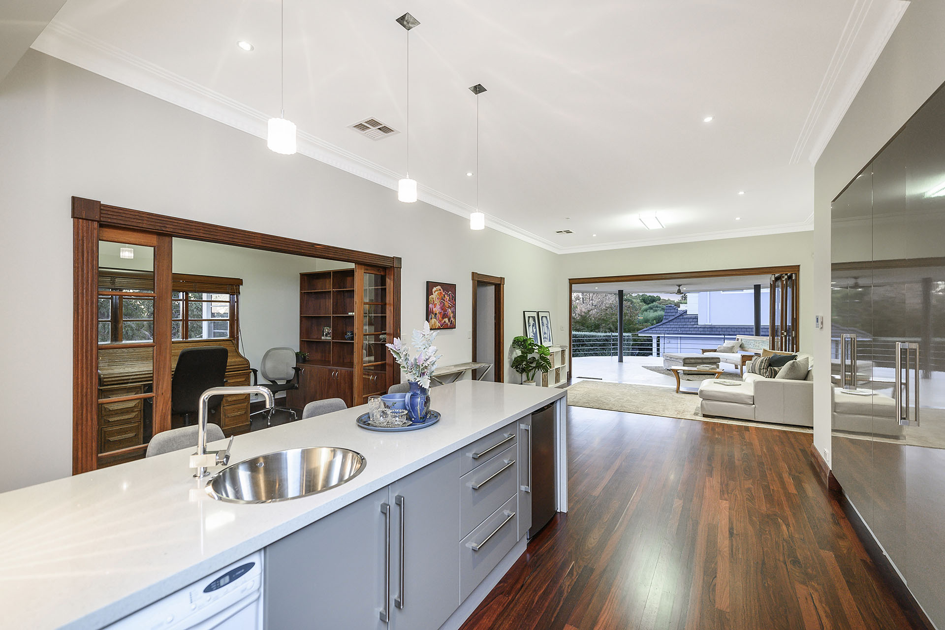 Upon traversing the welcoming entry foyer, a voluminous ballroom-like lounge emerges with cascading window hangings, flowing seamlessly to a dining space just as suited to black-tie banquets as Tuesday night barbecues. Speaking of, when it comes to options for alfresco dining and entertaining, you’re spoilt for choice, with either poolside environs or an elevated option overlooking the quiet greenery of the David Cruickshank Reserve arrayed there and ready.