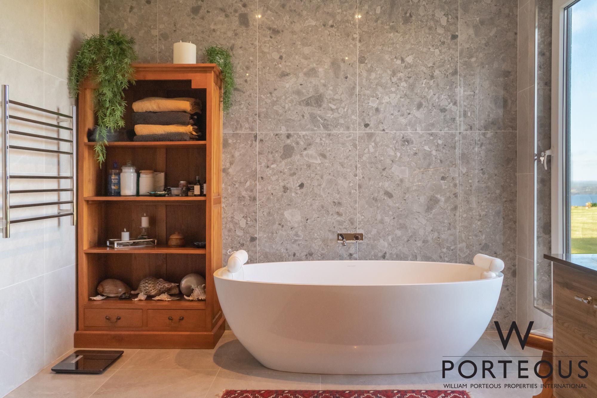 A large studio/ games room is on your left, under the main roof but separated by the courtyard from the rest of the house. This room could also be an exceptional bedroom as it has a full ensuite bathroom. Large windows to the north, east and west really connect you to the amazing landscape and sweeping views in all directions. The room opens to the east and a covered veranda that in turn flows onto the large northern lawn. A drop-down theatre screen and surround sound speakers make this a brilliant home theatre and games room.