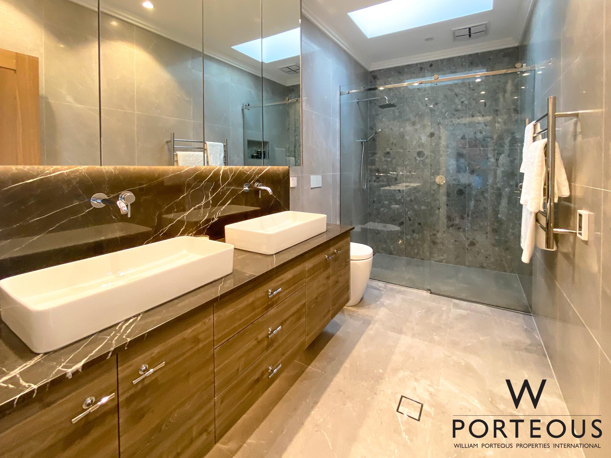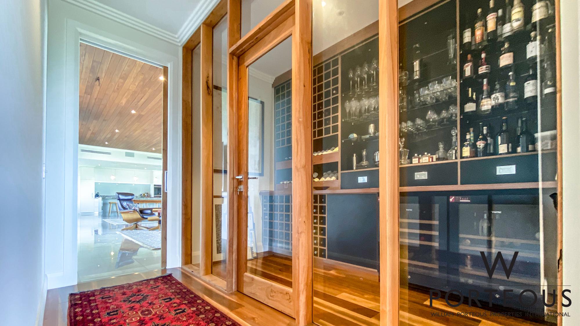 At one end of the room, the gourmet kitchen anchors the room with a large Brazilian Granite island bench, ideal casual dining. Extra-sized Wolf Ovens, Wolf induction hob, Zip tap, integrated fridge, dishwashers and undercounter Vintec wine/champagne fridge all feature. The walk-in pantry offers abundant storage and extra bench space.
