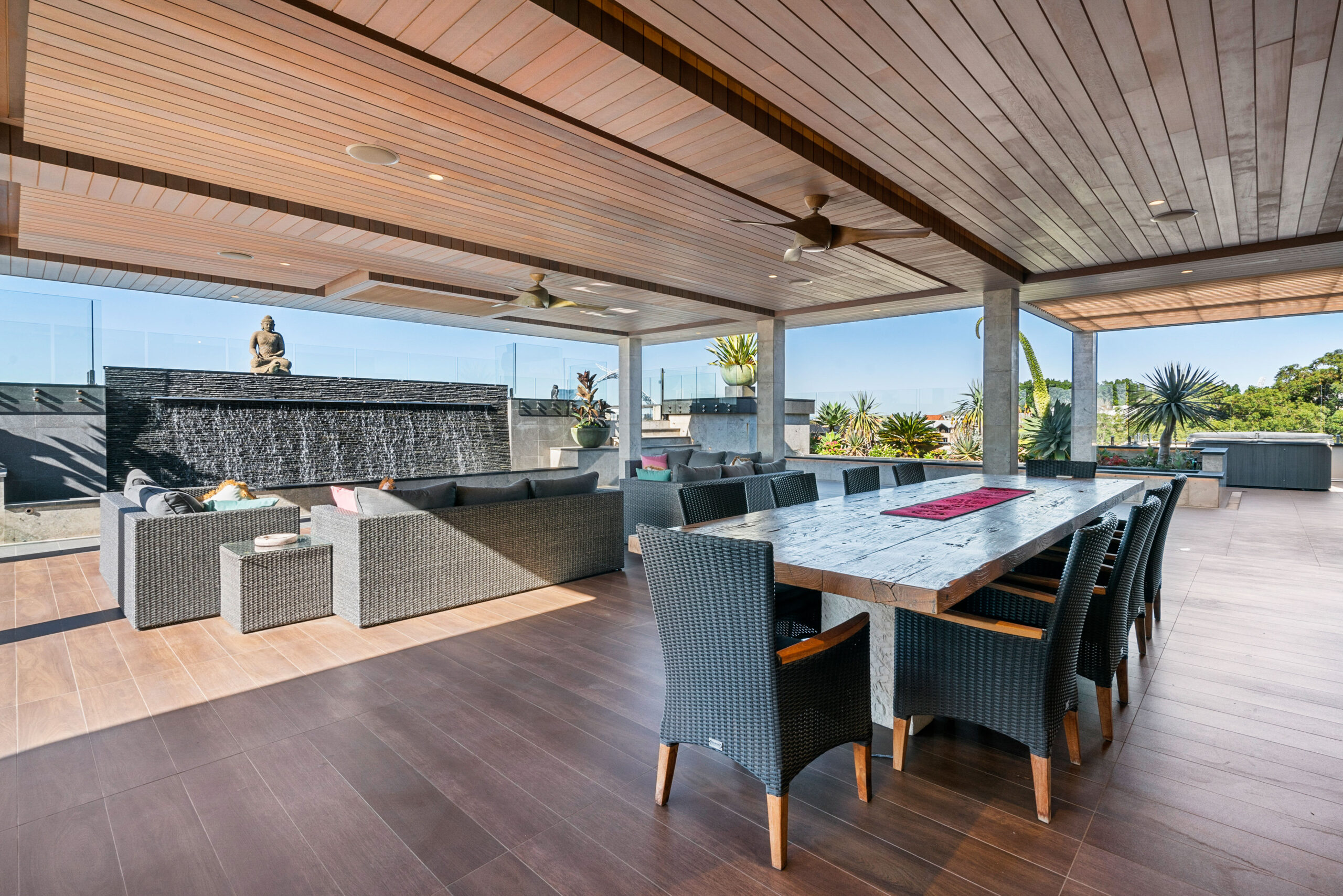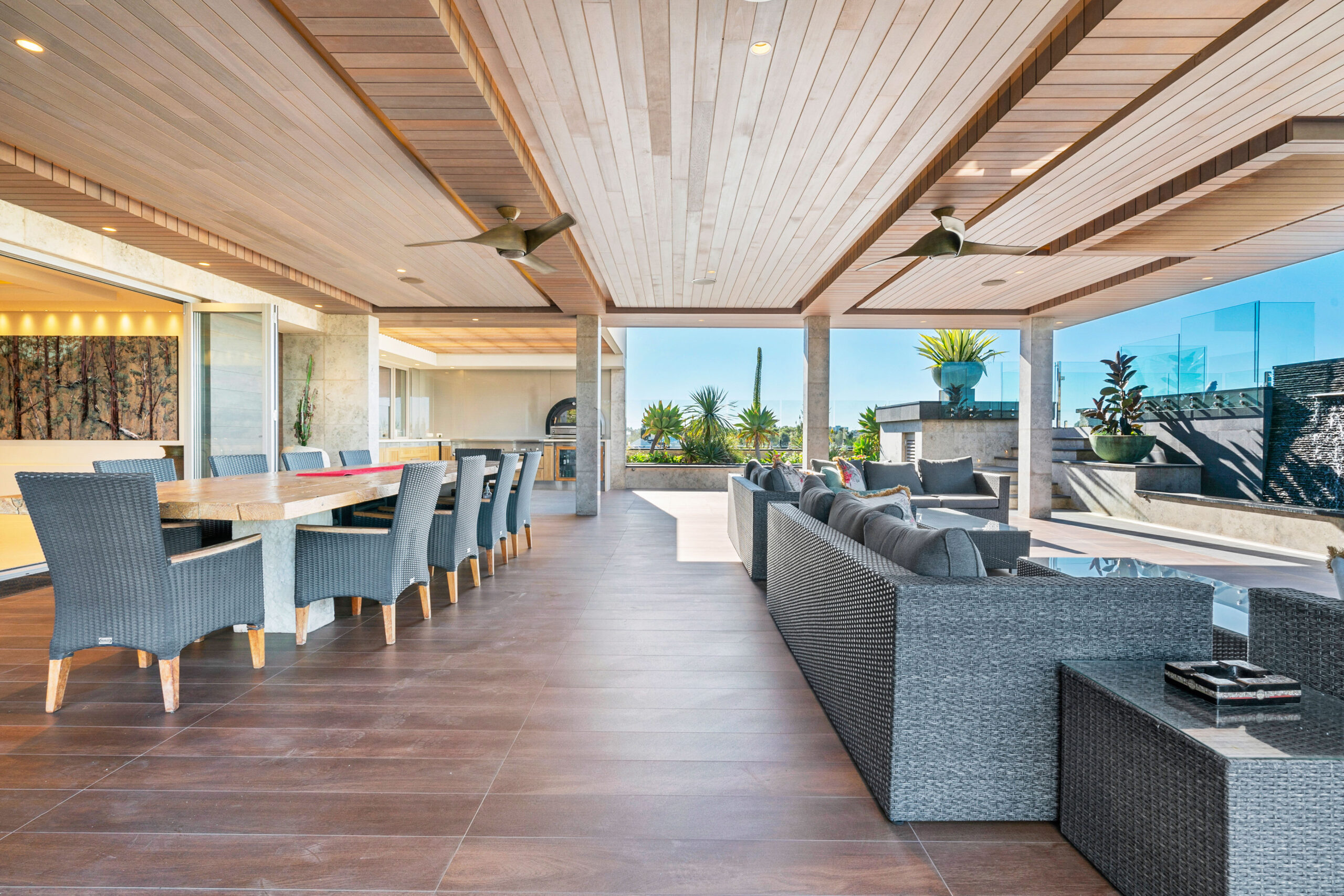 • Covered external dining entertaining area with dining table, lounge area a large drop-down TV screen