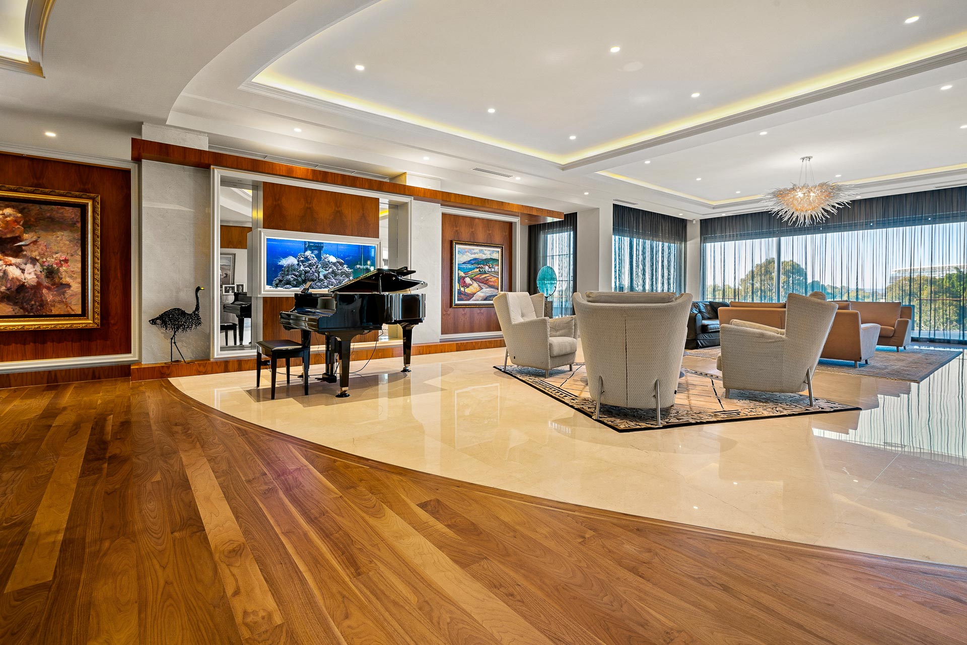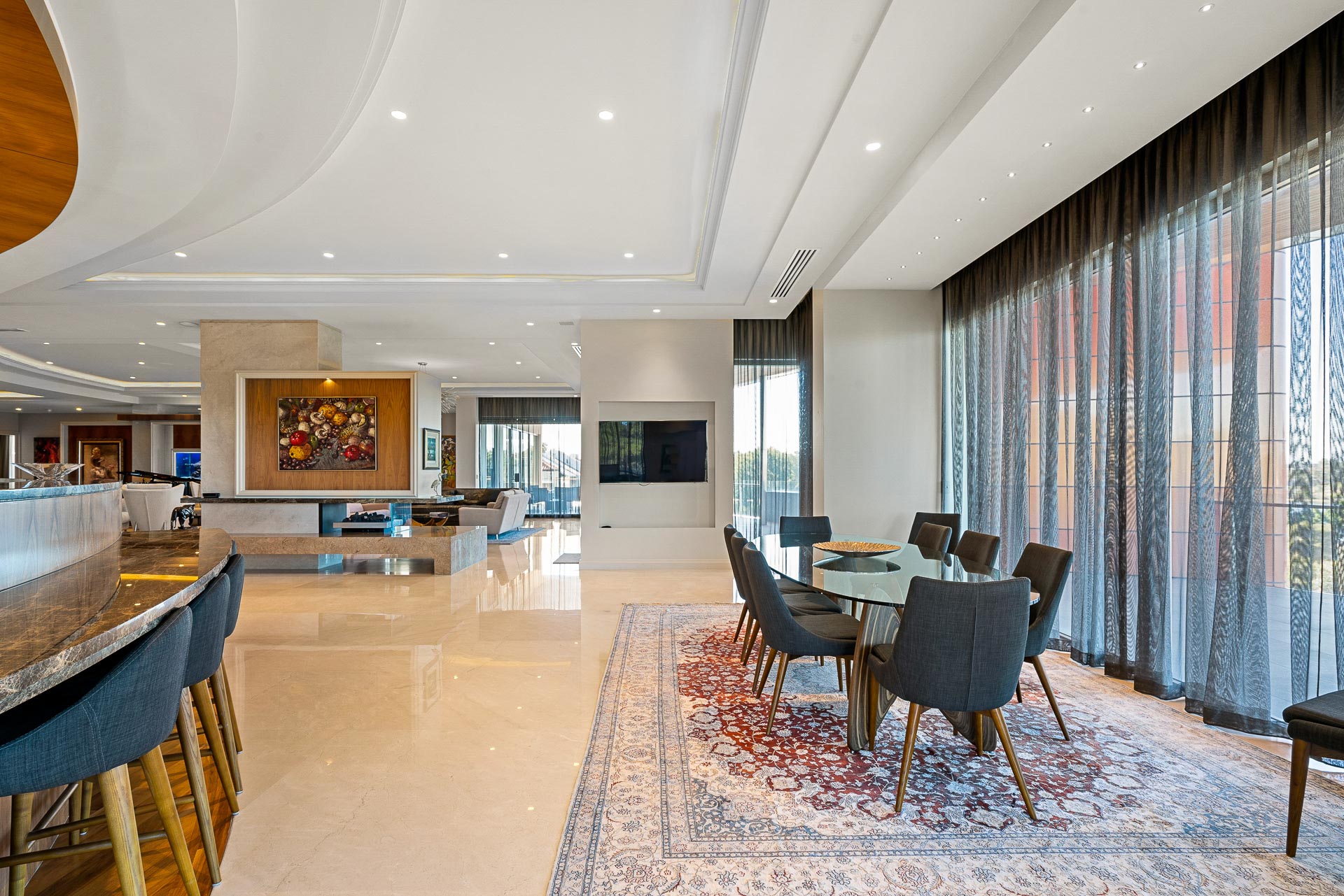 • Remote controlled best quality curtains, and window treatments throughout