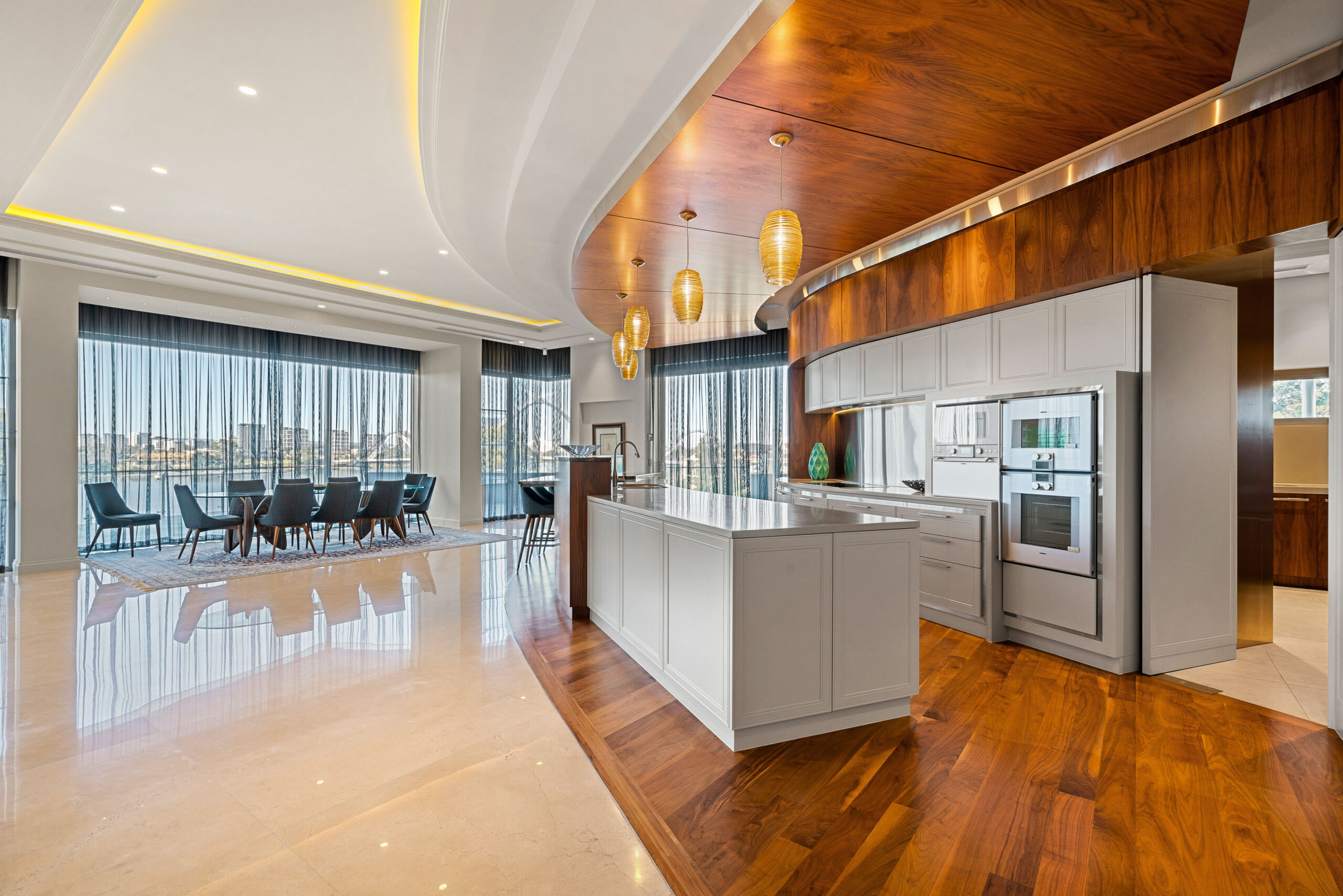 This is without question one of Australia’s finest luxury Penthouses. It is also one of the largest at 1896 square metres, occupying the full top two floors of the boutique Mardelup Building at 11 Brown Street, East Perth, right on the Swan Riverfront at the entrance to Claisebrook Cove. Looking east across the water to Perth’s Stadium (Optus stadium) and the Burswood Peninsular with the Crown Resorts entertainment precinct, which is accessed directly via the new and architecturally stunning Matagarup Bridge.