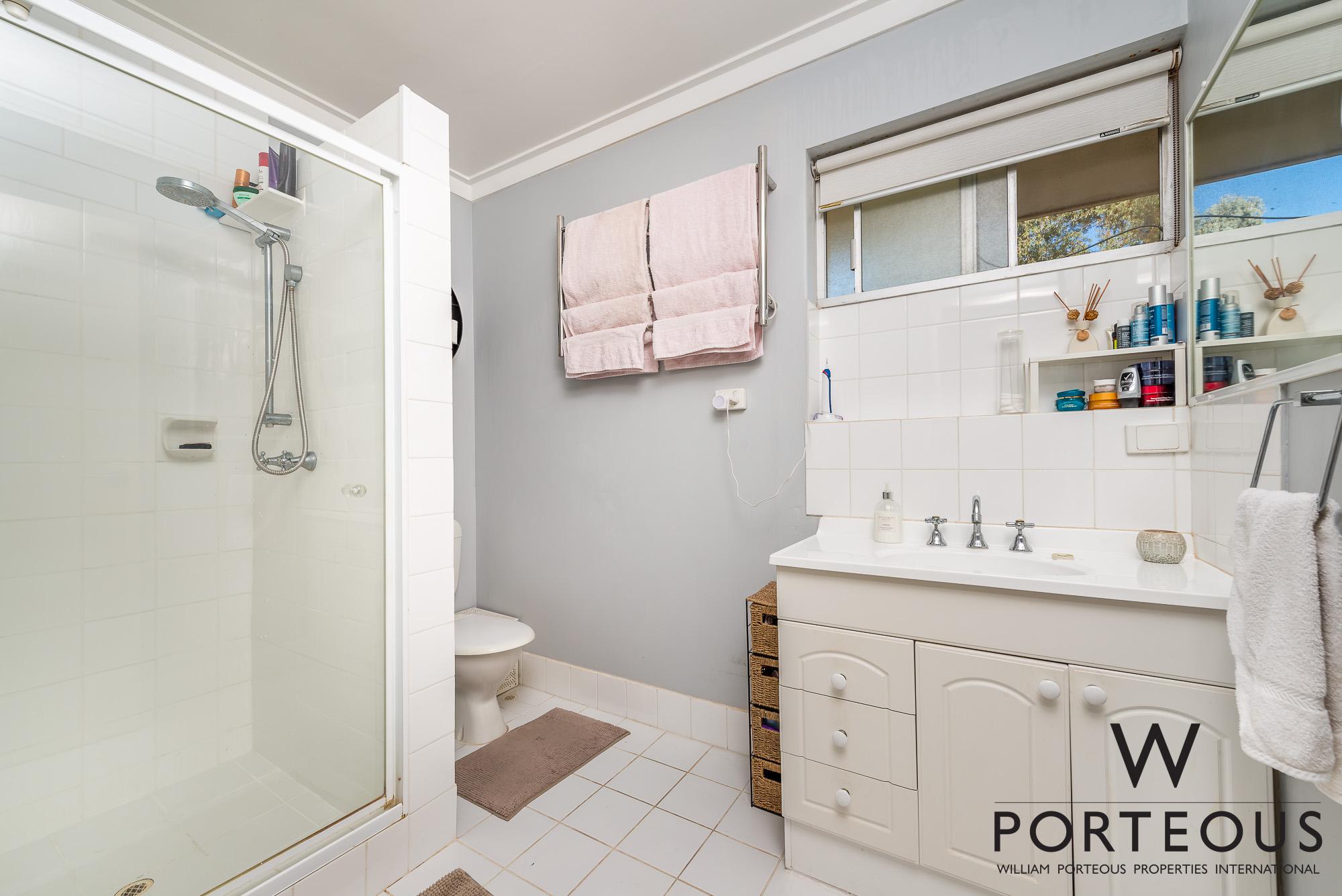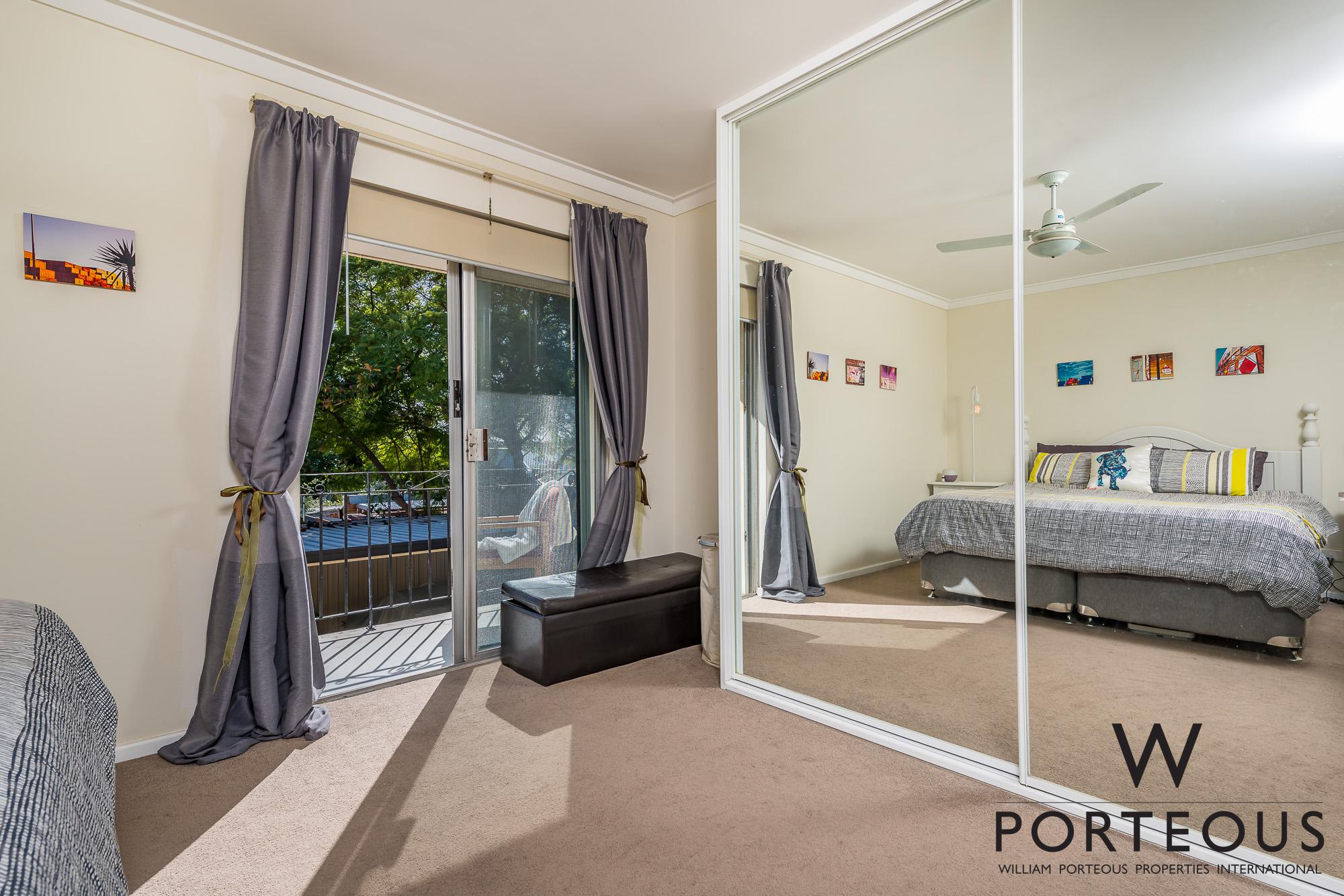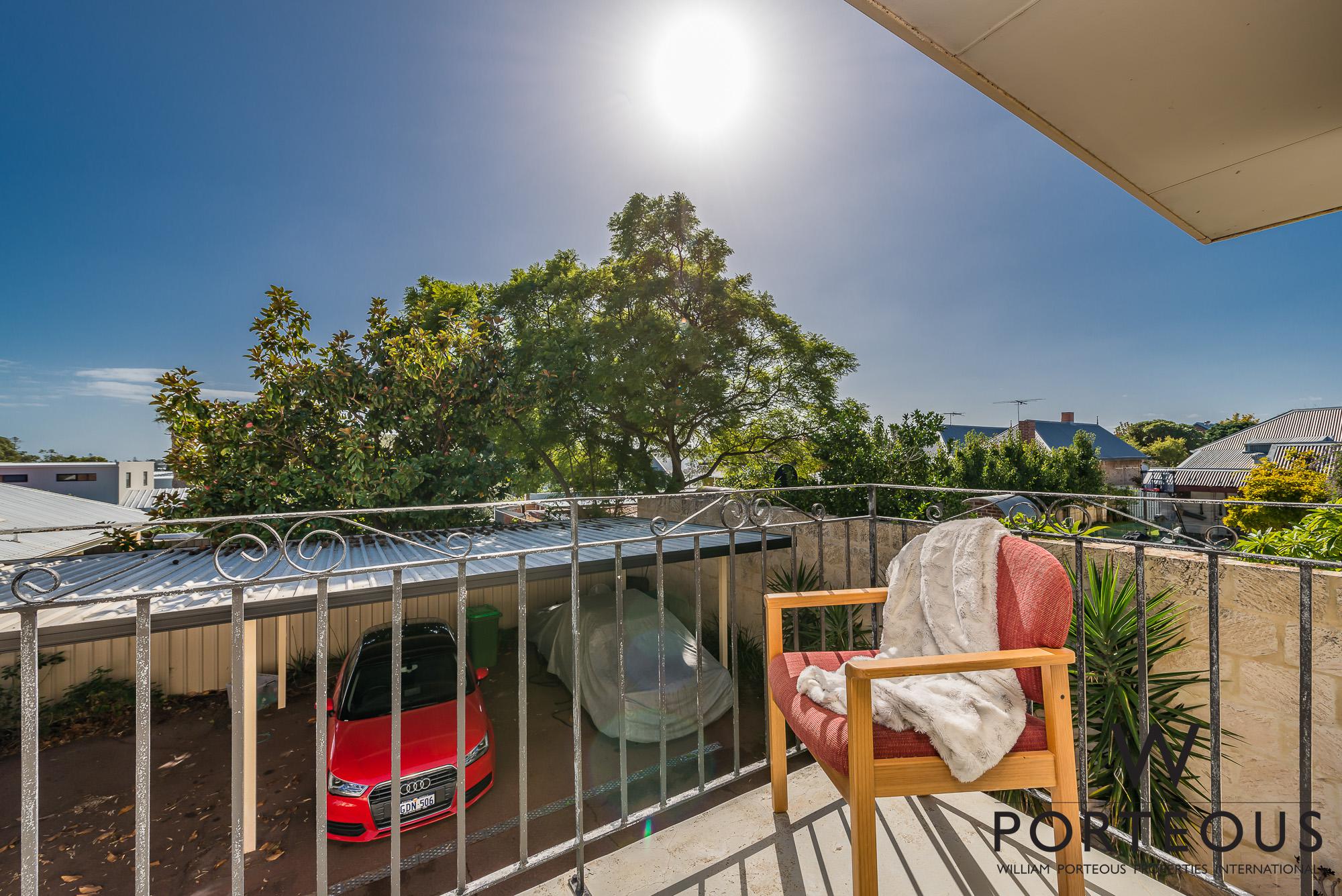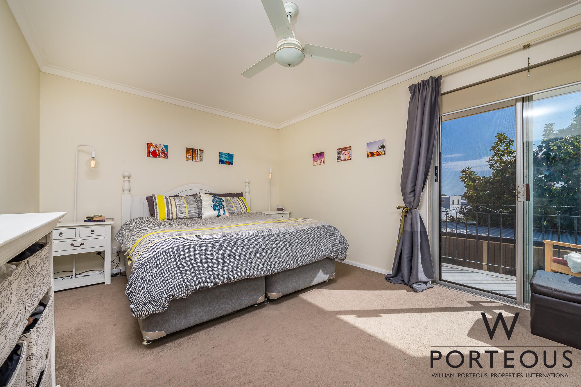 From the entry and living room, stairs bring you up to the bedrooms and bathroom. The main bedroom is very generous, with built in robes and a lovely north facing balcony. Again, light, bright and airy. The second smaller bedroom has a window overlooking the rear courtyard. It’s fantastic as a secondary bedroom or a spacious study. The bathroom has been refreshed and includes a shower, vanity and W.C.
