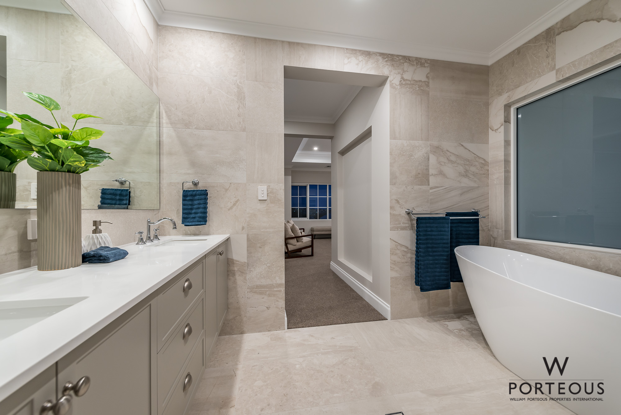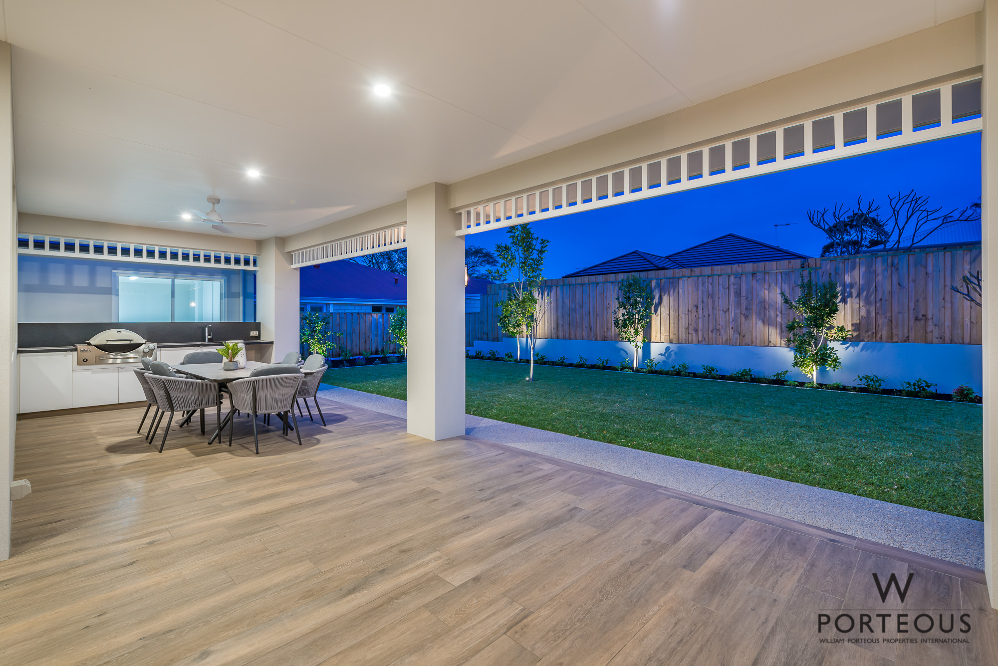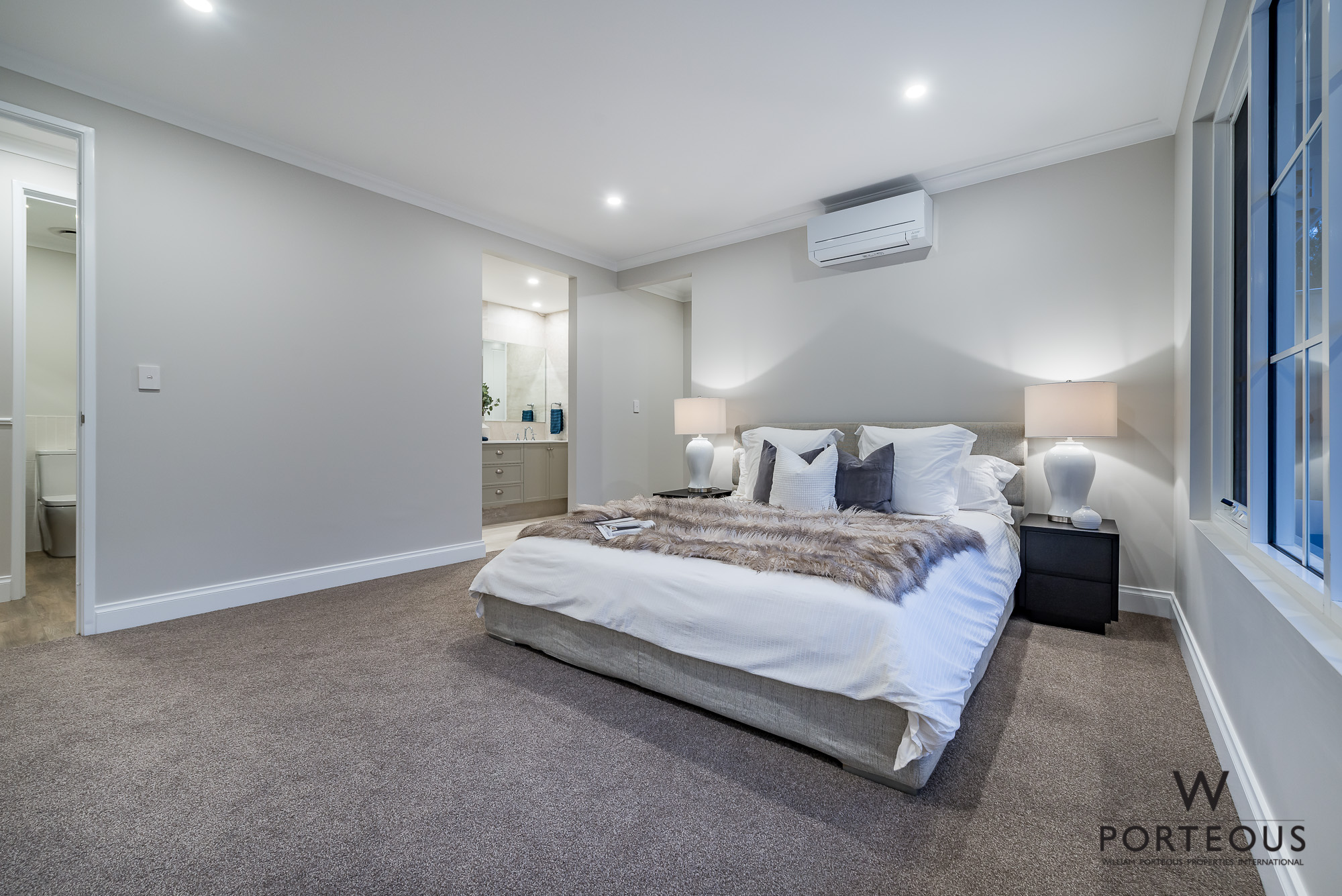Upstairs the king sized main bedroom suite has a striking recessed ceiling, a massive walk-in wardrobe, a generous fully-tiled ensuite bathroom giving you a large serve of luxury at home with a walk-in rain-head shower, twin stone vanities and a free-standing bathtub. The fully tiled toilet is separate. The room enjoys a tree-lined vista back across the suburb to Fremantle, with ocean glimpses through exquisite French windows. Double doors connect you to the upstairs lounge, which in turn open onto a large balcony.