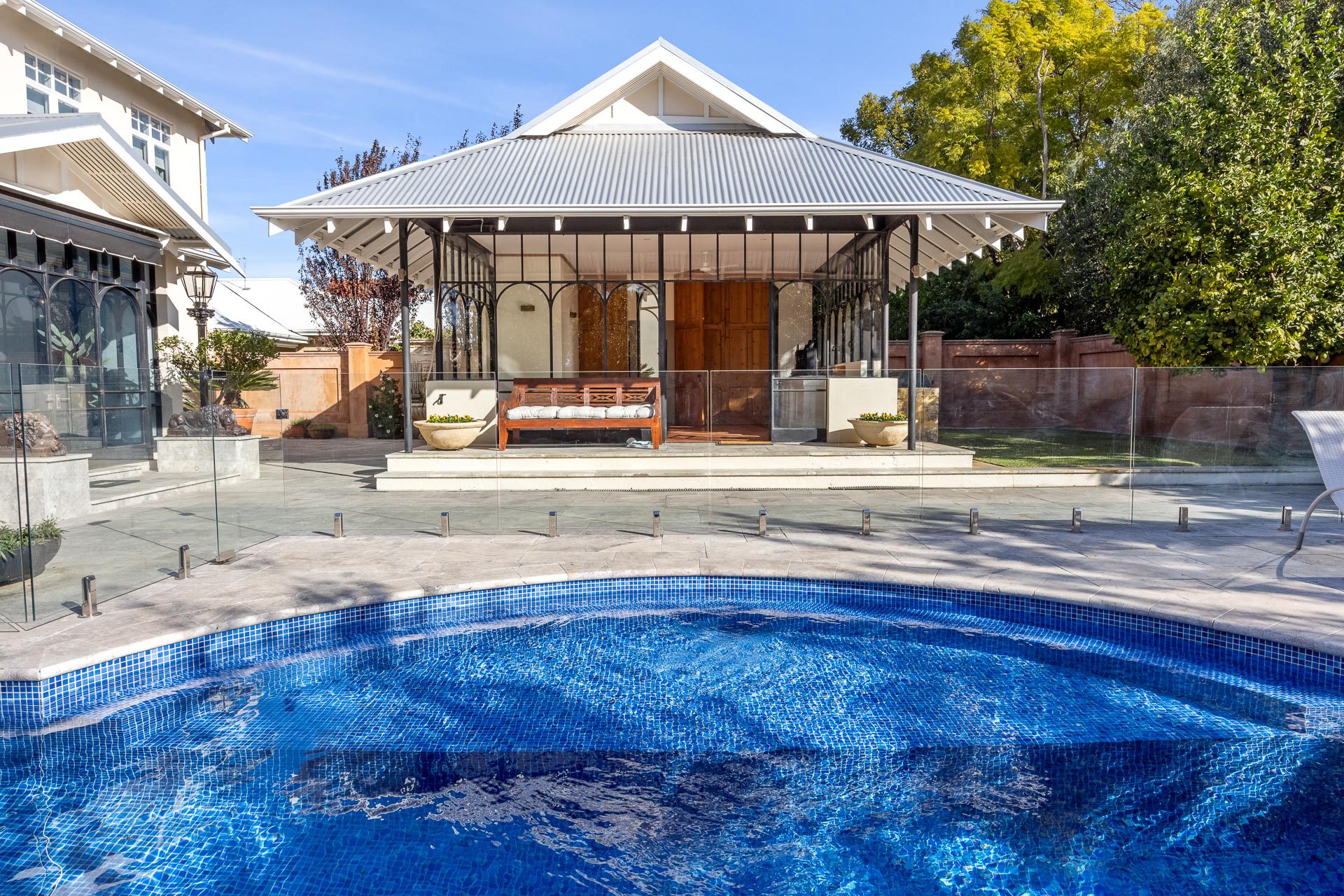 The pool is overlooked by a separate large pool house, ideal for a multitude of uses. The choice is up to you and how you want to live. Baltic pine doors open into a spa bath, shower, powder room and vanity. From here, a staircase leads to the fully sealed, limestone-walled cellar. A barbecue, ceiling fan, sink with dishwasher and stone benchtops complete this space.