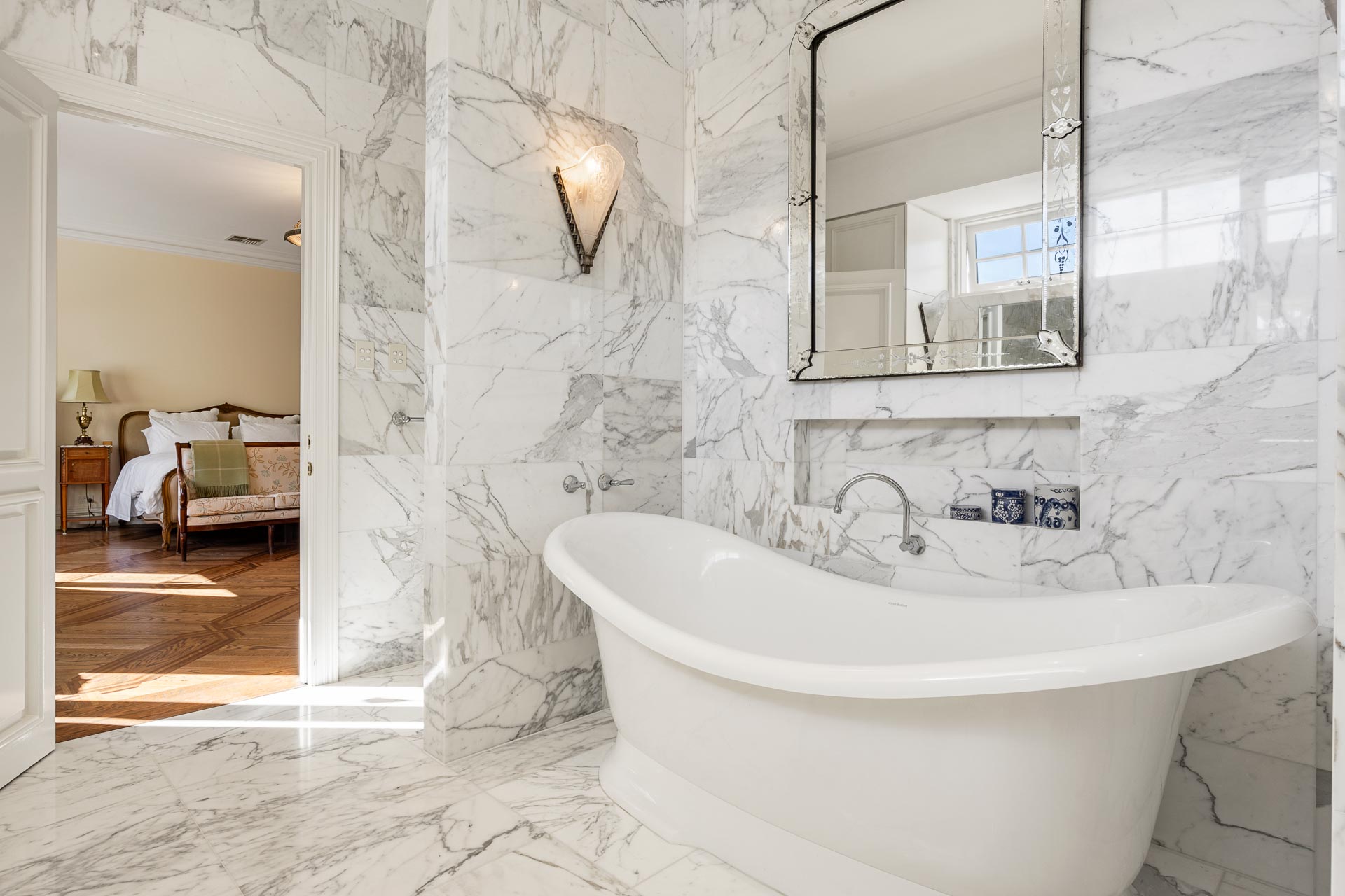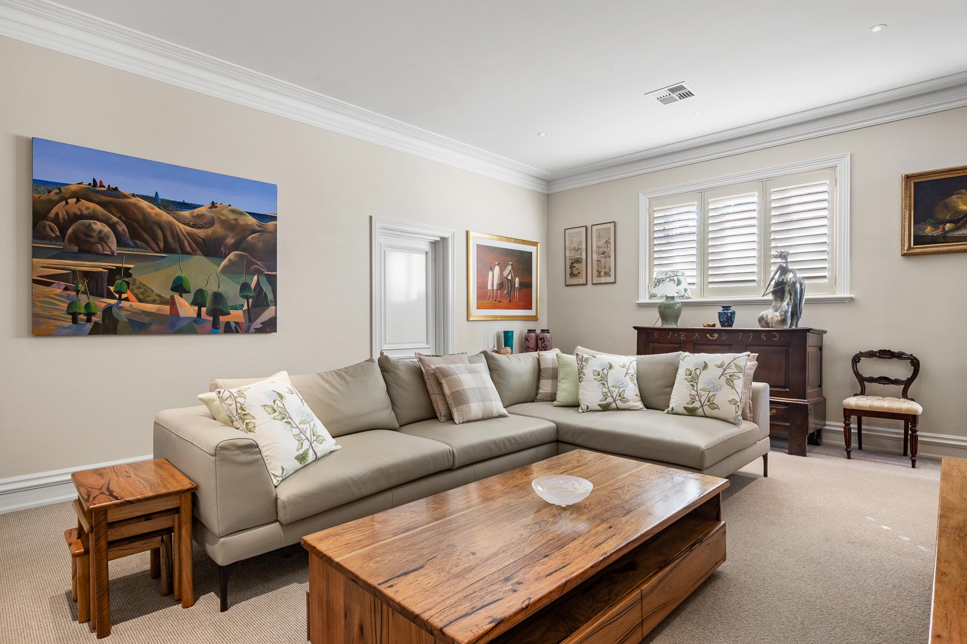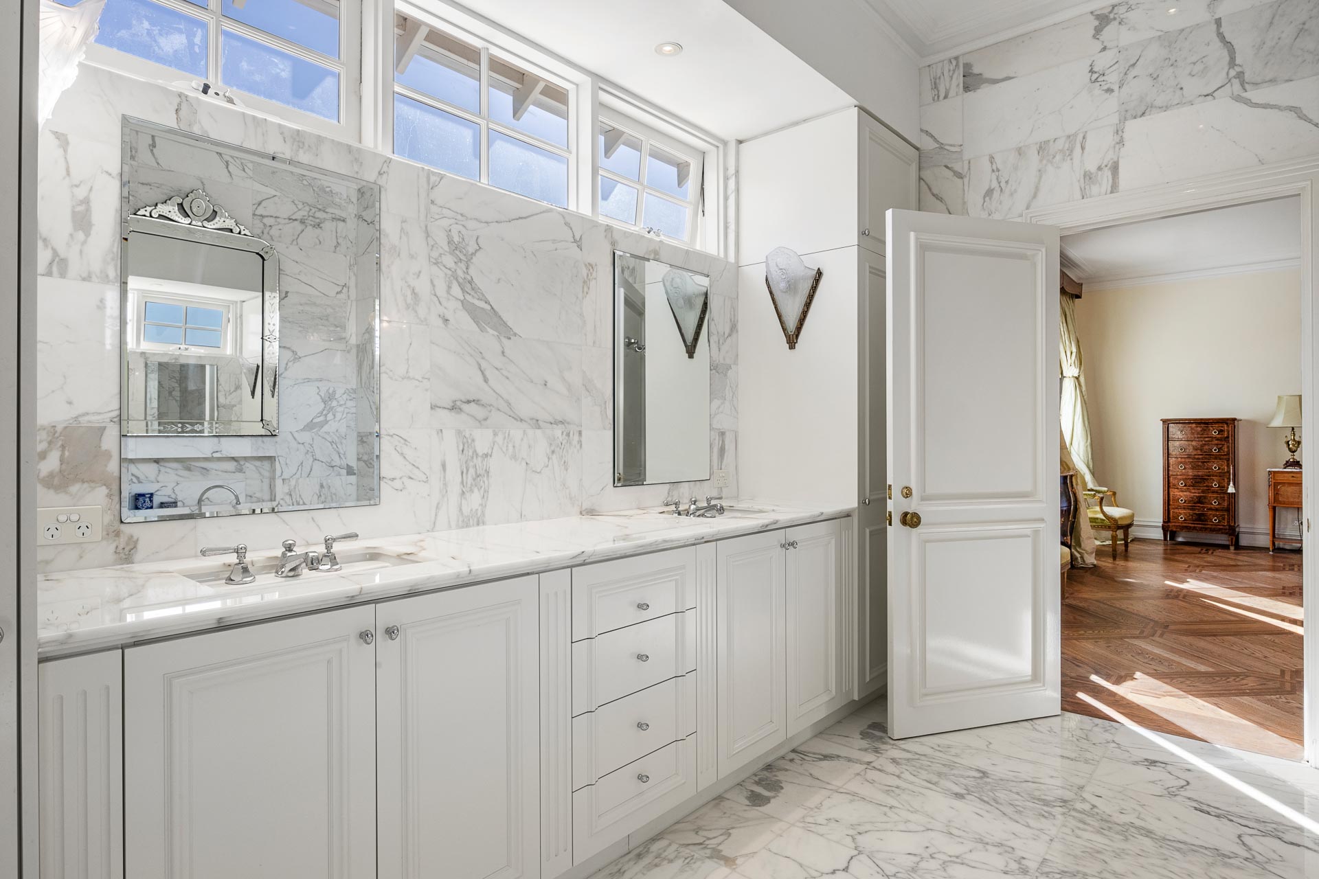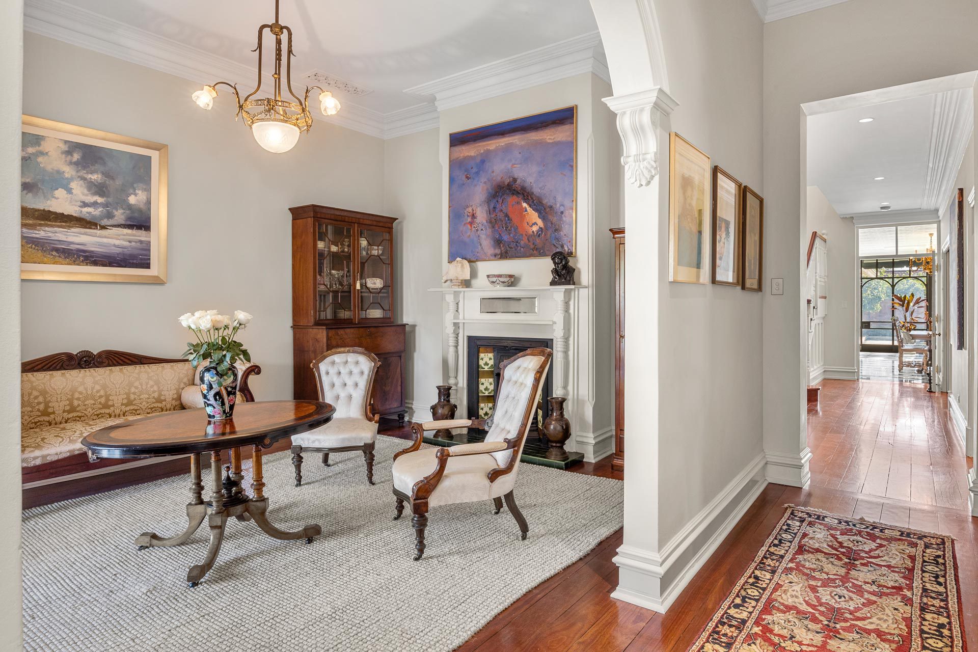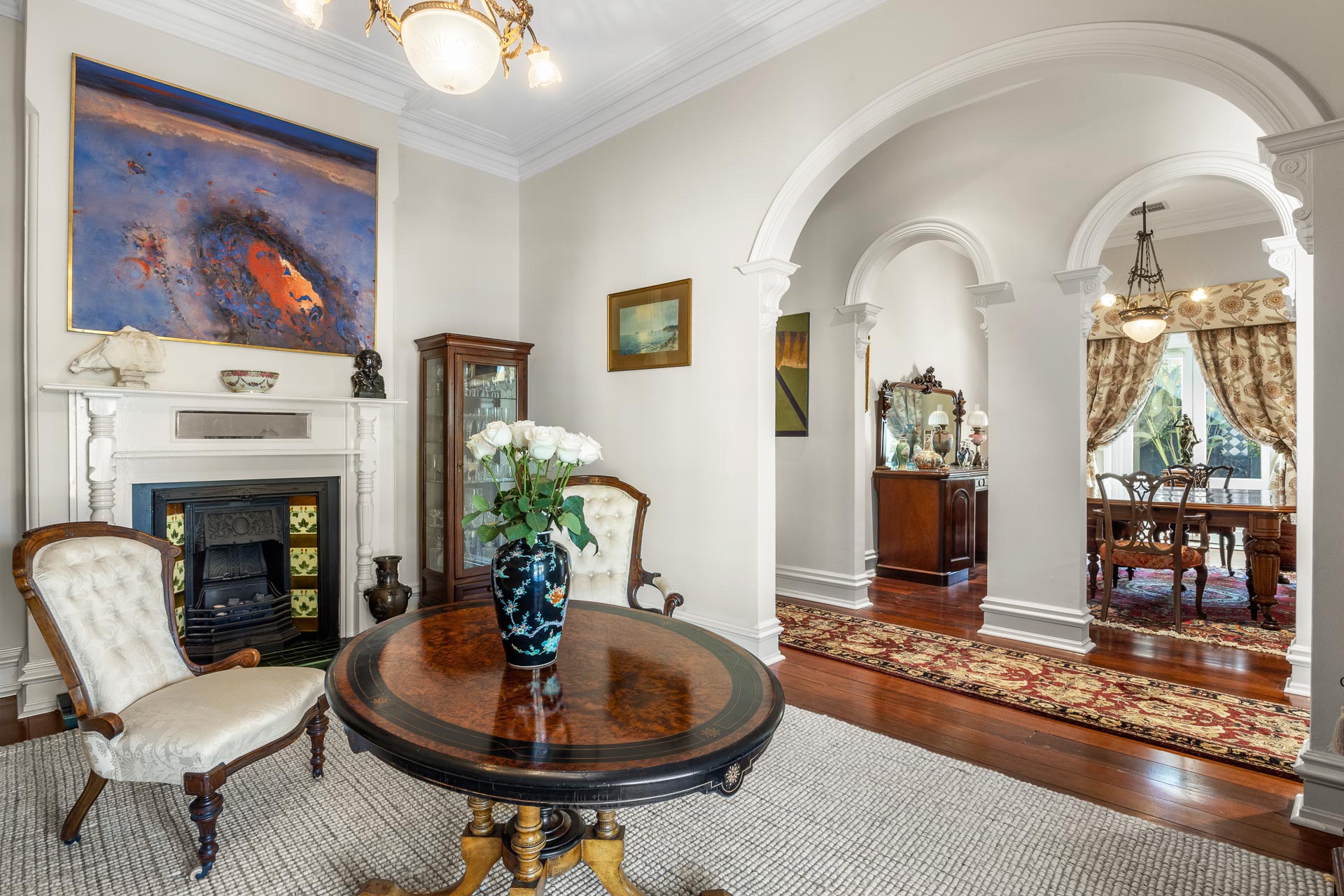 Throughout, premium delights such as antique lighting, Italian marble, and brass door hinges meet restored historic details such as original ceiling roses and fireplaces (now gas operated) and extensive jarrah flooring, among many other distinctive touches.