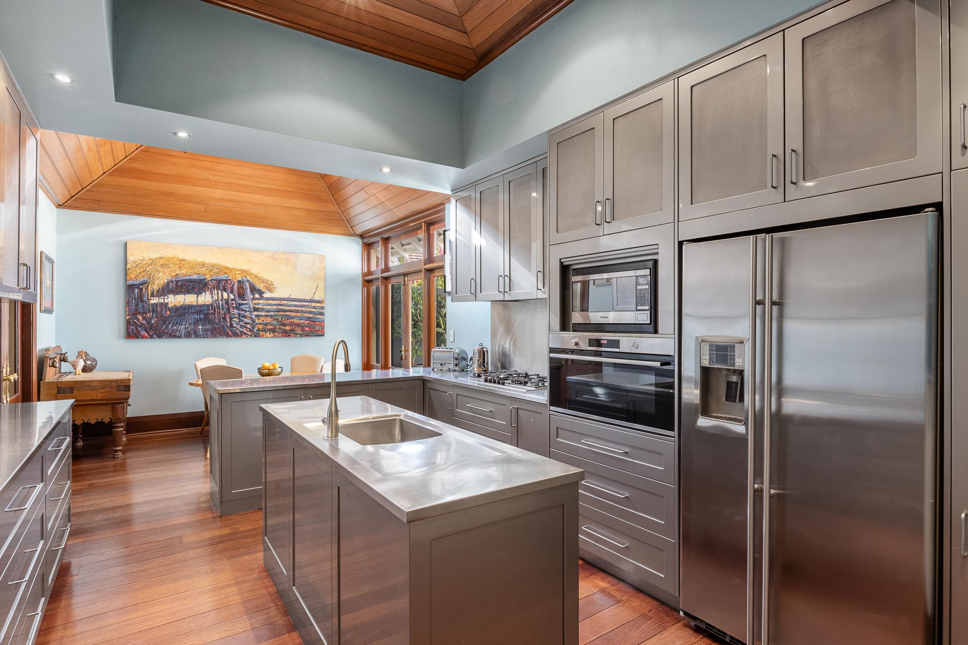 As eye-catching as it is functional, the use of stainless steel in the main kitchen gives it a uniquely sleek appeal. This is elevated by a suite of Bosch and Miele appliances, a central island with large sink, ample top and bottom storage and the vintage warmth of jarrah boards complementing the modernist stainless steel.