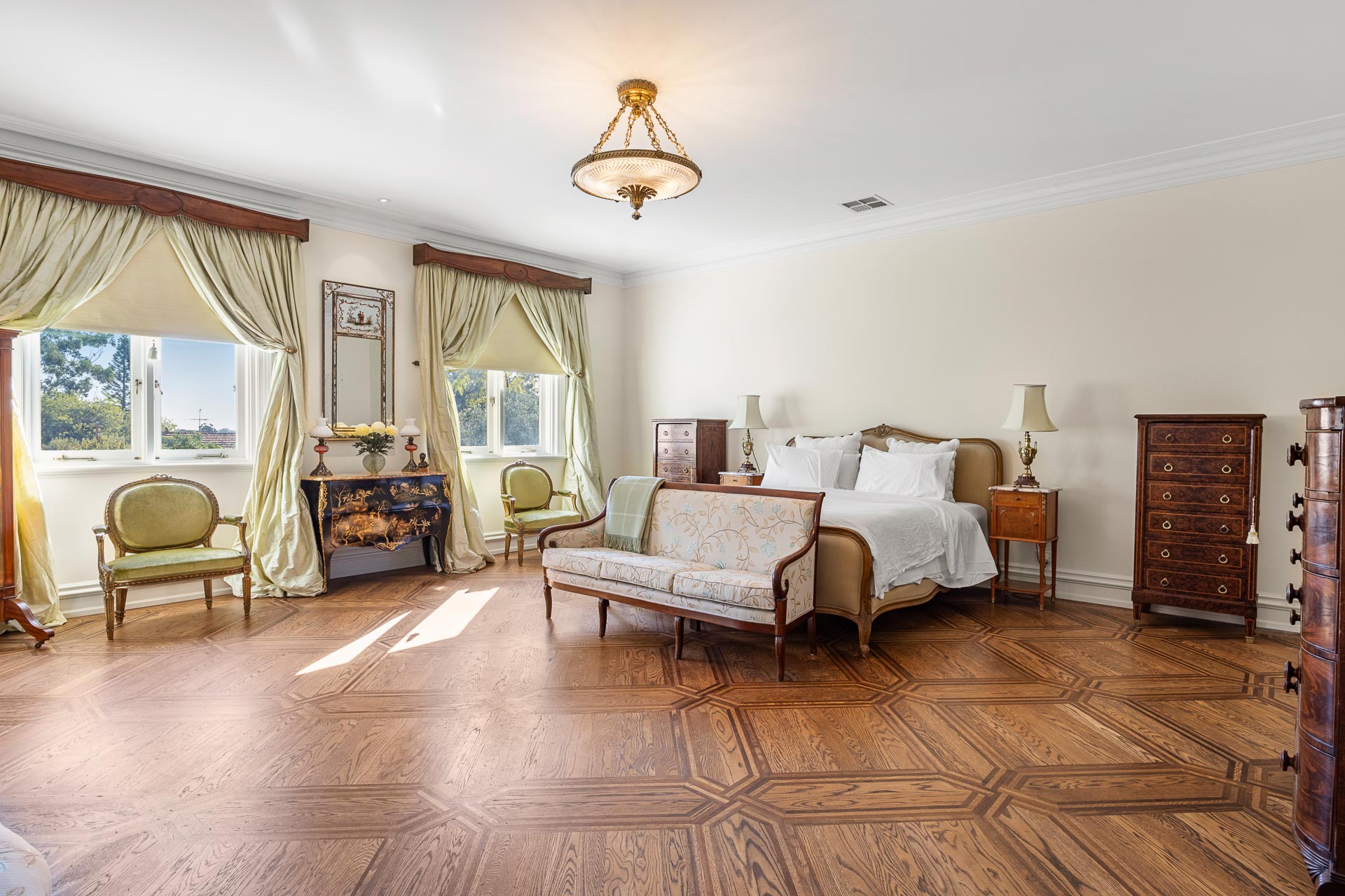 A formal sitting room with original fireplace surrounds, a formal dining room, silk curtains, and antique pendant lighting, combine to create a distinctive European-style ambience as you come into the home.