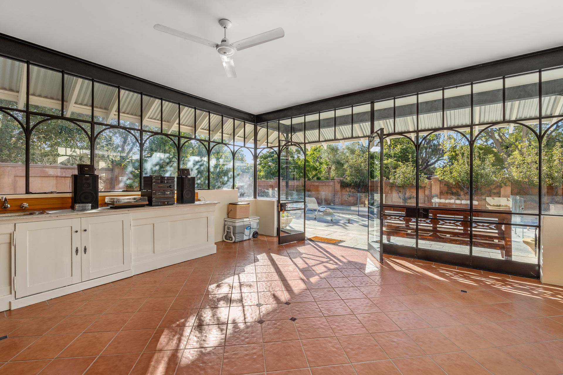 In the alfresco itself, find a ‘Kooka’ Metters oven restored to working order with gas stove top, fridges, granite benchtops and barbecue.
