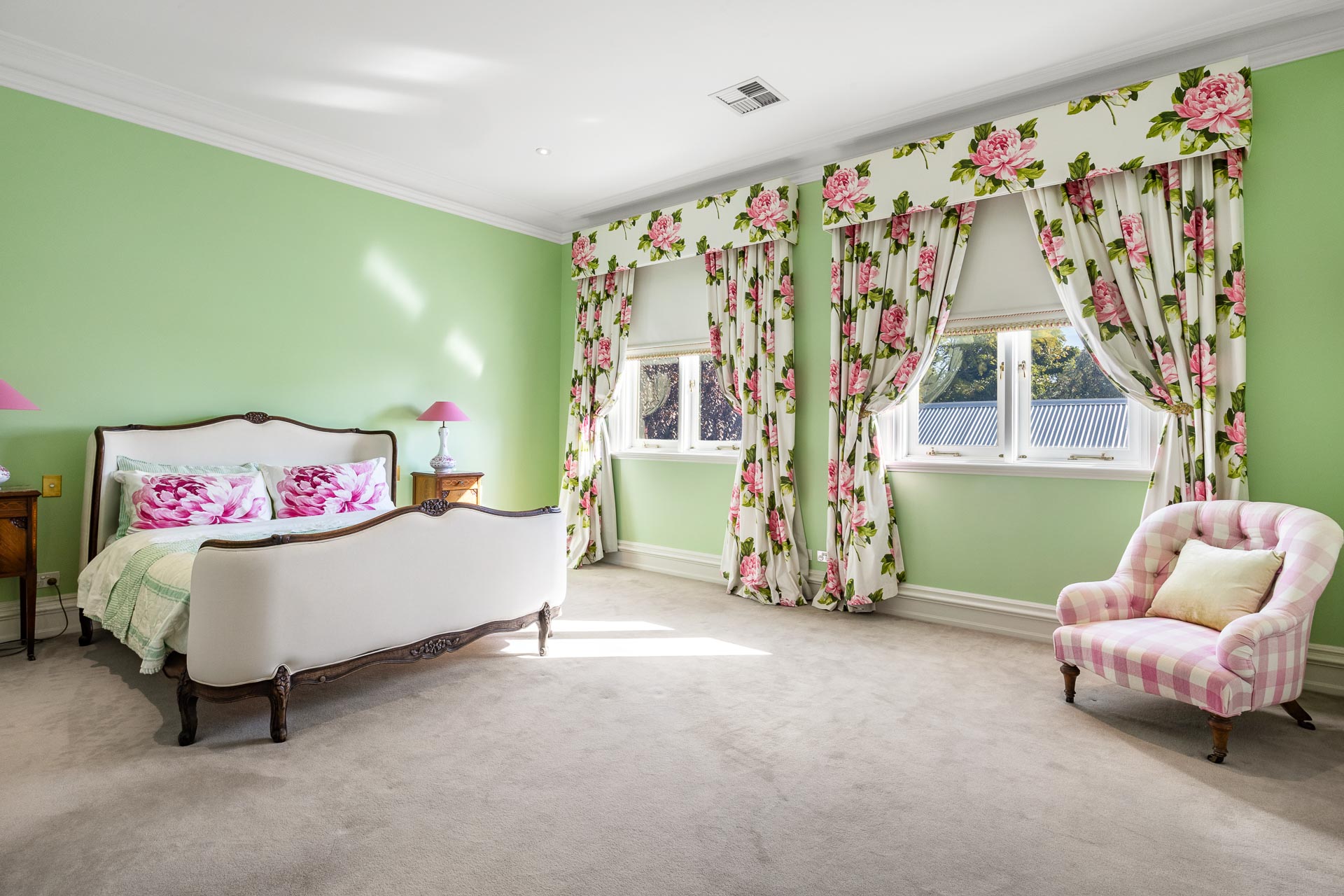 In bedroom two, also king-sized, facing west, children at any stage of life will love the quiet spaciousness of this room, complete with Designers’ Guild floral curtains, built-in robes with the same quality finishes as seen throughout.