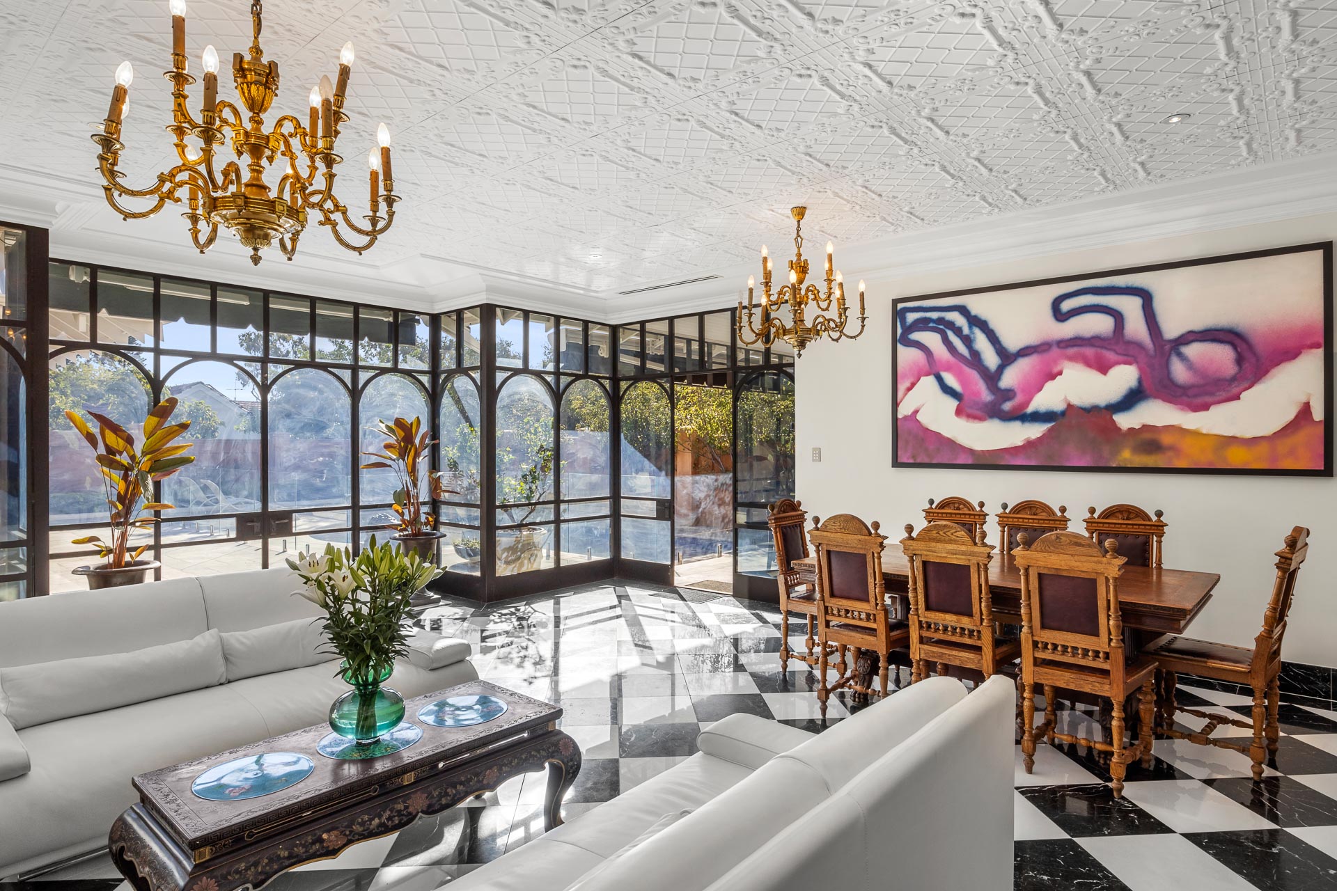 At the rear, a conservatory topped with a decorative pressed tin ceiling, edged with custom-made steel and glass doors opening to and overlooking the garden, is a real gem. With a French marble fireplace and Italian black and white marble flooring this is room to be savoured year round.
