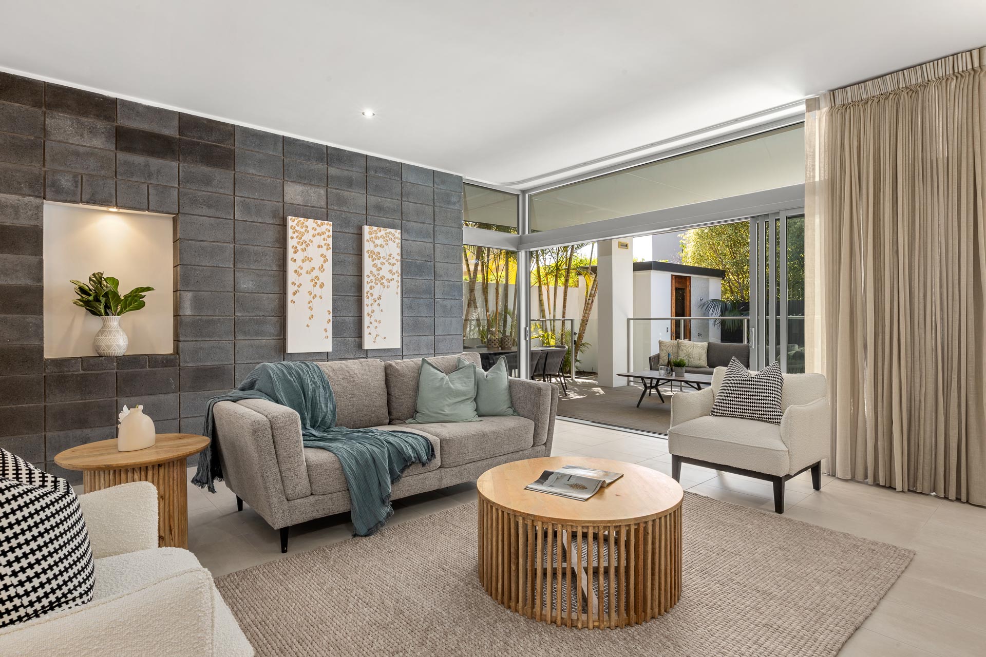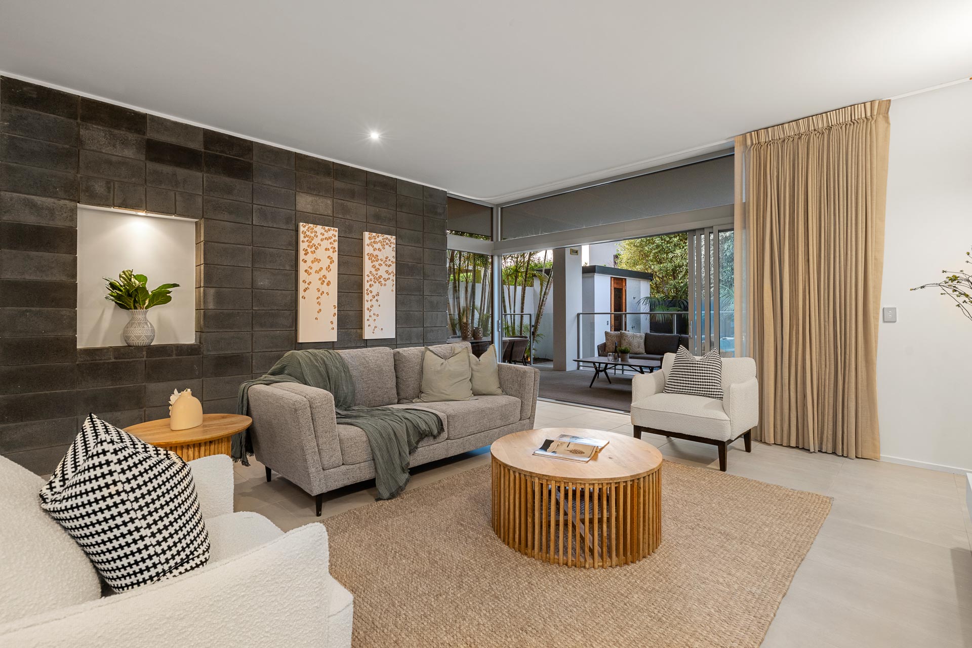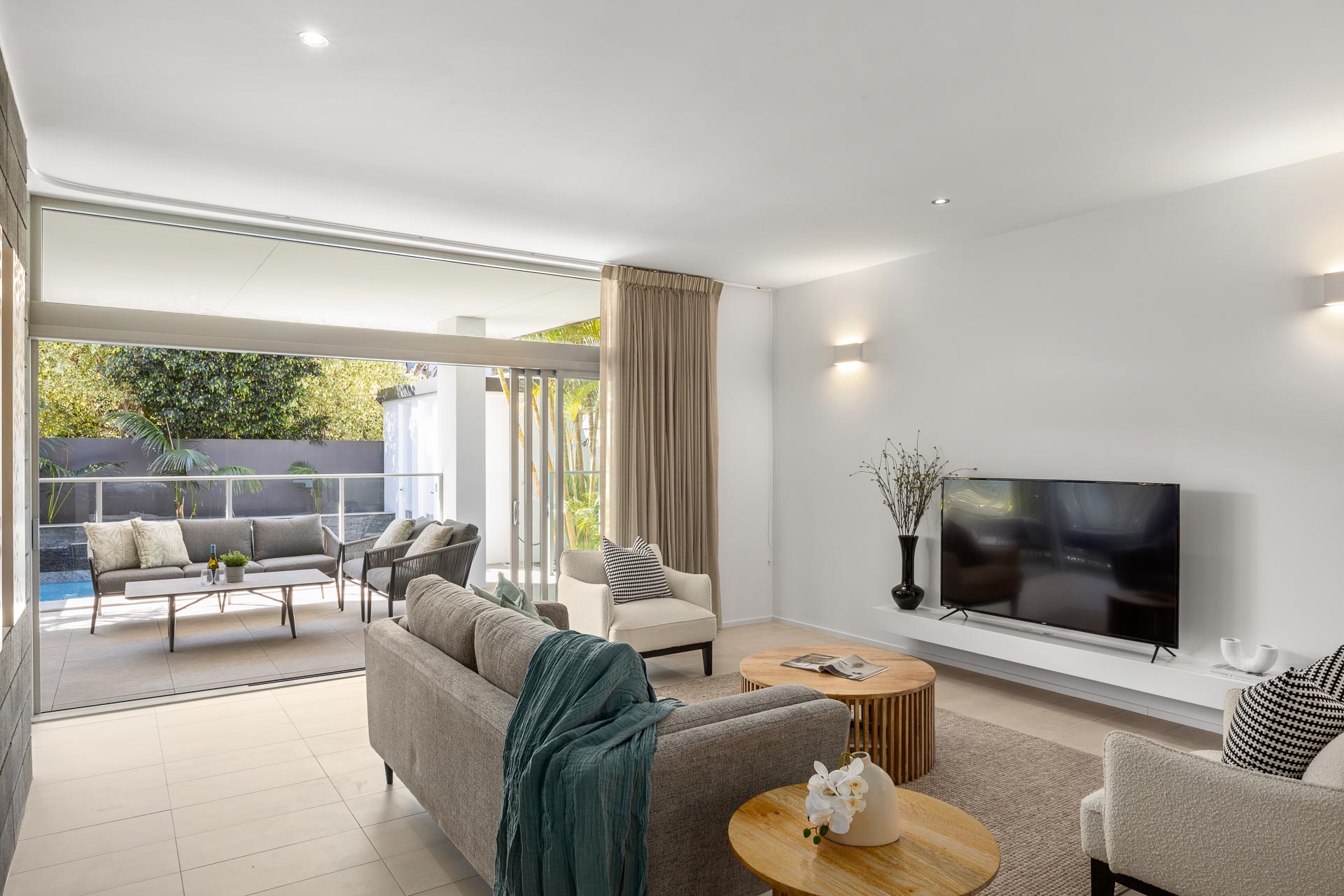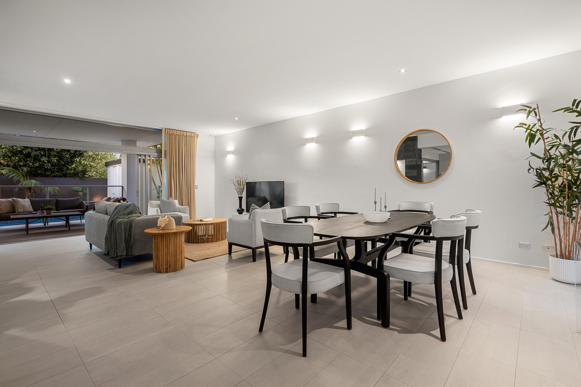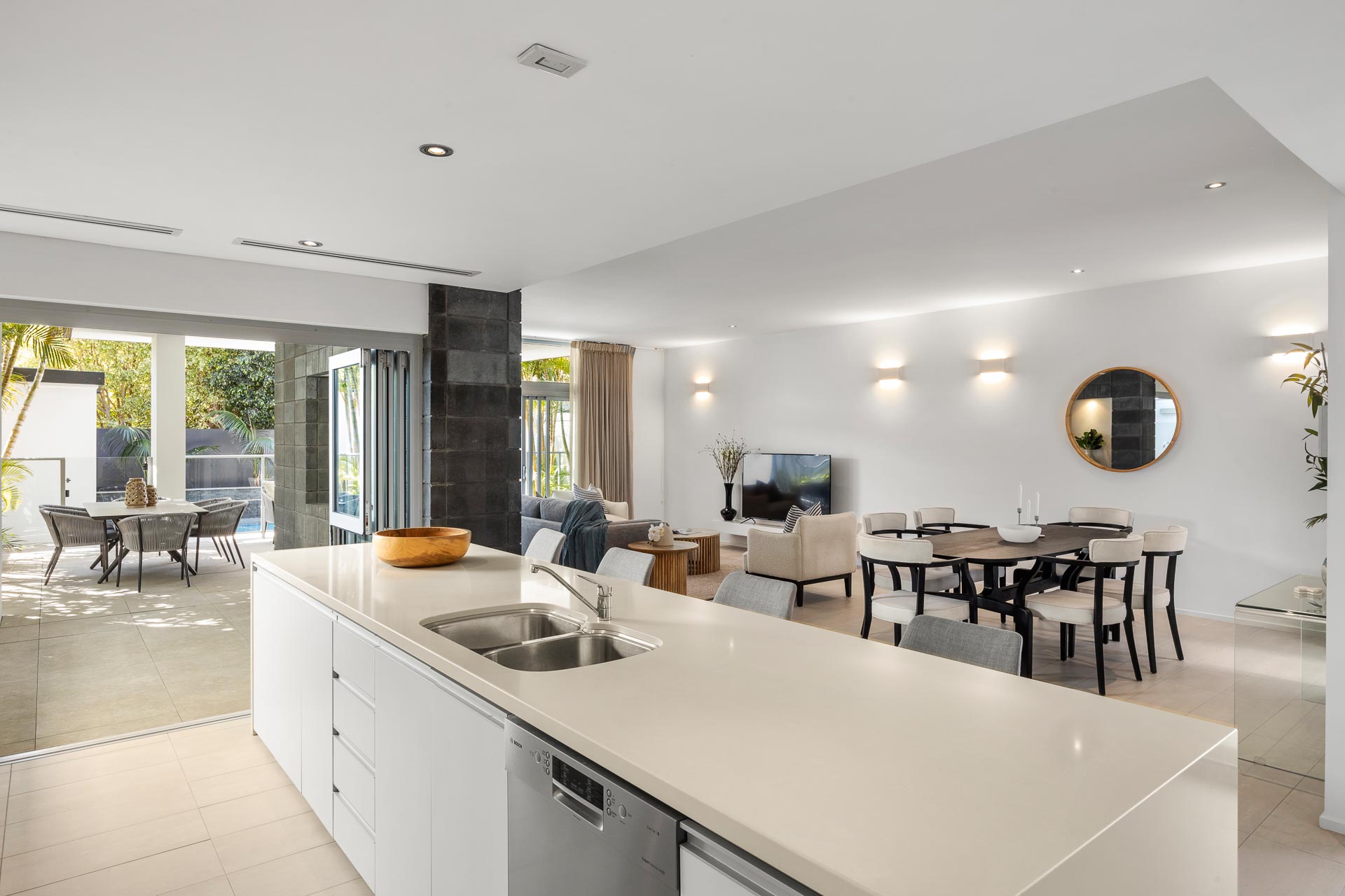 The informal lounge and living space seamlessly integrates indoors and out, with additional bifold doors that span the entire perimeter capturing the northern sunlight and creating a stunning open plan zone with high ceilings and generous proportions.