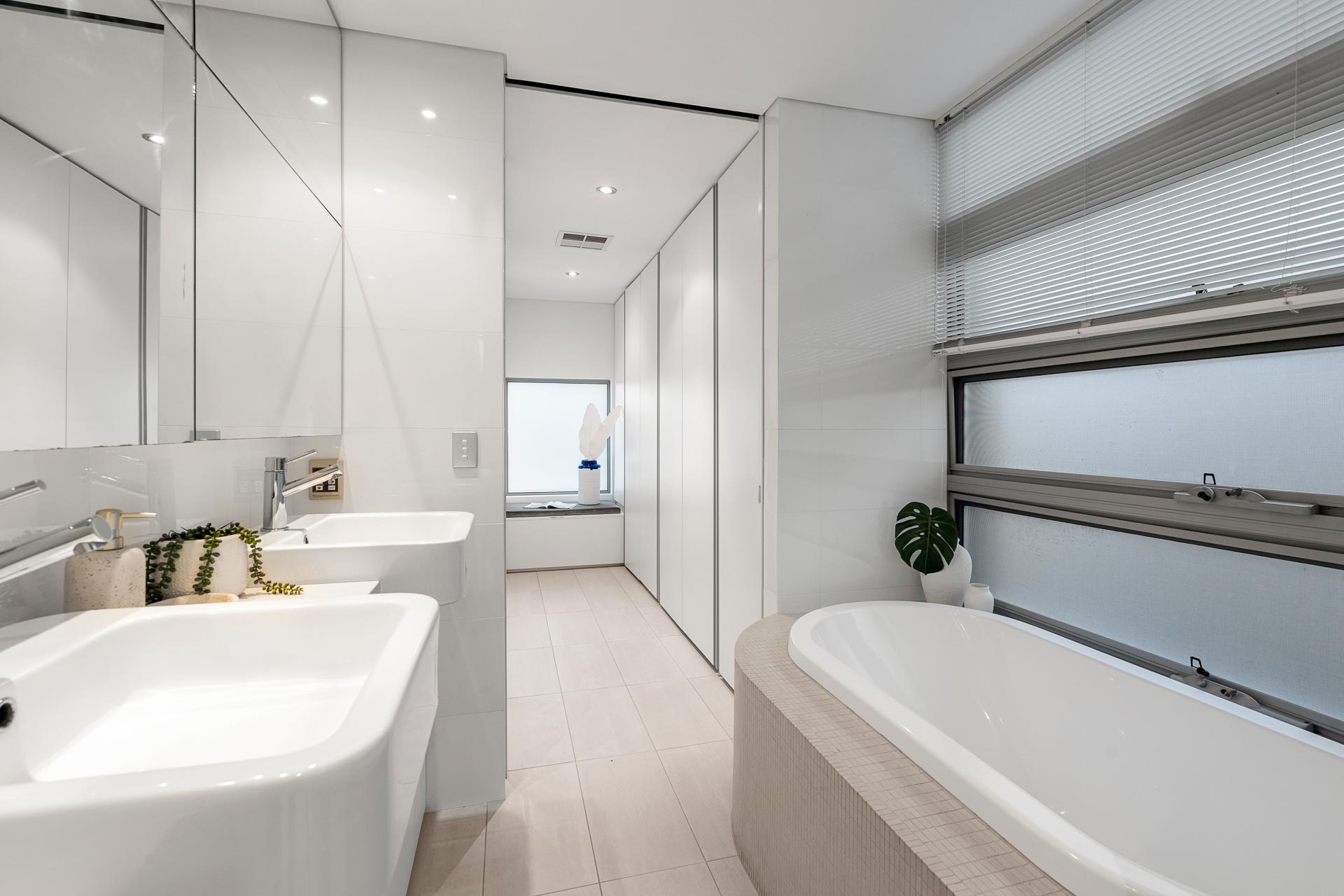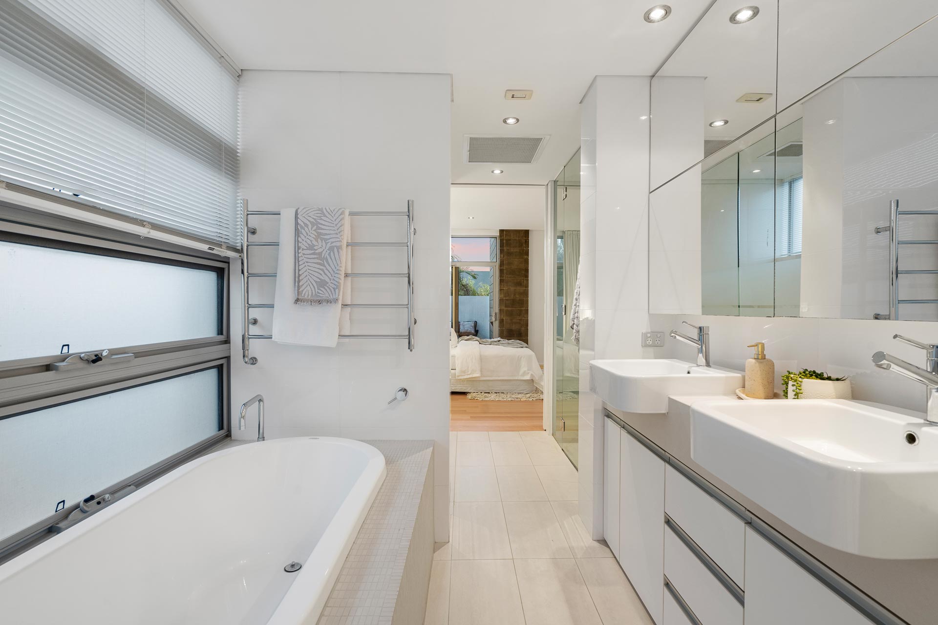 The superbly appointed master suite has a walk-in dressing room and a premium ensuite bathroom with built-in bath, floor to ceiling white tiles, pale stone benchtops and double sinks.