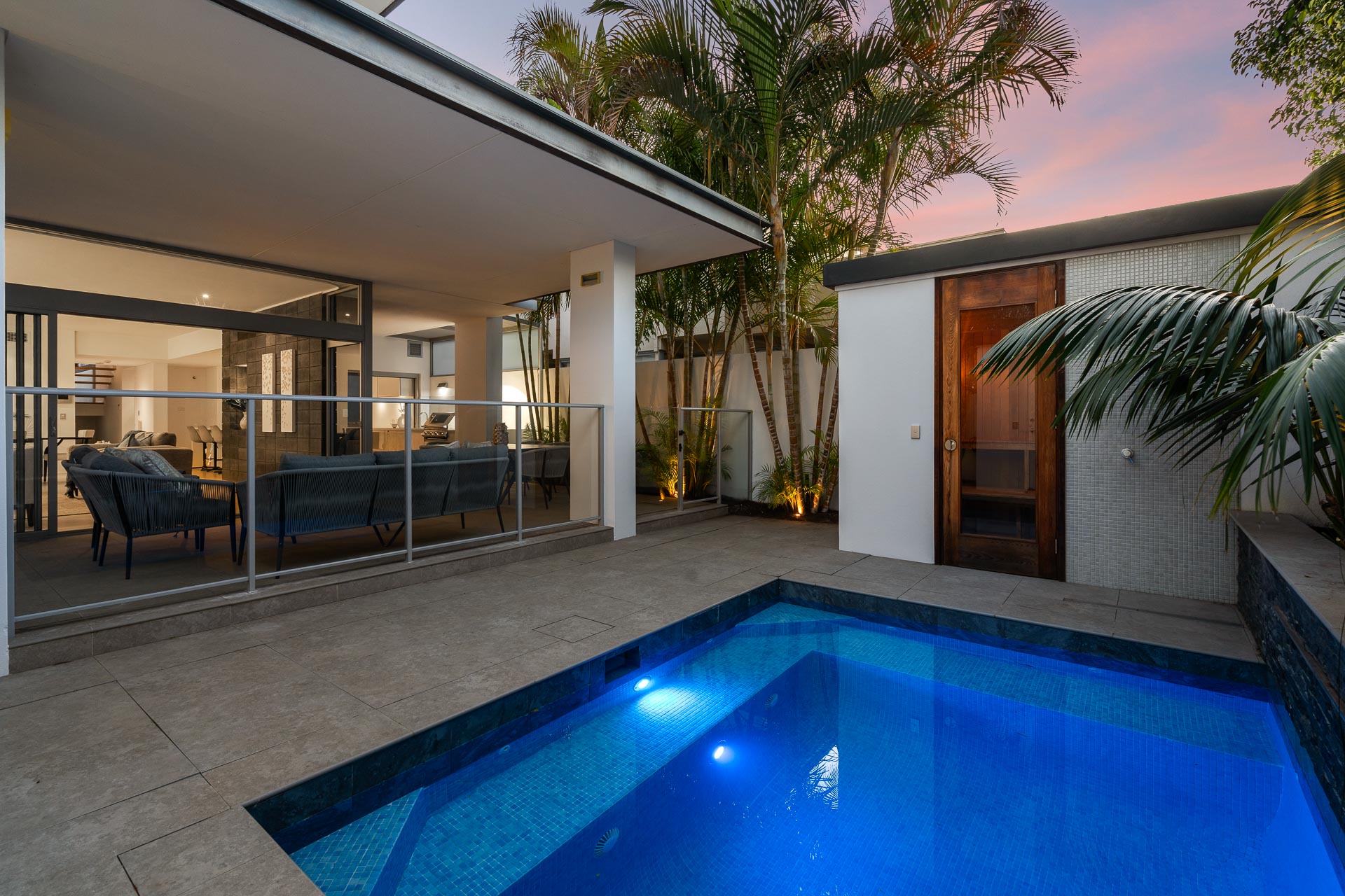 This flows on to a private undercover entertaining terrace overlooking a resort style plunge pool with frameless glass security fence and leisure area that comes complete with its own six-person, cedar lined sauna and separate toilet and shower.