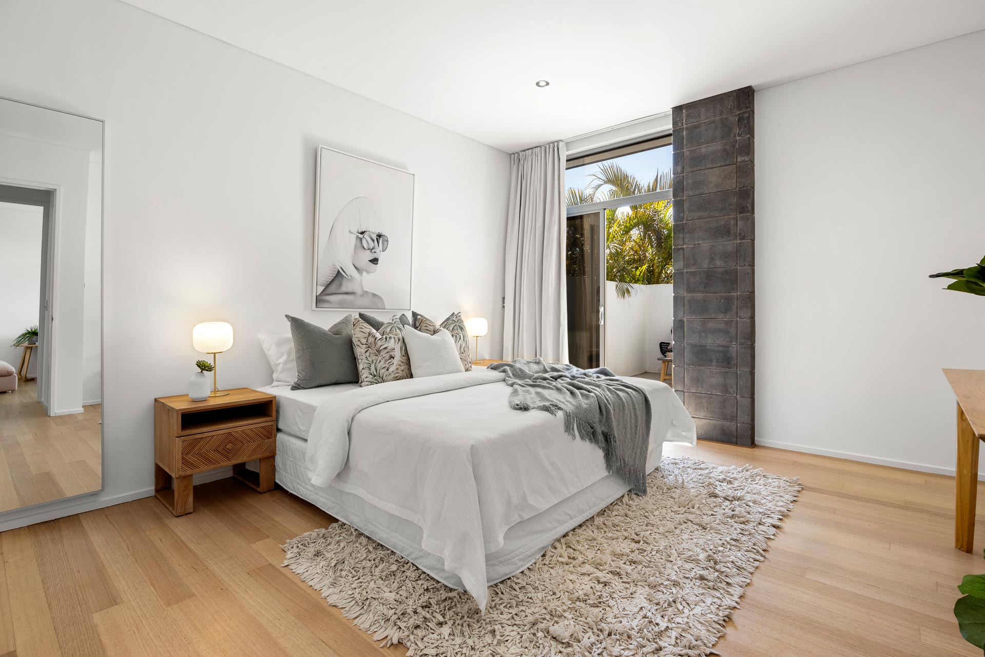 The first-floor mezzanine accommodates a generously sized bedroom with built in robes and roman blinds and access out to a street facing leafy terrace and an adjoining modern bathroom that reflects this home’s contemporary aesthetic. Perfect for guests or children alike.