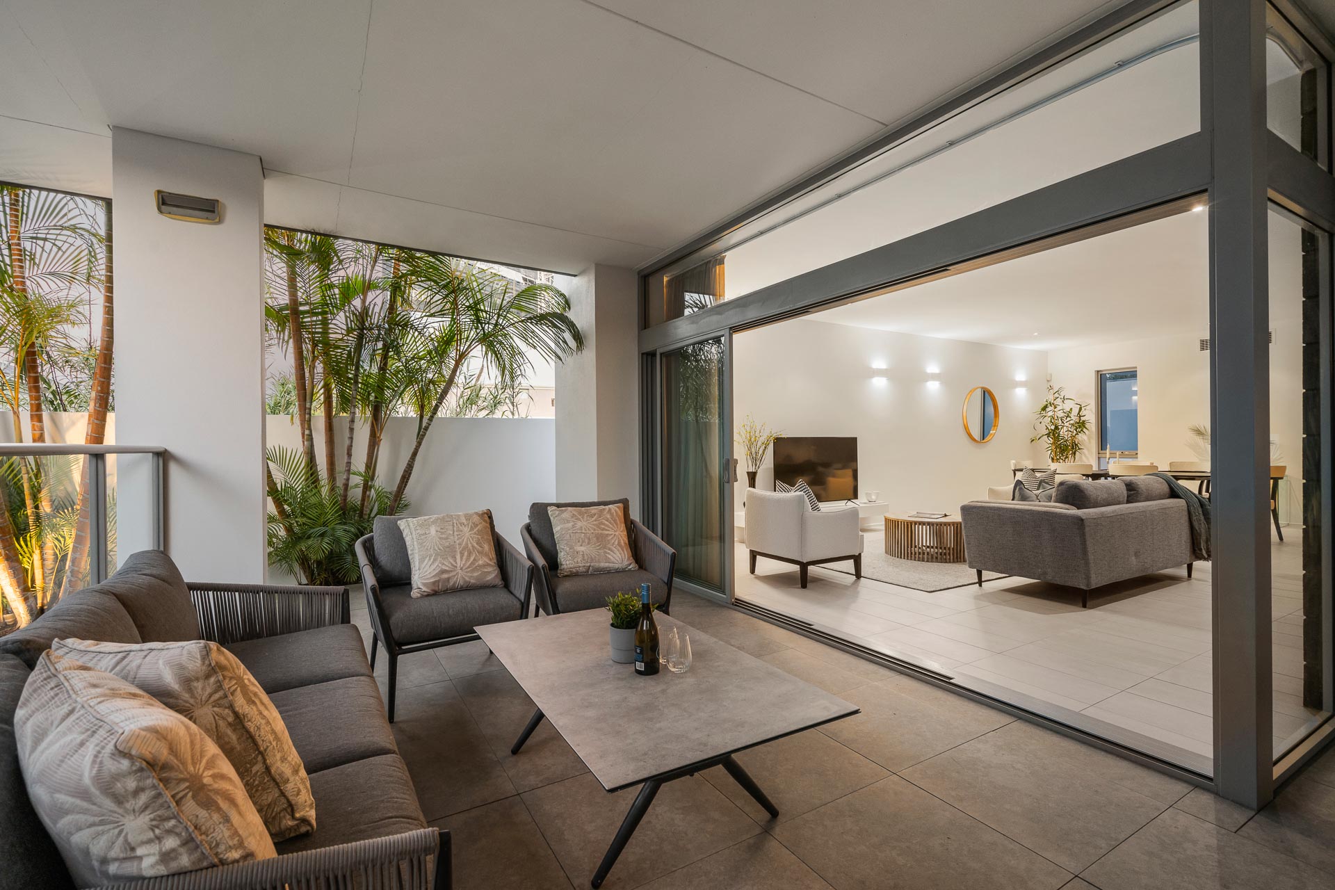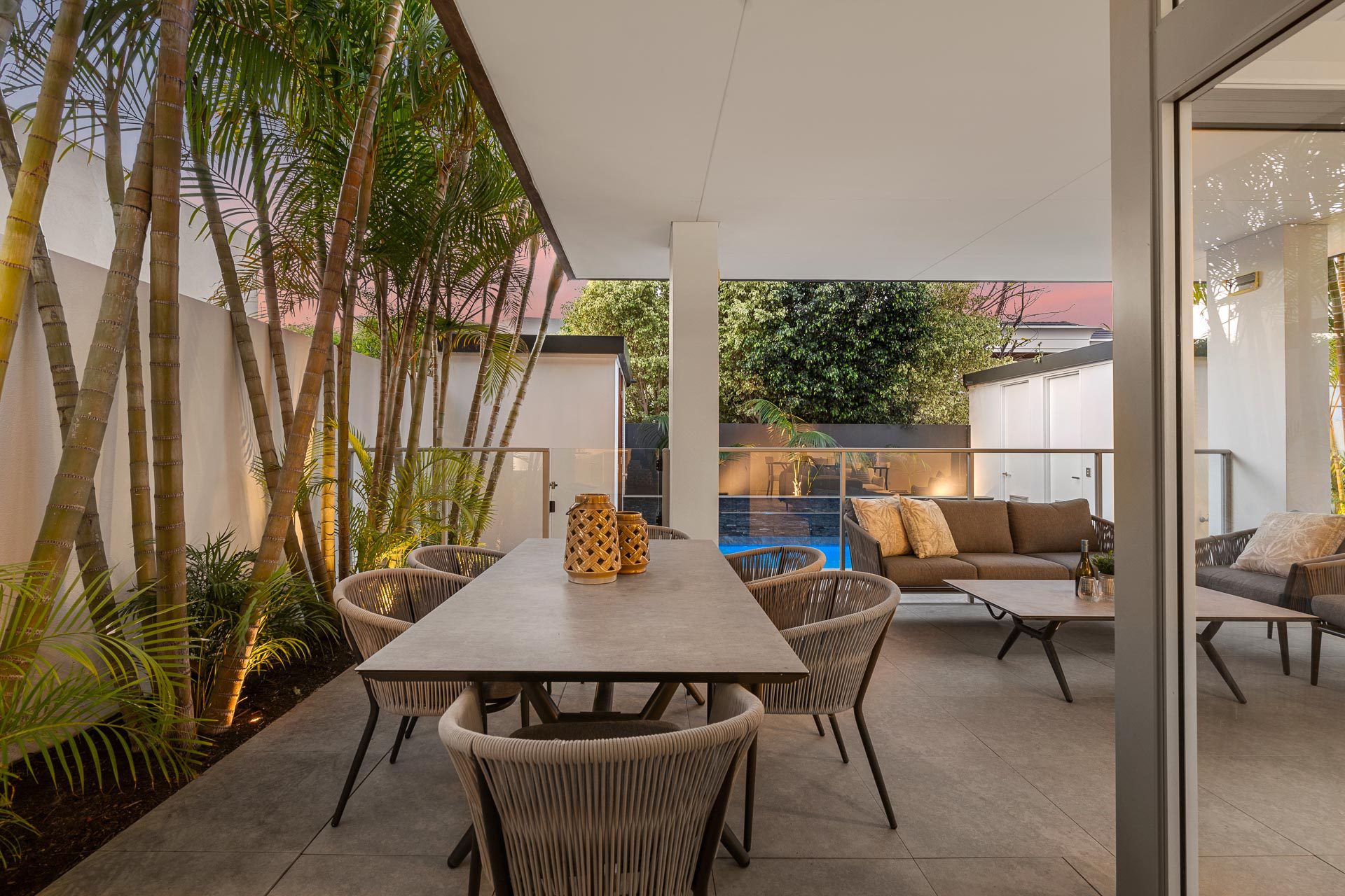 A stunning upper-level outdoor terrace with built-in kitchen with remote-control sun awning offers an alternate private, year-round outdoor space to relax and unwind amidst the neighbouring palms with distant views over the rooftops and trademark Applecross treescape beyond.