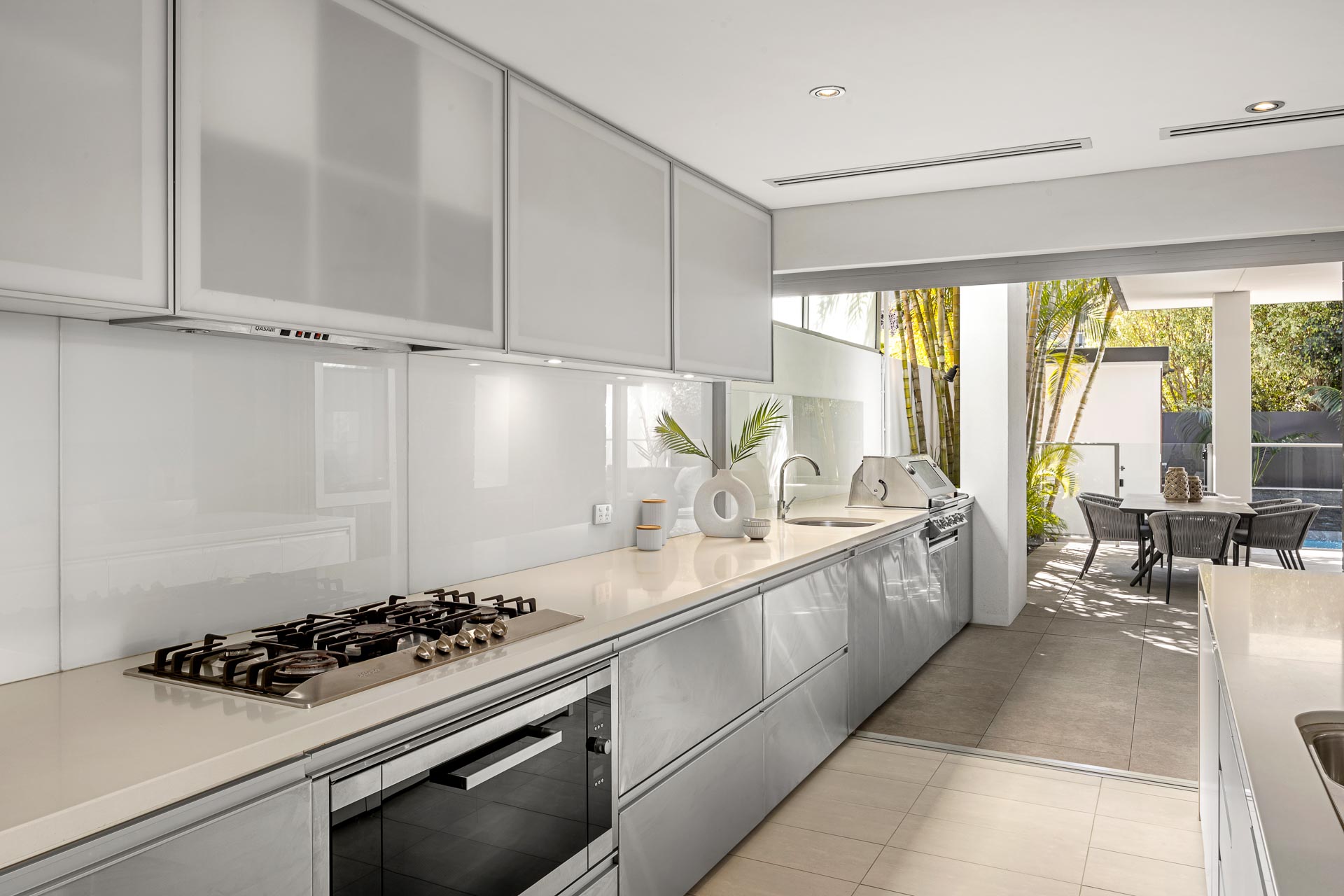 The chef’s kitchen has been thoughtfully designed as the focal point of the lower level living spaces and features expansive reconstituted stone benchtops, a large central island bench, ample above and below benchtop level cupboards, a Miele oven and five burner cooktop and a large walk in pantry for additional space-saving storage.