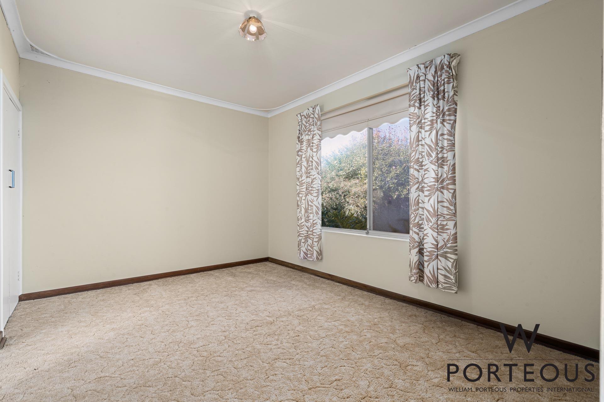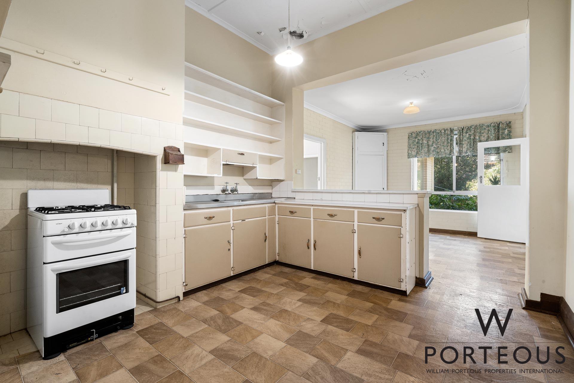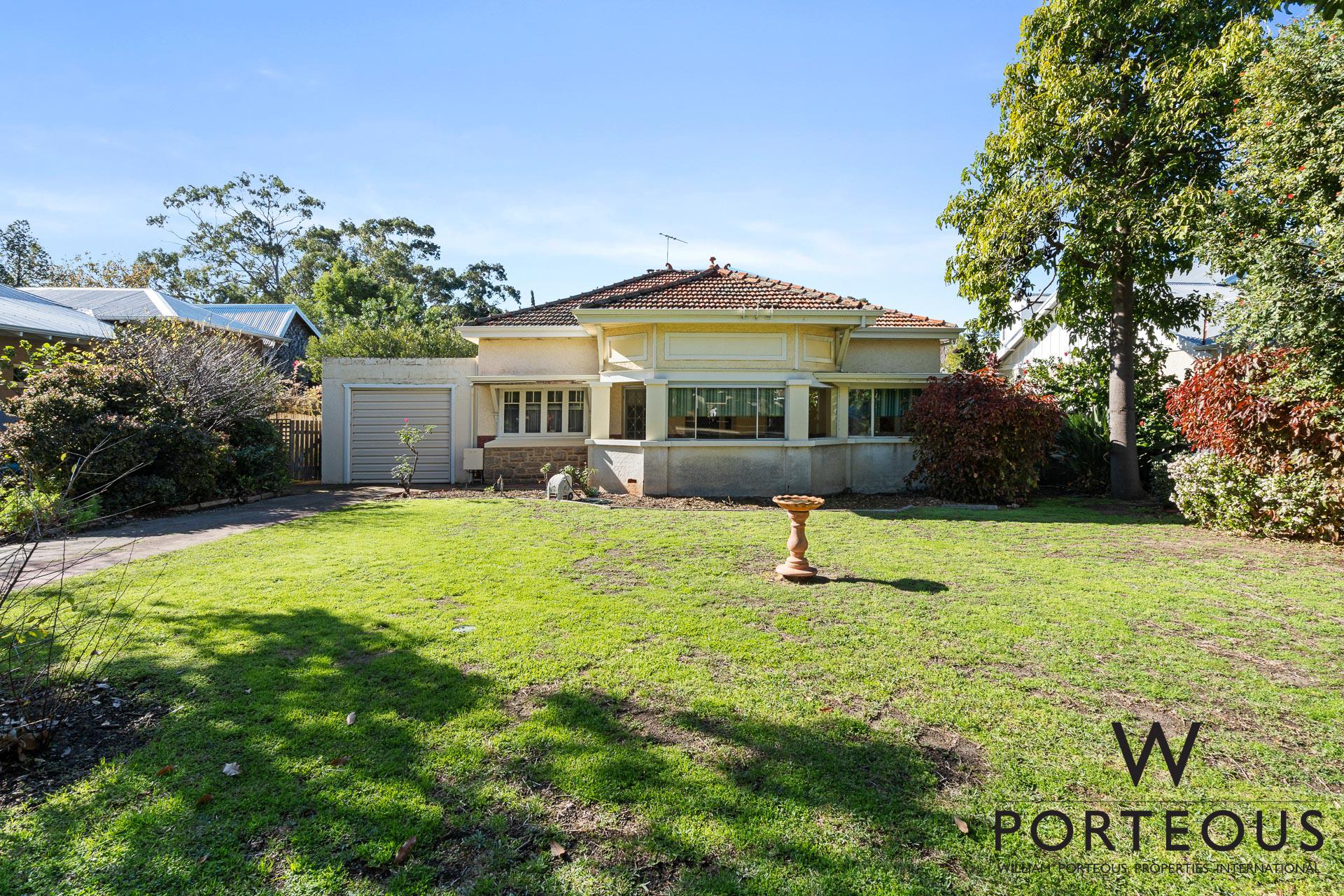 The near original 82-year-old character home is being sold “AS IS” and comprises 3 bedrooms and 2 bathrooms, plus an office or nursery, with an additional shower and WC in the laundry. The family lounge and main bedroom are located on either side of the entrance, and a second living/formal dining area features a brick fireplace with solid jarrah mantlepieces. The original kitchen overlooks the family meals area, with an outlook of the established rear gardens.