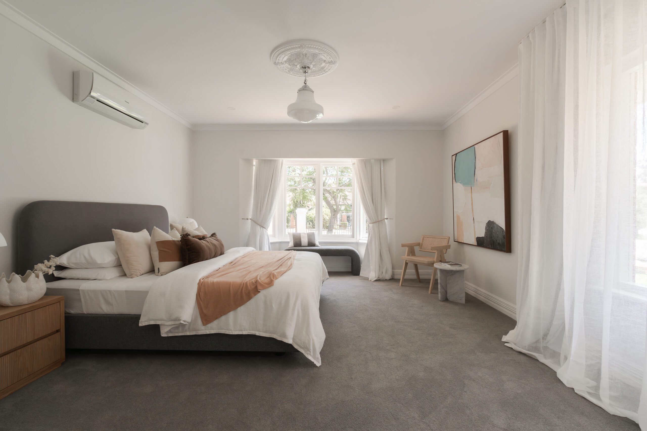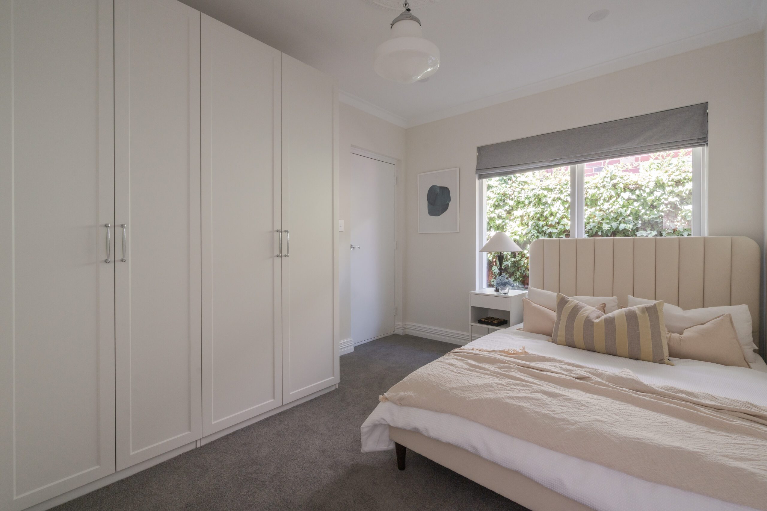 The sumptuous, more-than-king-sized main bedroom suite enjoys a bay-window outlook to the front garden, walk-in and built-in robes, and a skylit Edwardian-style ensuite featuring a marble-topped dual vanity, gooseneck rain shower, and separate WC.