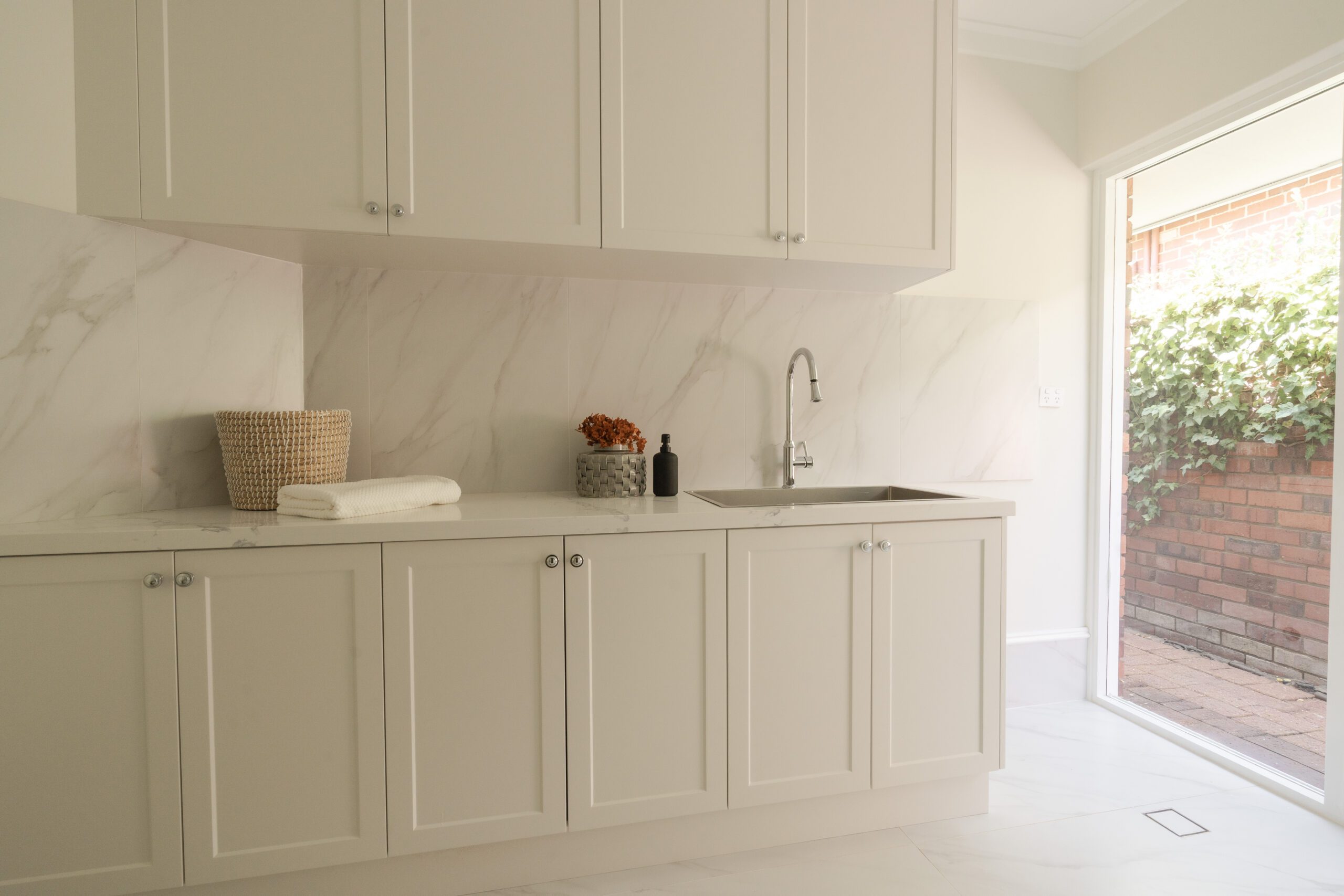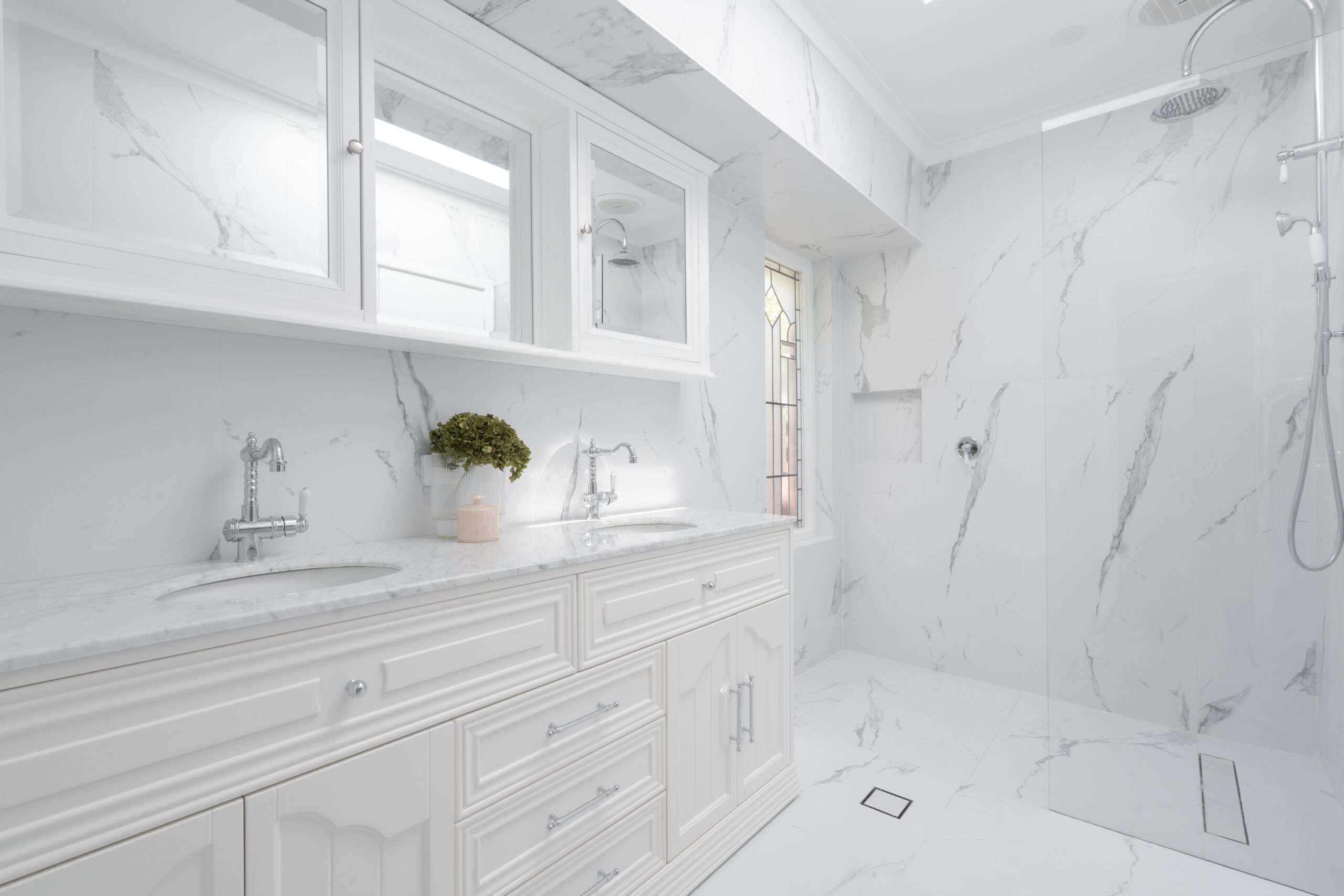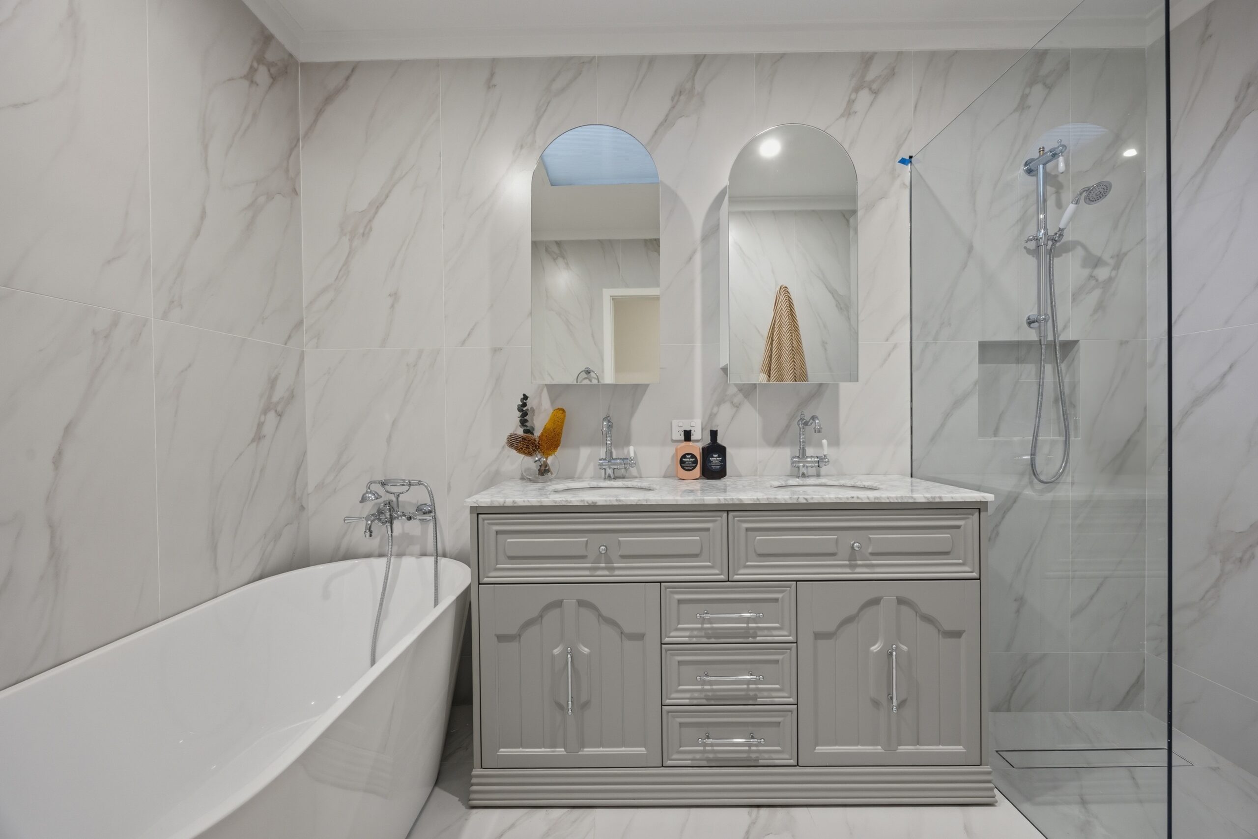Paying homage to the area’s storied past, the interiors reveal a timeless palette of soft whites and layered greys, showcasing ornate detailing from rosetted ceilings to leadlight glass and polished chrome hardware. Blackbutt engineered timber floors span the sun-filled ground floor, while Carrara-patterned tiles feature in the wet areas. Expanses of glass create a light and airy feeling at every turn.