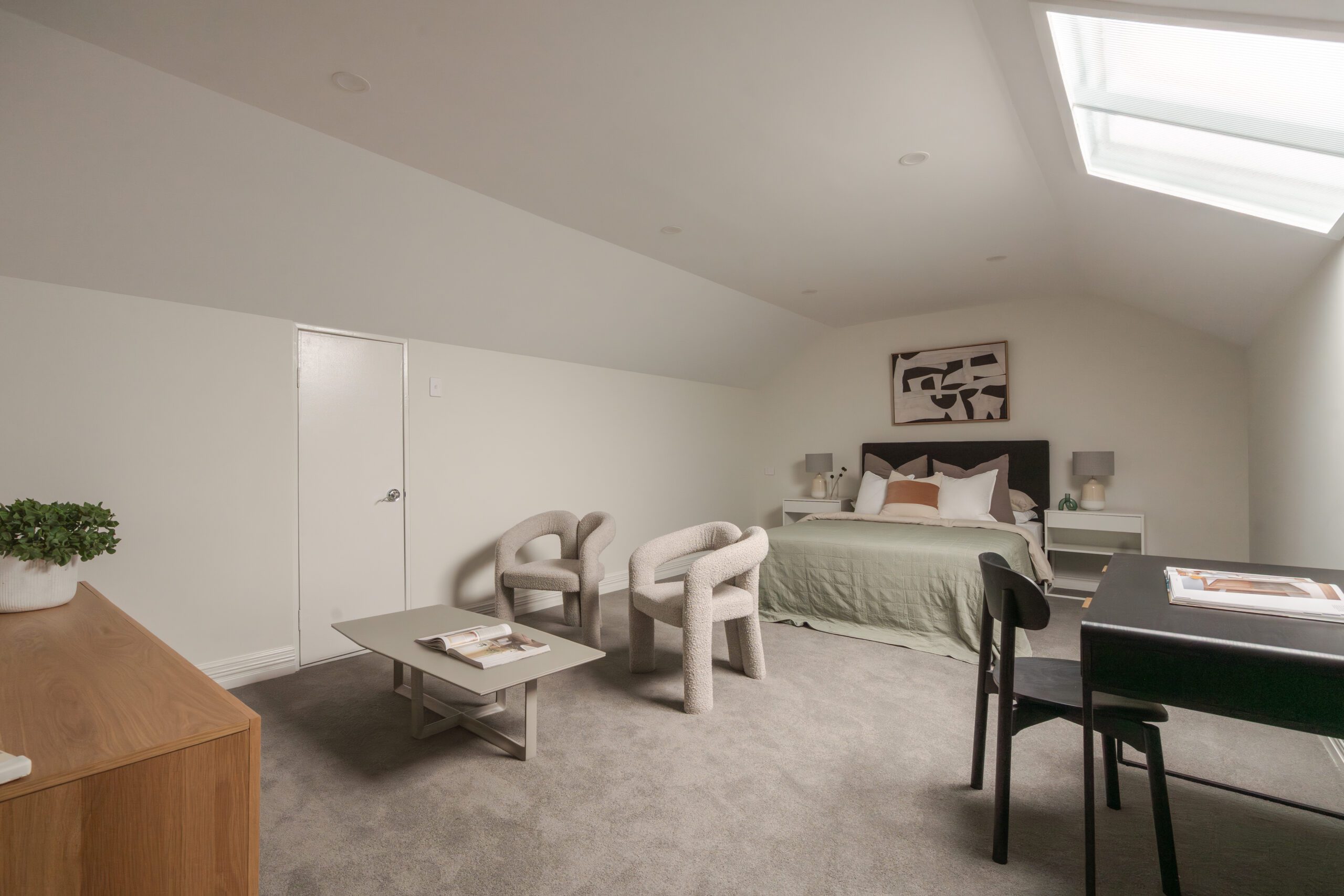 Above the large garage is a loft retreat, accessed via a generous staircase that links it to the rest of the home. This large multi-purpose room is currently configured as a sixth bedroom, though it would also make an outstanding additional lounge, media room, or games room-ideal for both children and adults. Extensive roof storage on either side adds everyday practicality, while a skylight above ties in with the home’s light-filled aesthetic.