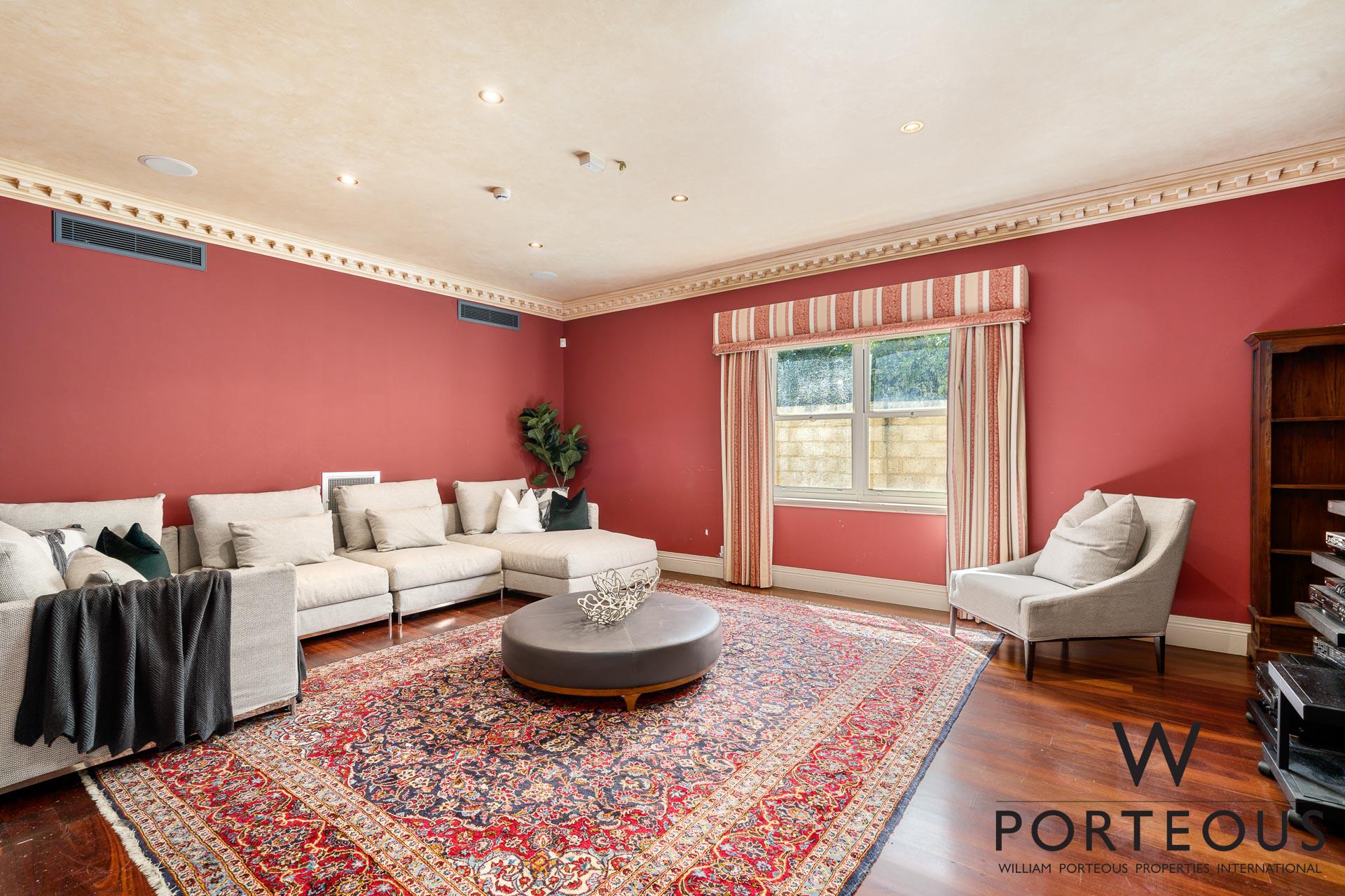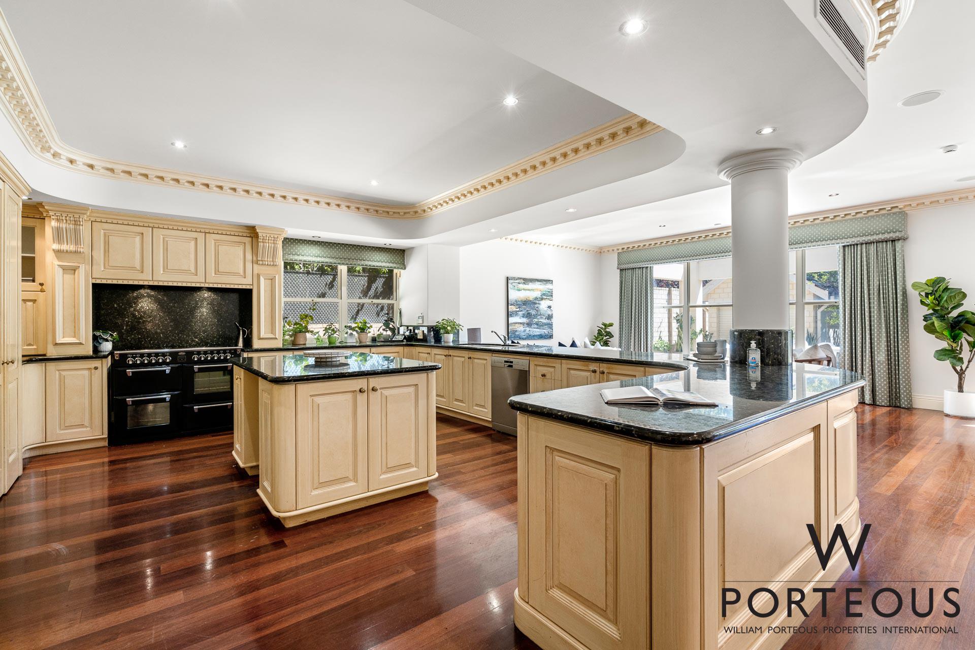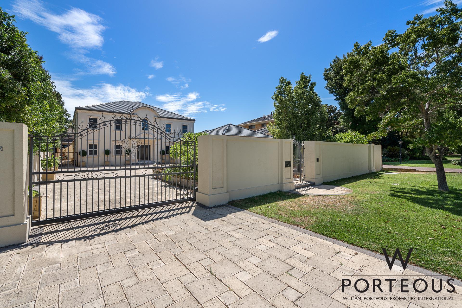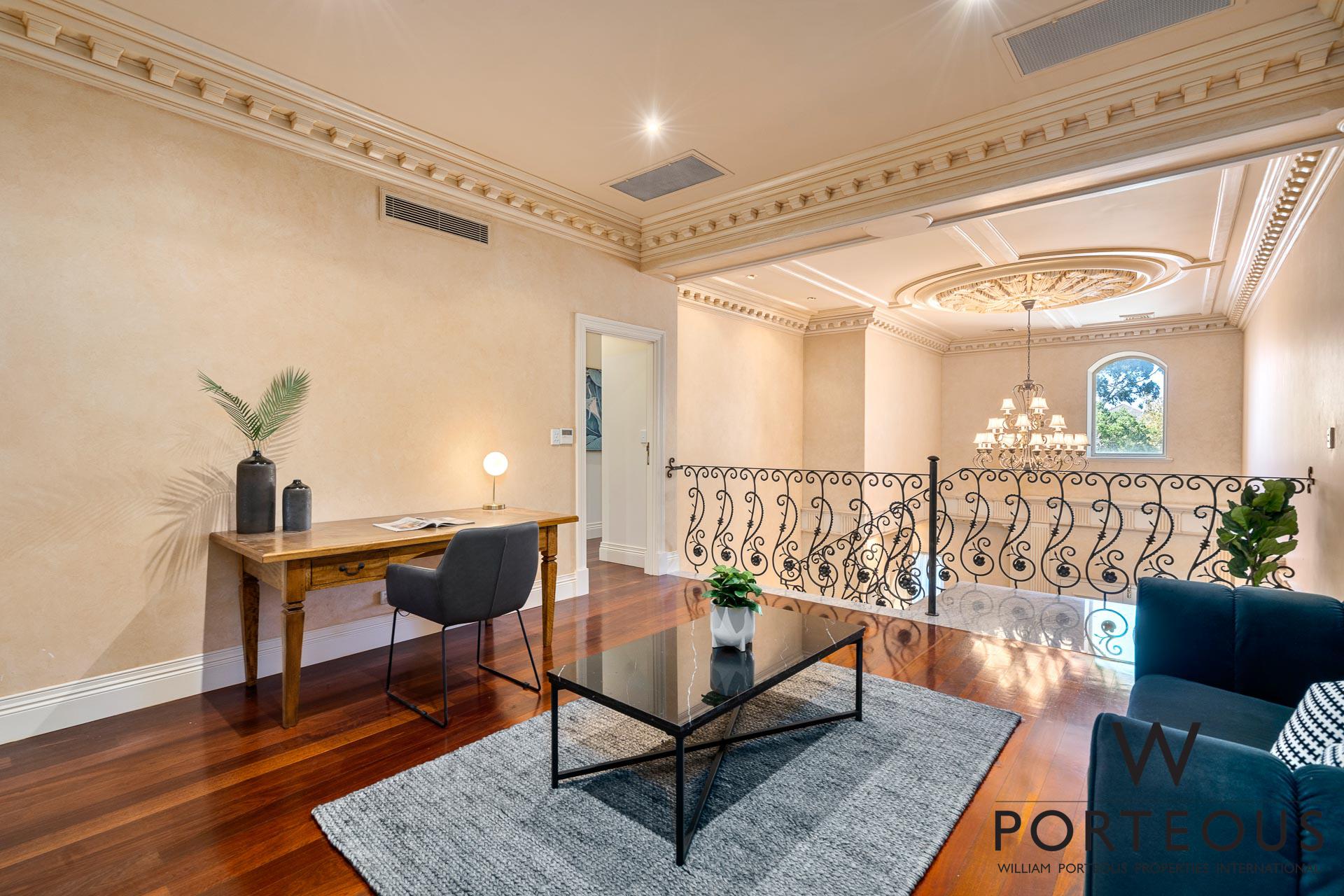 In the ever popular northwest quadrant of Dalkeith, close to the river, parks, schools and shopping, this is an ideal, large, generous family home. Bespoke in every way, no expense was spared in its creation in 2002. Fully fenced and behind a secure electronic gate, the forecourt is generous and provides access into the spacious secure 4 car lock up garage, which in turn opens directly into the house. Stepping through the front door into the grand foyer, you are greeted by a towering 6.1m ceiling with ornate detailing, a spectacular chandelier, gleaming solid Jarrah floorboards and a beautiful staircase leading up the second floor. To the left of the entry, we have one of the many remarkable rooms. It is a grand ballroom, with an ornate 6m ceiling that includes spectacular ceiling roses for the two chandeliers. The Jarrah flooring continues through this room, and we have large windows welcoming in natural light and air flow. This is a room that was made for entertaining. Fantastic as a formal lounge and dining space, or keep it for hosting events and parties. We can confidently say there is no other home in the area that boasts such a remarkable feature.