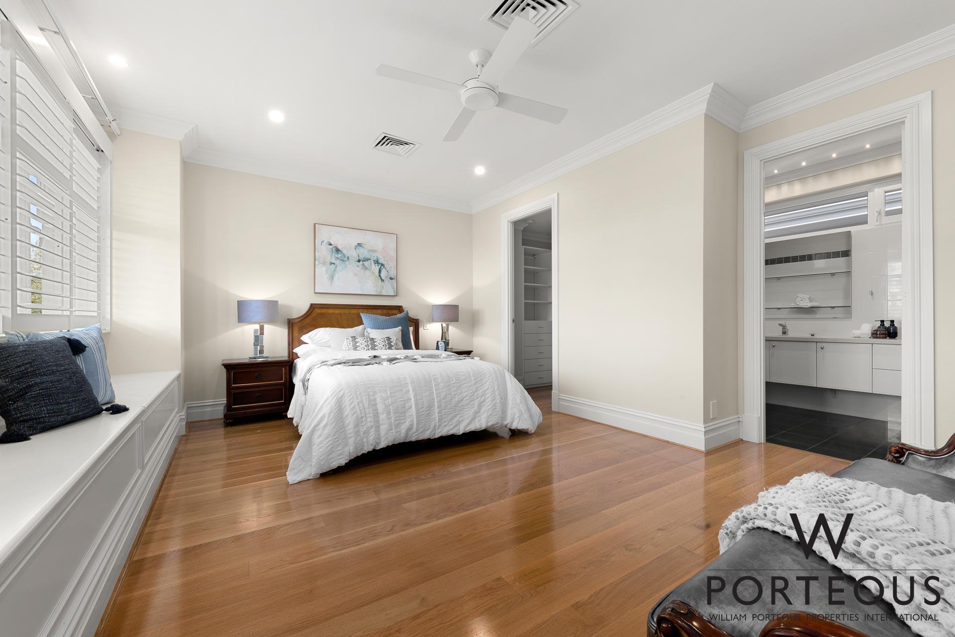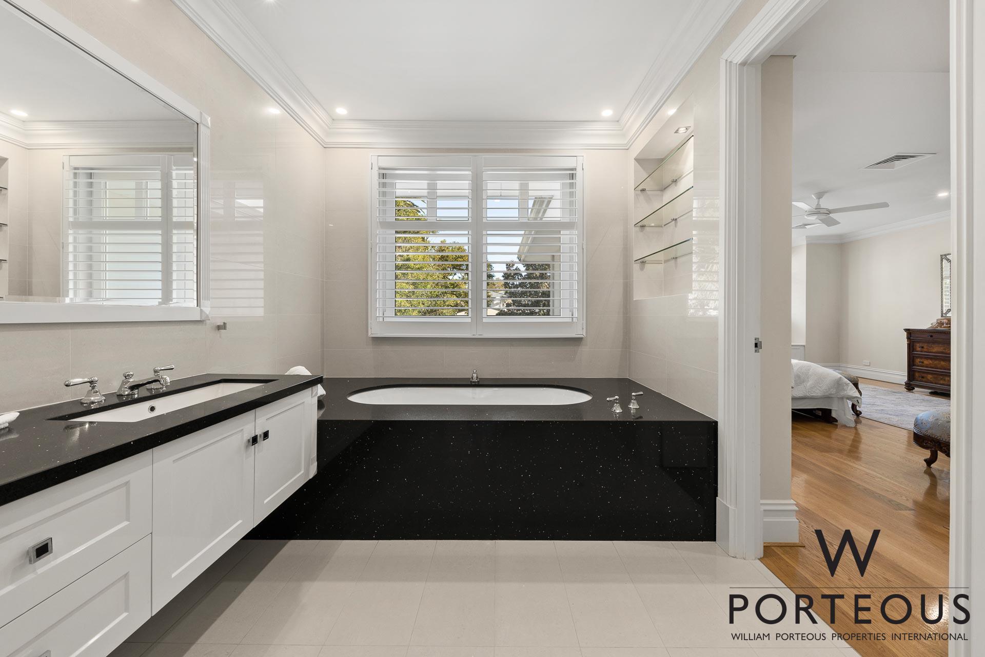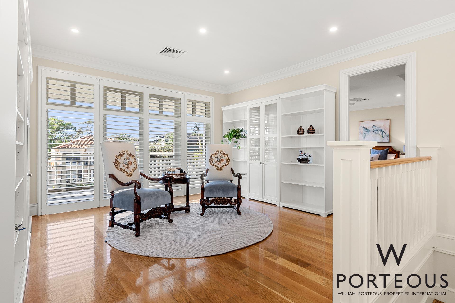 Upstairs, a sitting room opens out to the expansive tiled balcony, with classic white timber balustrading and ceiling. Two elegant, king-sized guest bedrooms feature private ensuites, customised walk-in robes and window seats overlooking the manicured front gardens and Waratah Avenue streetscape. The premium double glazing throughout gives great thermal and sound insulation.
