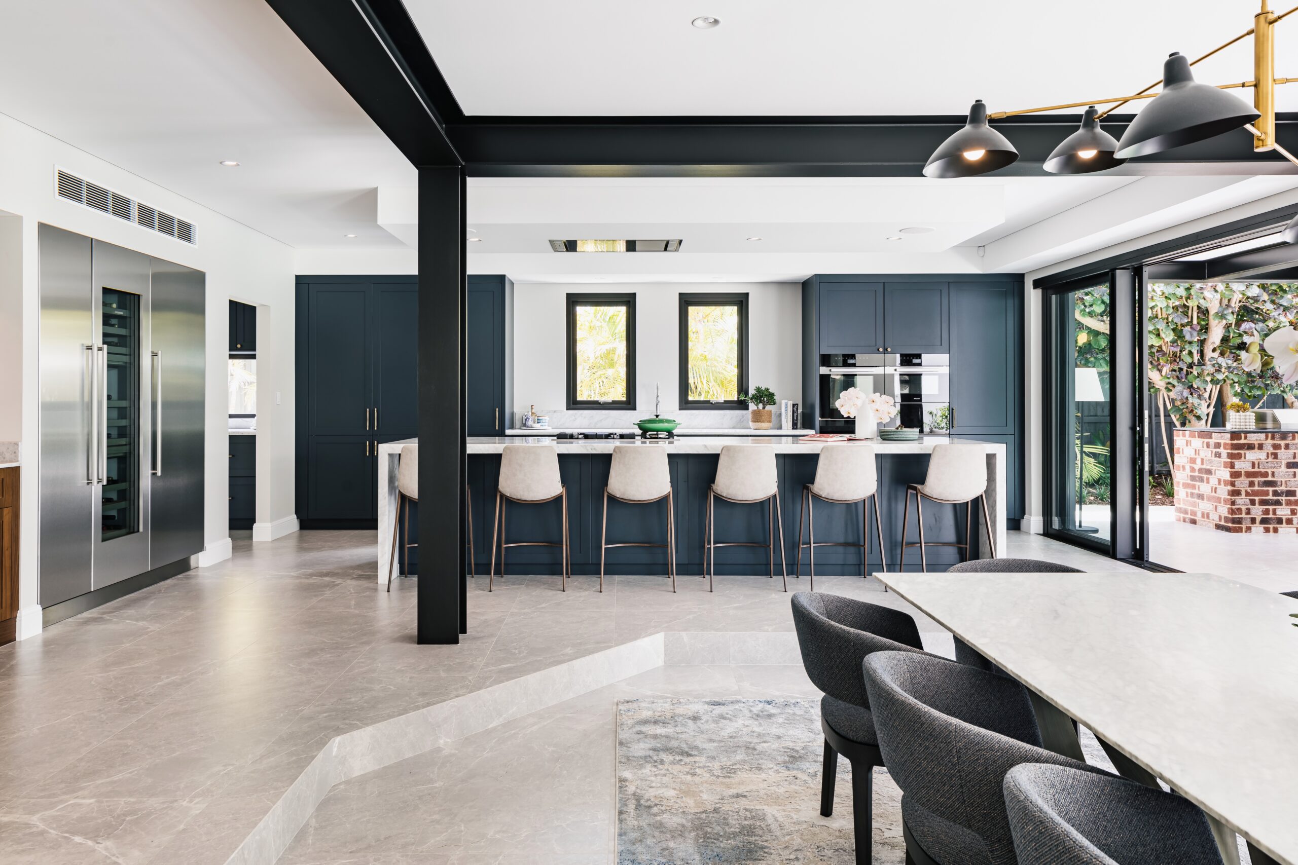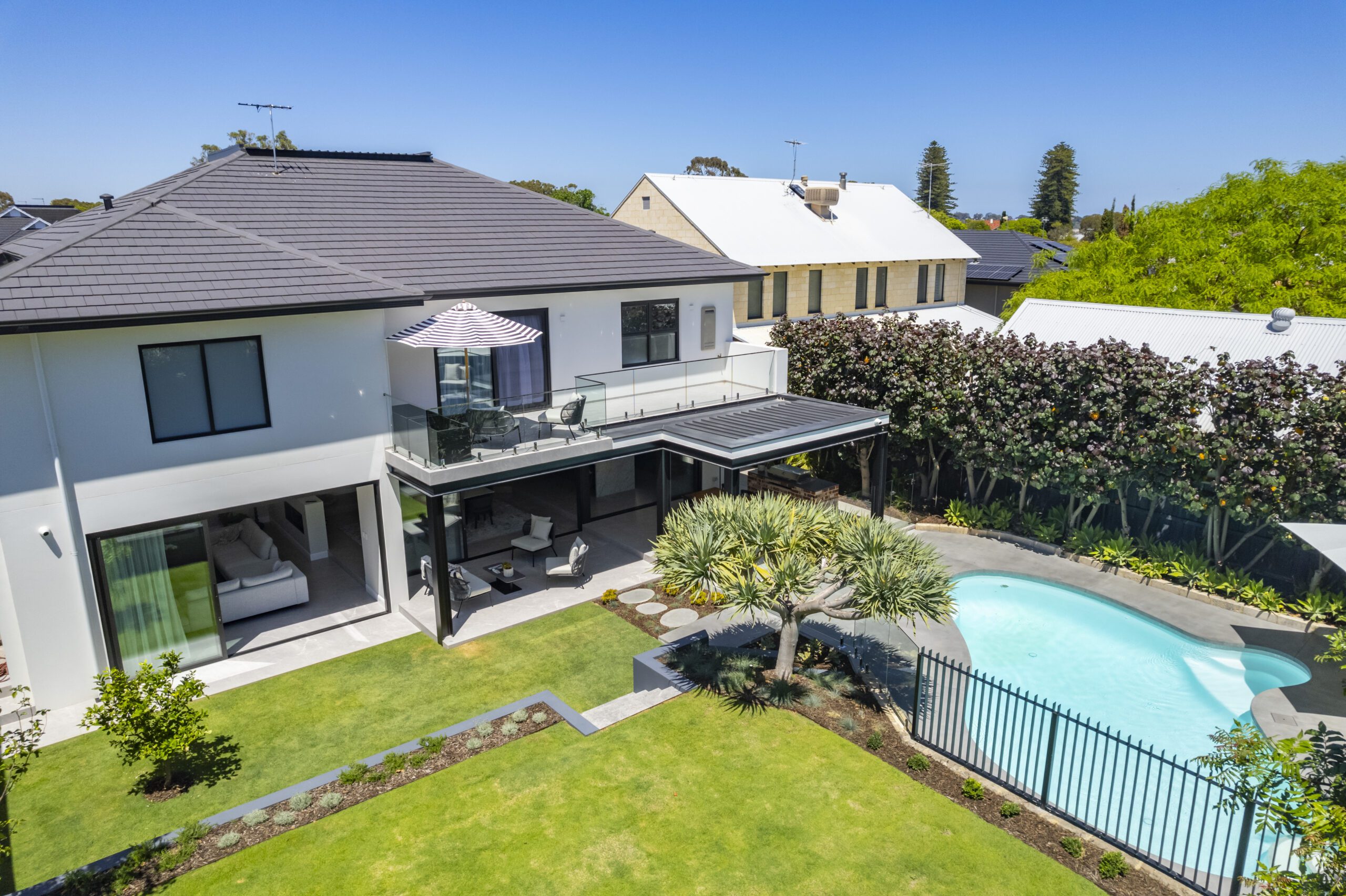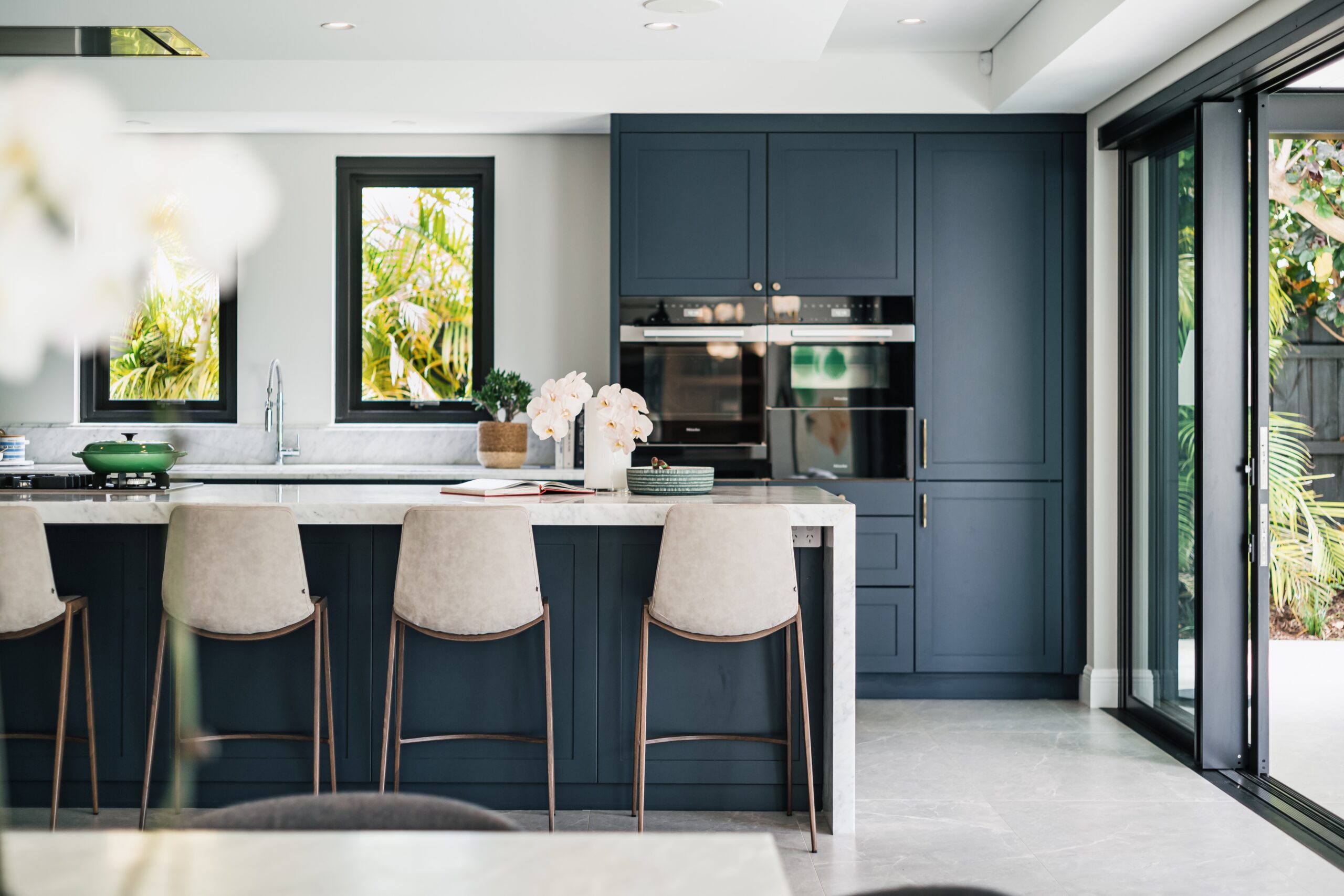 The kitchen opens to the alfresco, our door dining, living and BBQ area that in turn overlooks the sparkling crystal white in-ground pool with formed architectural grey concrete and glass fencing, lawns and garden. This whole zone is a space for cooking, entertaining friends and family, and living your best life.
