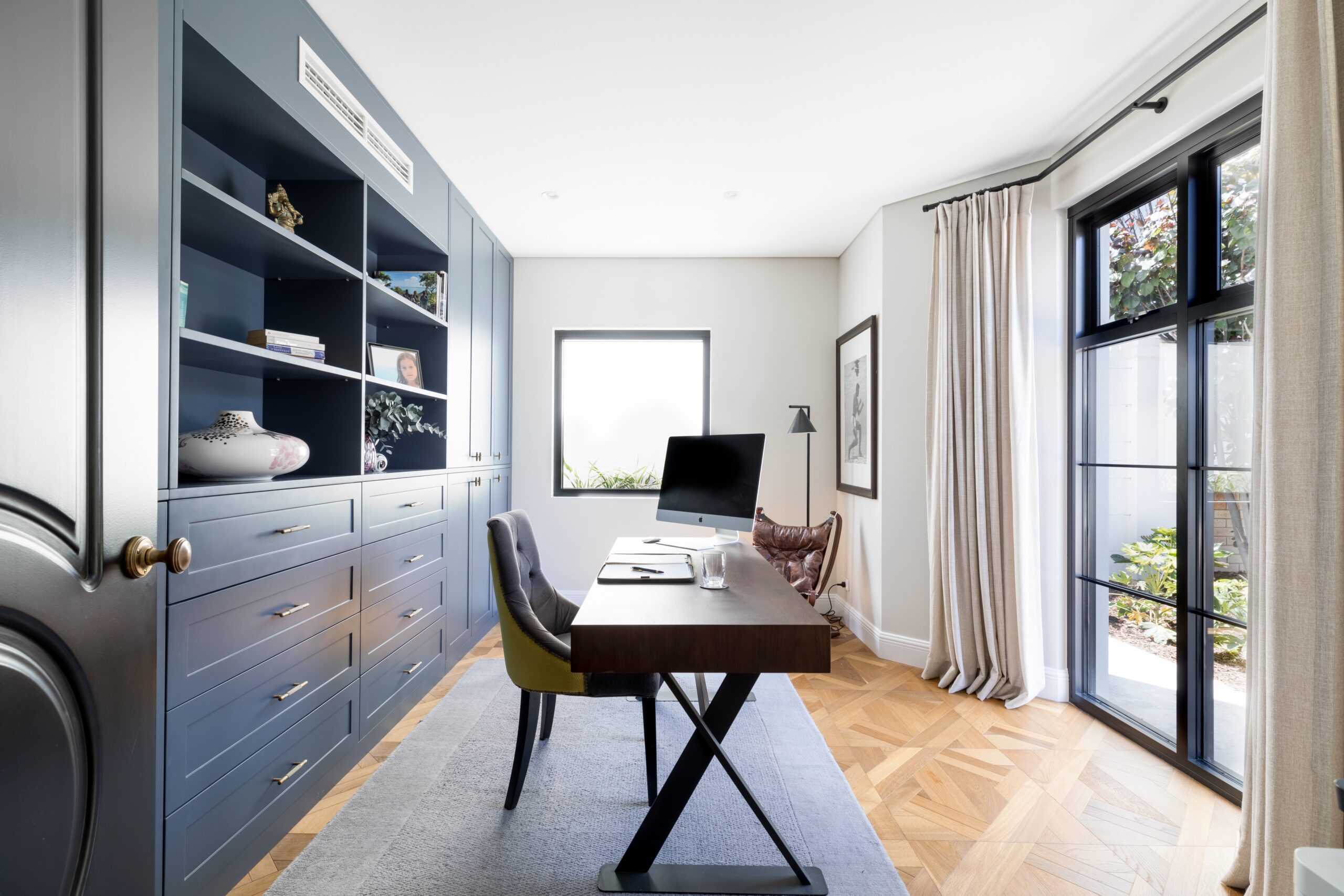 To the right is a home office, ideal for quiet focused work, meetings or phone calls without disturbing the rest of the home. This room has a full wall of bespoke cabinetry, with flowing linen curtains and dual aspect windows giving a view to the gardens and an abundance of natural light.
