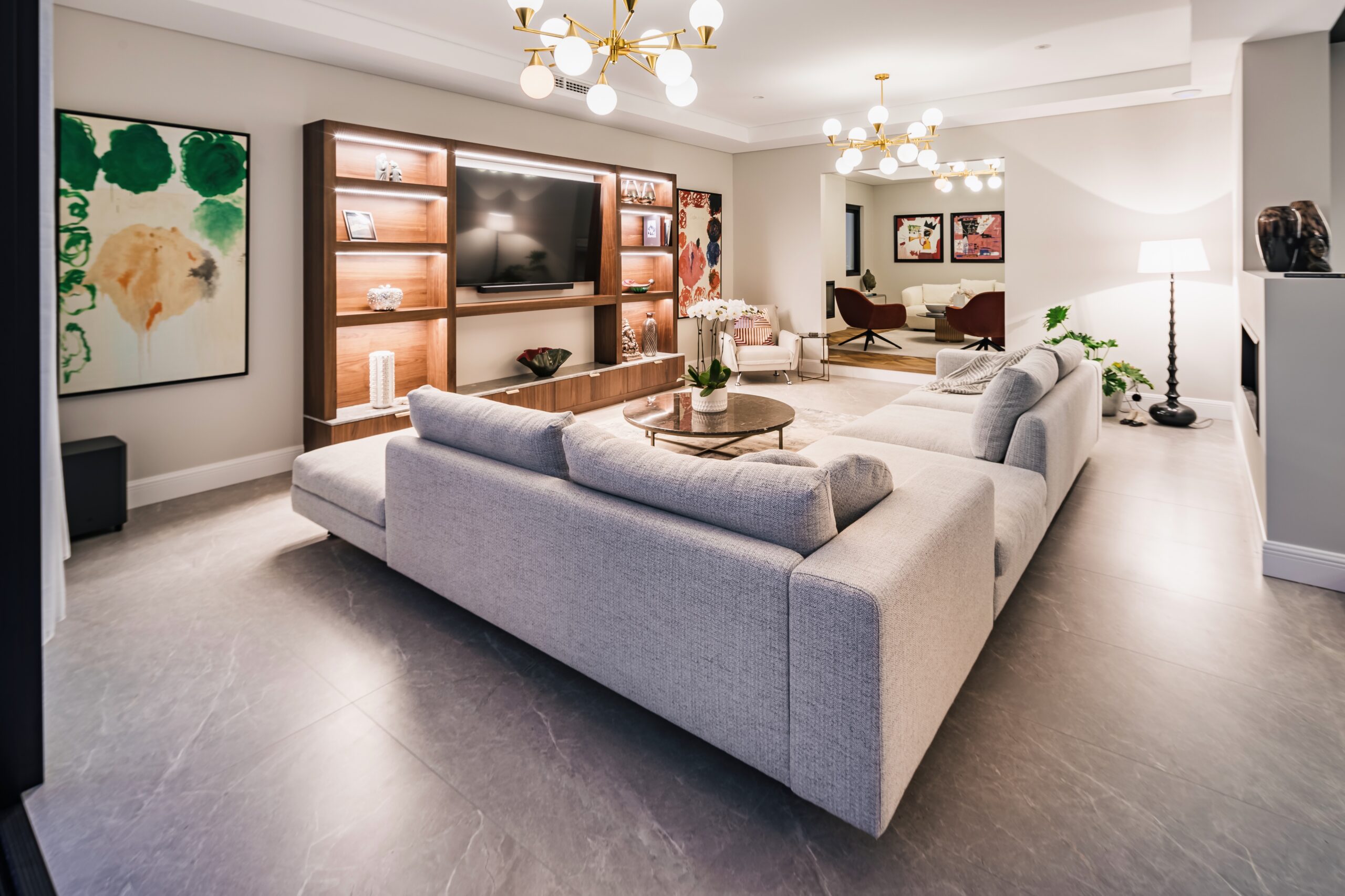 To the left is a front lounge or media room, with full cinema surround sound, ideal as a separate zone for kids to play but not too removed from the main open plan living dining and lounges that feature across the north facing side of the home on the ground floor.