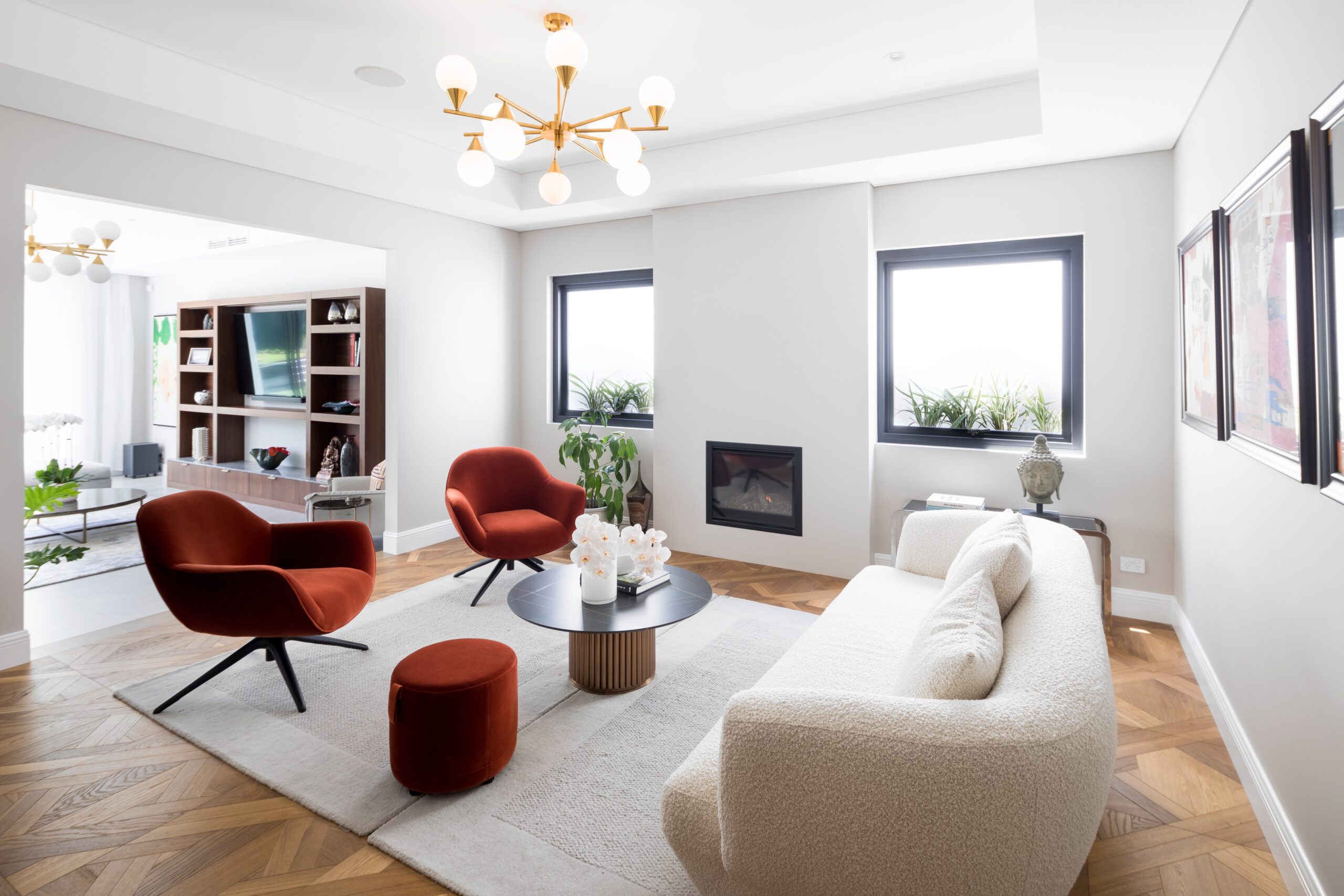 The home features a dedicated sitting room, designed as a separate area for social gatherings, talking, reading or enjoying a quiet drink, with picture windows and an Escea gas fireplace for instant warmth and atmosphere in the winter months.