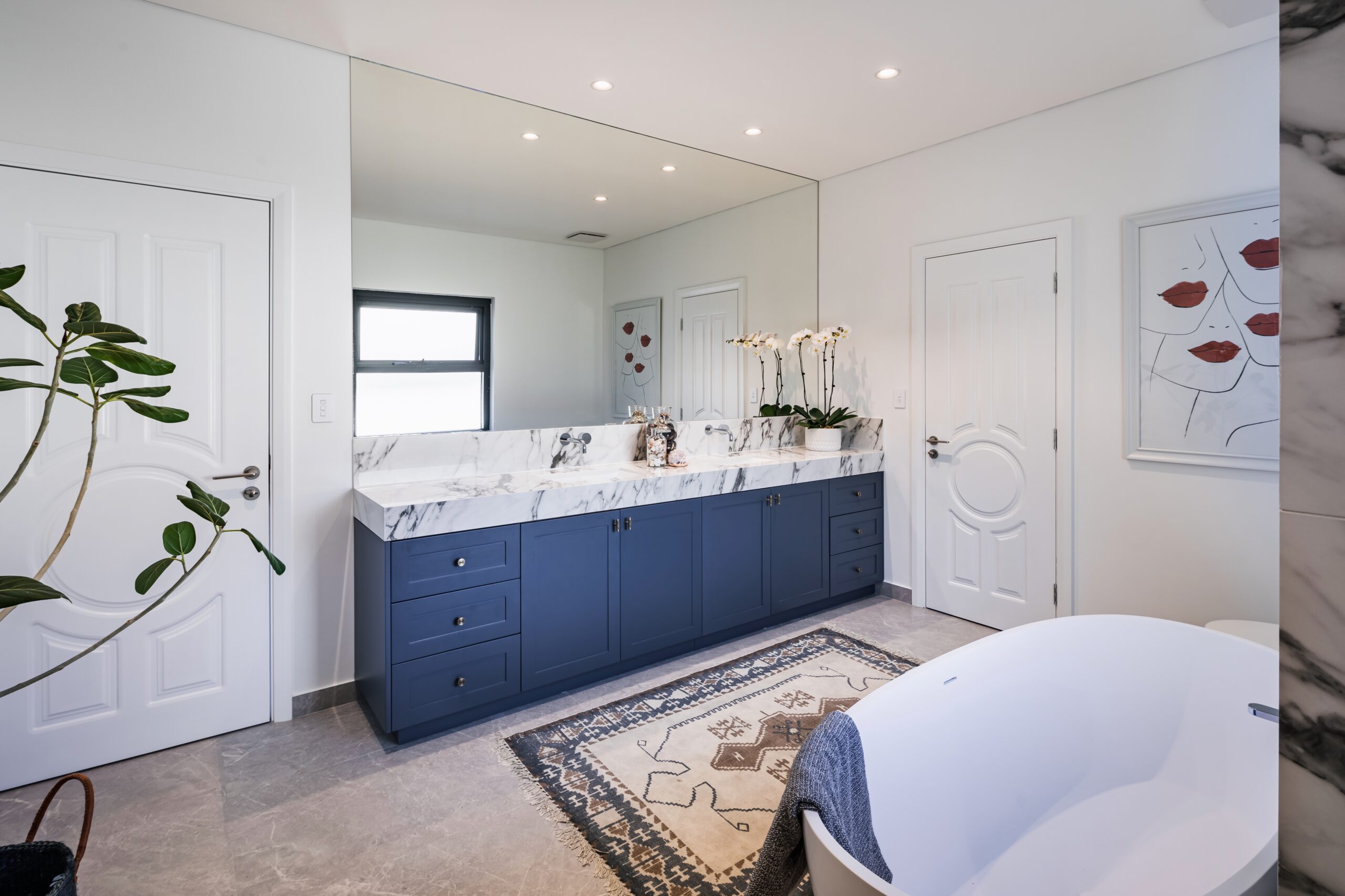 Upstairs there are 5 king-size bedrooms, 4 of them ensuited plus an epic family bathroom with double rainhead shower in veined porcelain slab, a free-standing stone bath and double vanity.
