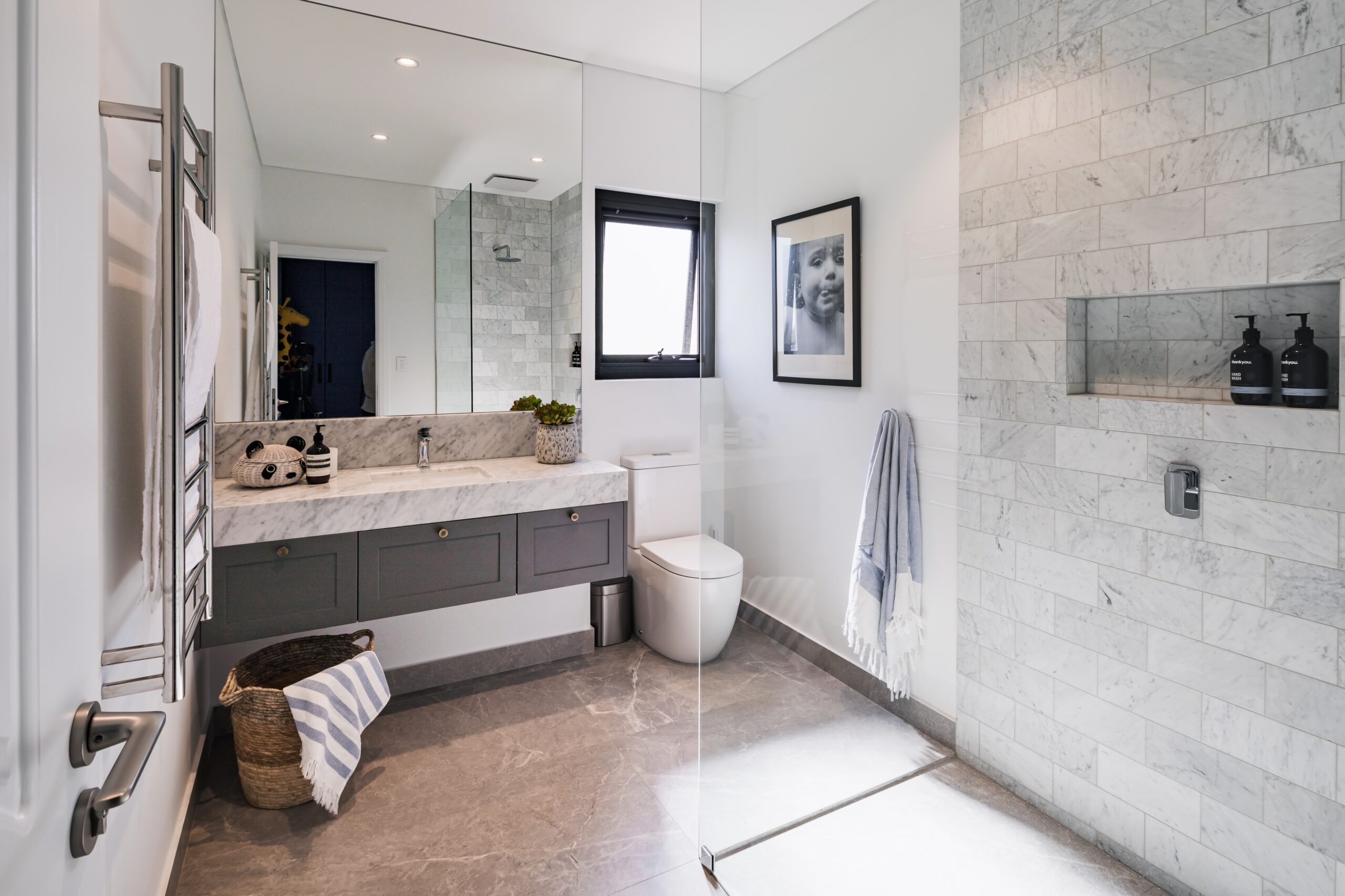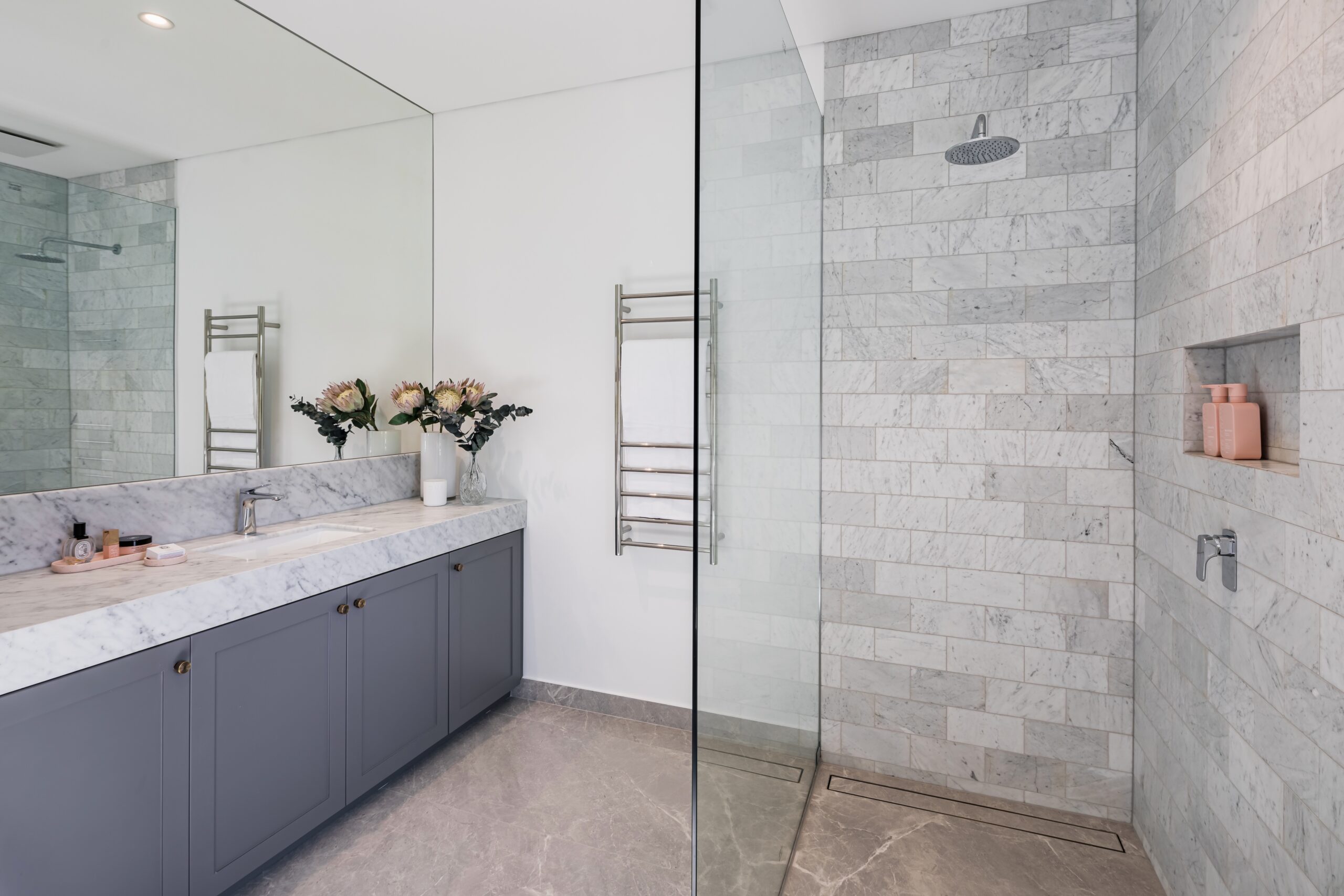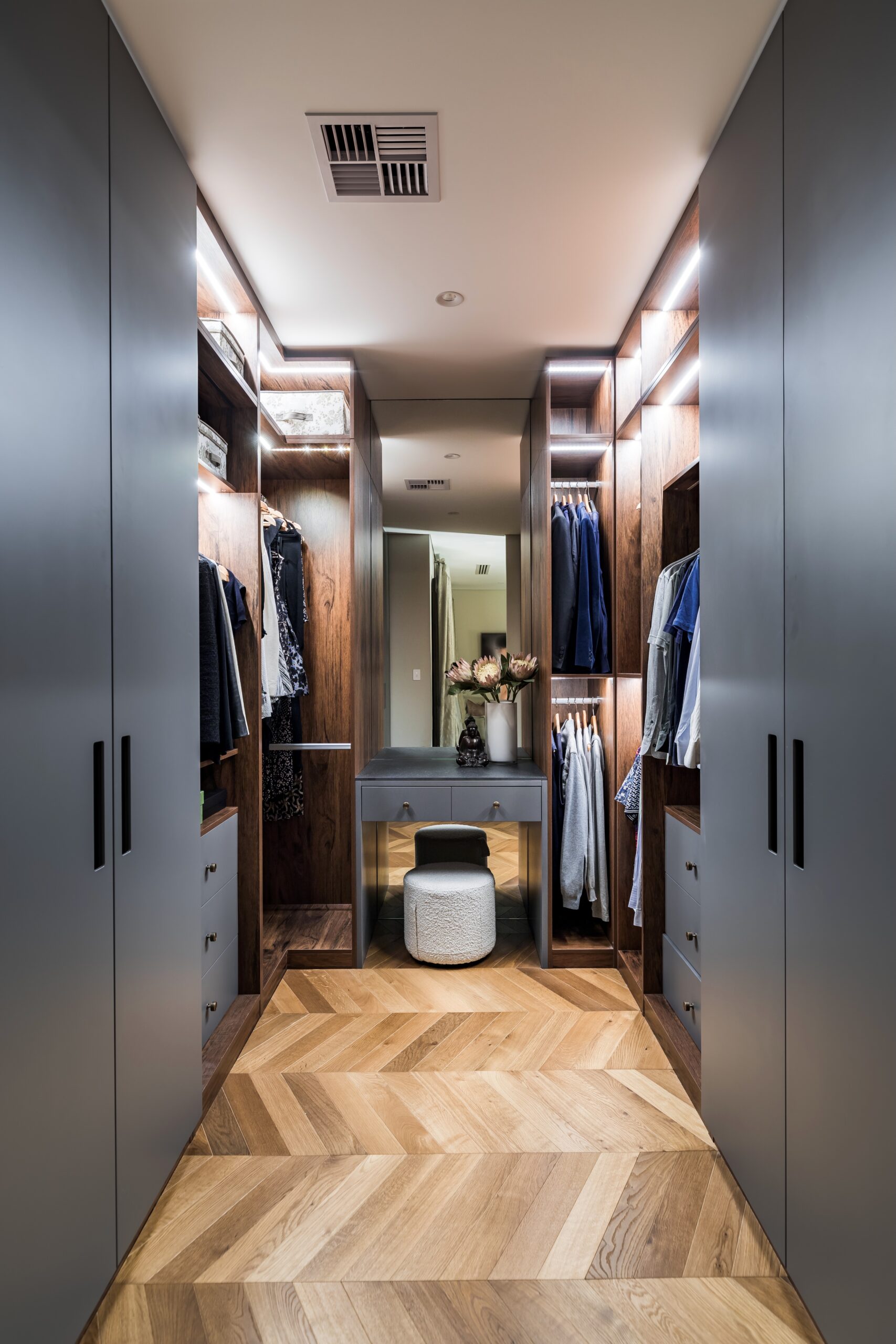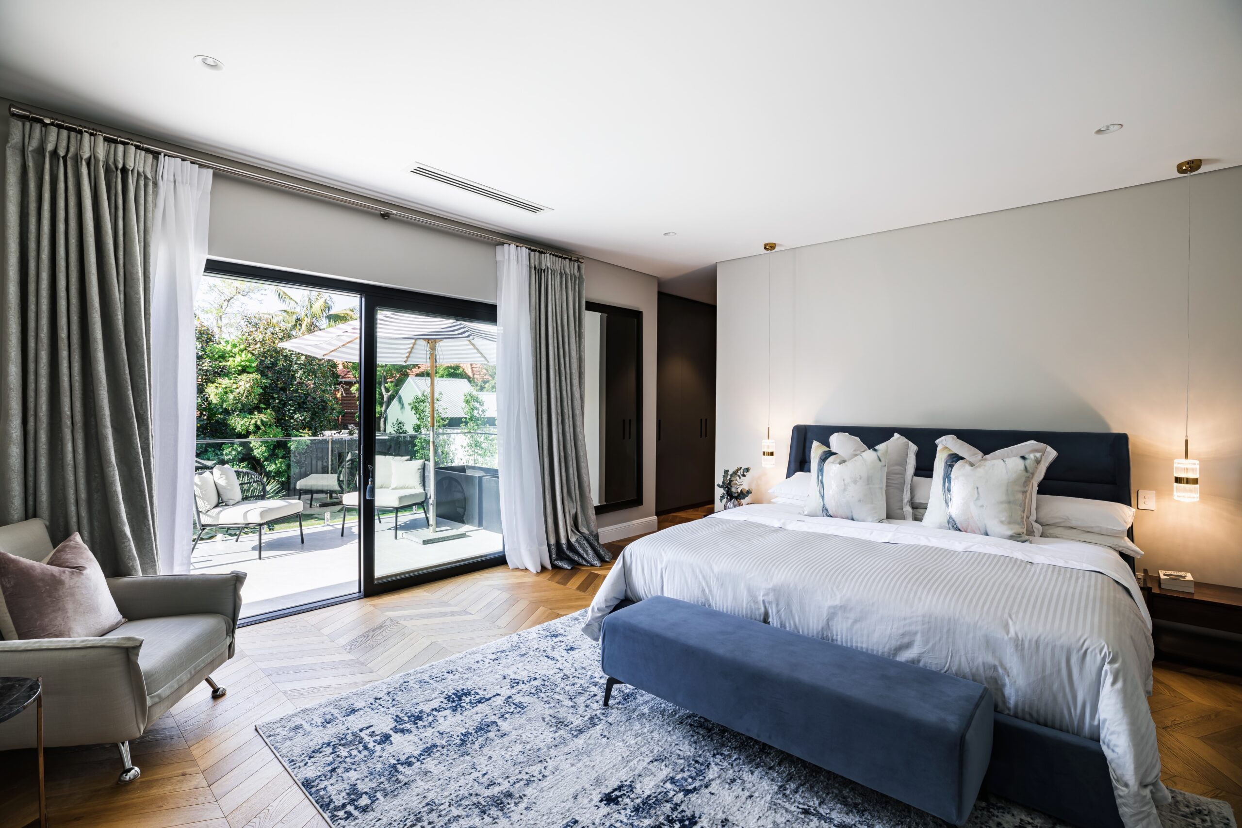 The upstairs is floored with chevron European Oak flooring flowing through all the rooms. 2 bedrooms have walk-in robes and 2 have bespoke built-in robes all in a 2-Pac finish with brass hardware. The secondary en-suites are fitted with Carrara marble bench tops and tiles.