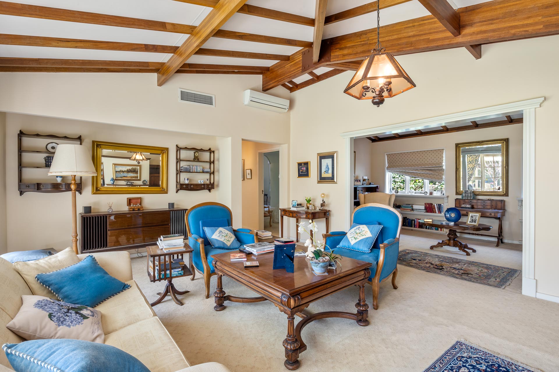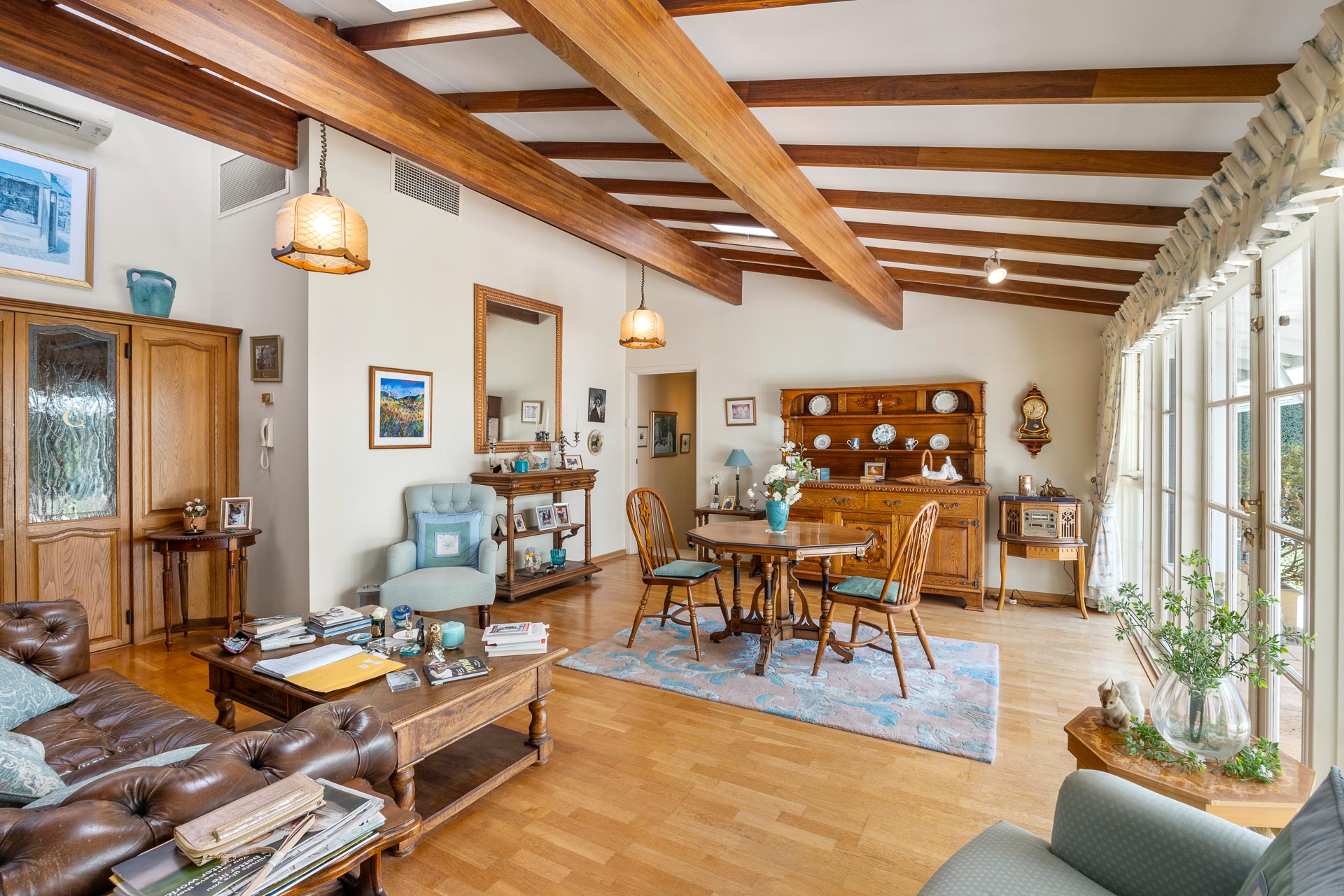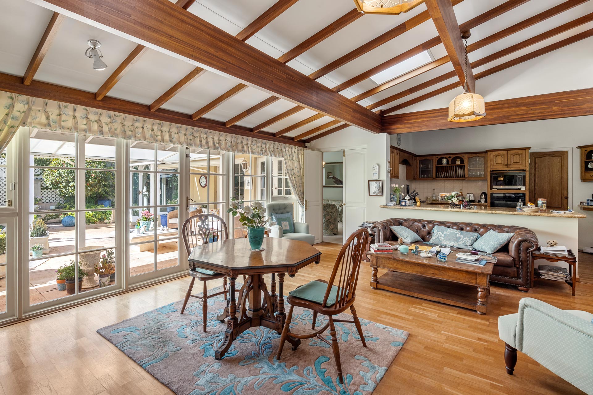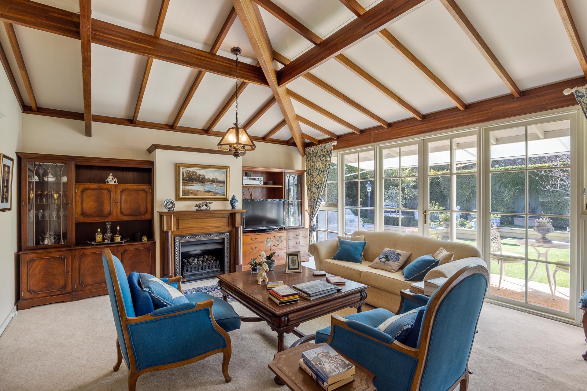Angled exposed timber beams above combine with the cosiness of a gas fireplace and large glass doors opening to the garden.