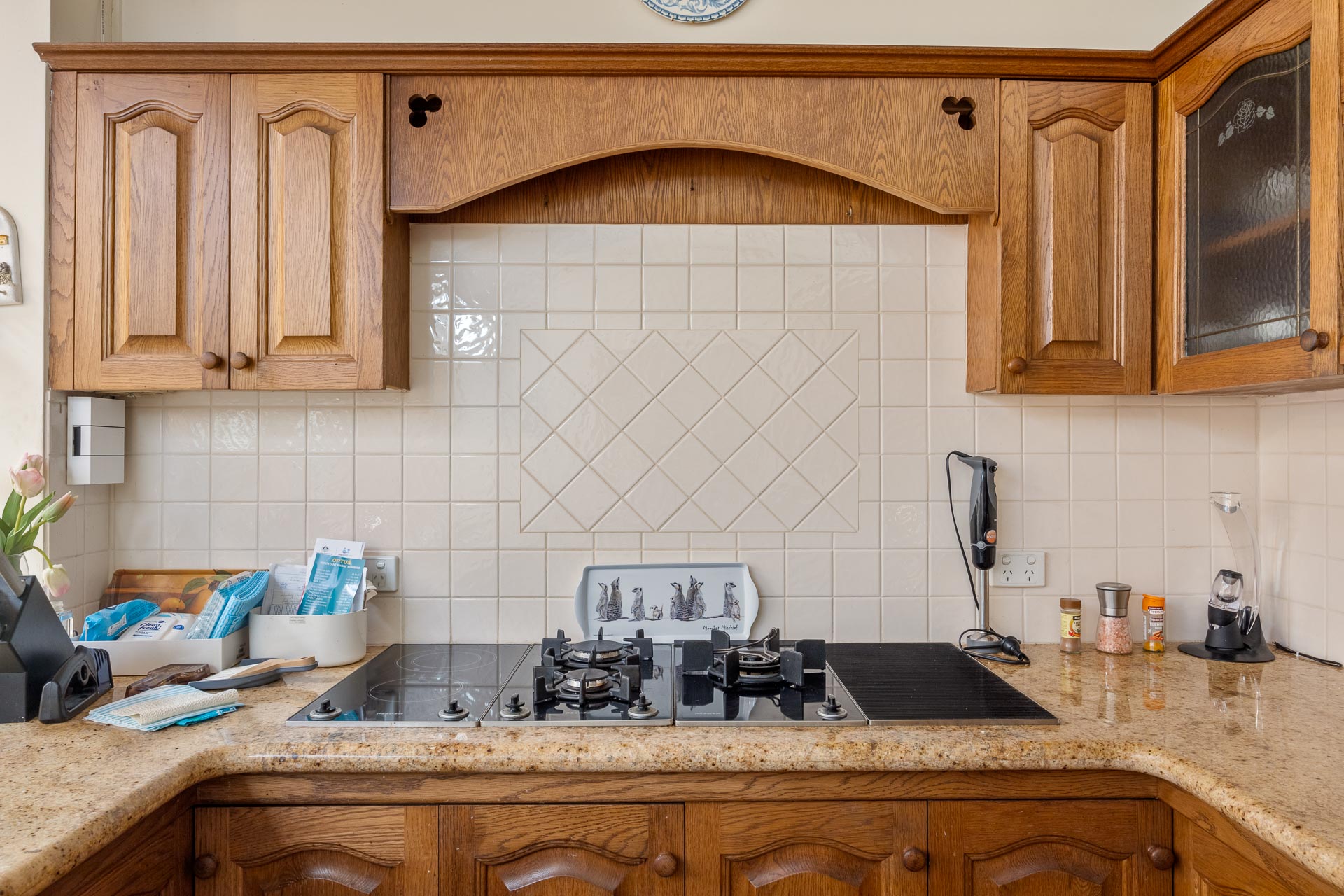 The kitchen, open plan to a casual living and dining area, features stone benchtops, Miele gas and electric stove top, walk-in pantry, and ample timber cabinetry.