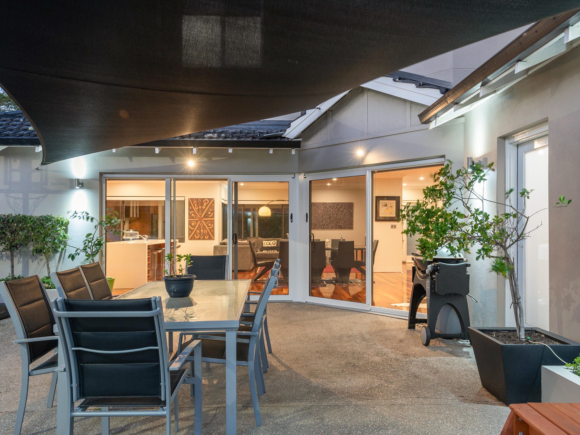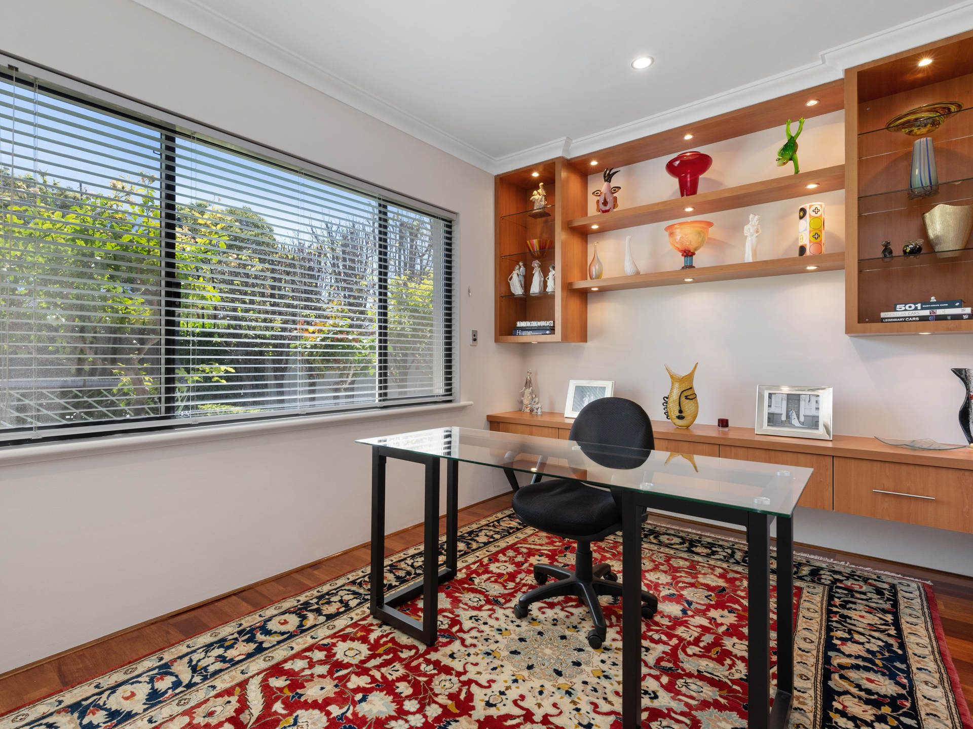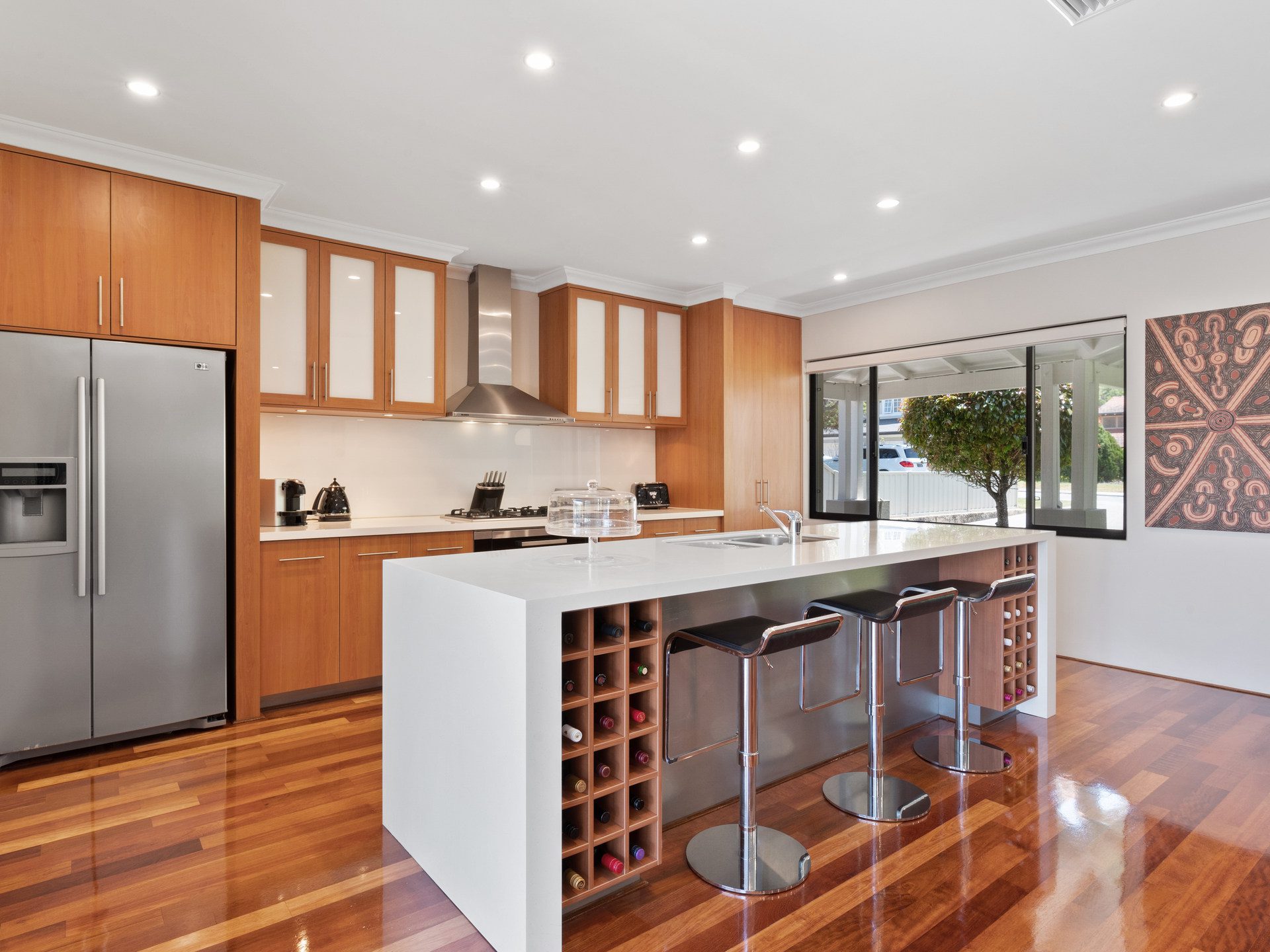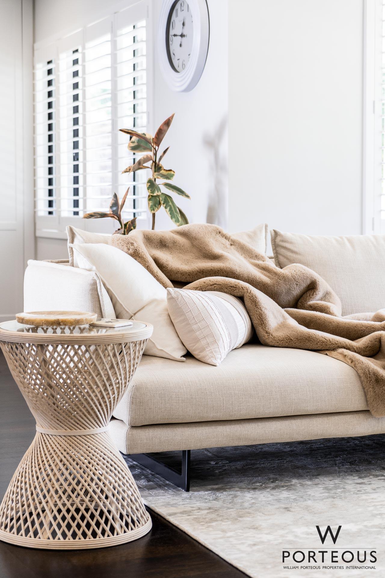 Inside, find beautiful polished hardwood flooring, designer pendant lighting, extensive built-in cabinetry, white plantation shutters and Villeroy & Boch bathroom fixtures throughout, which really sets the tone.