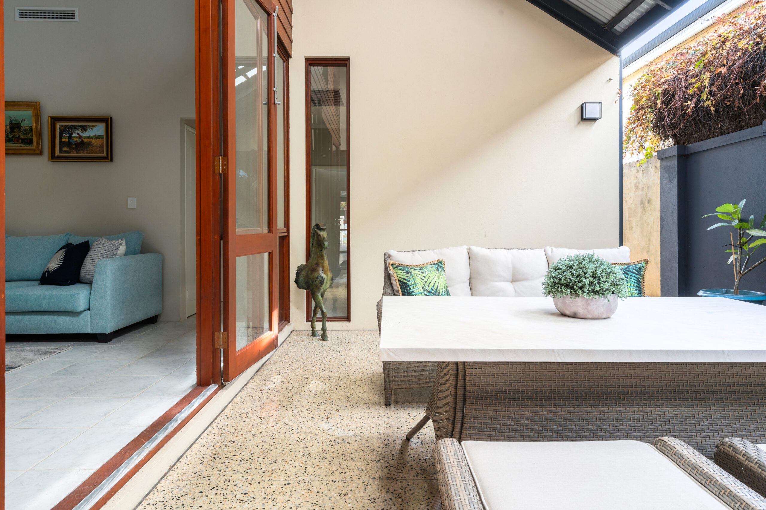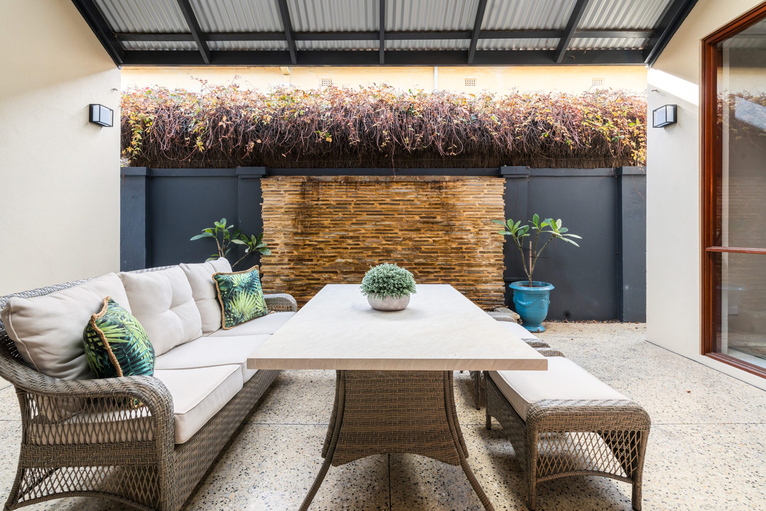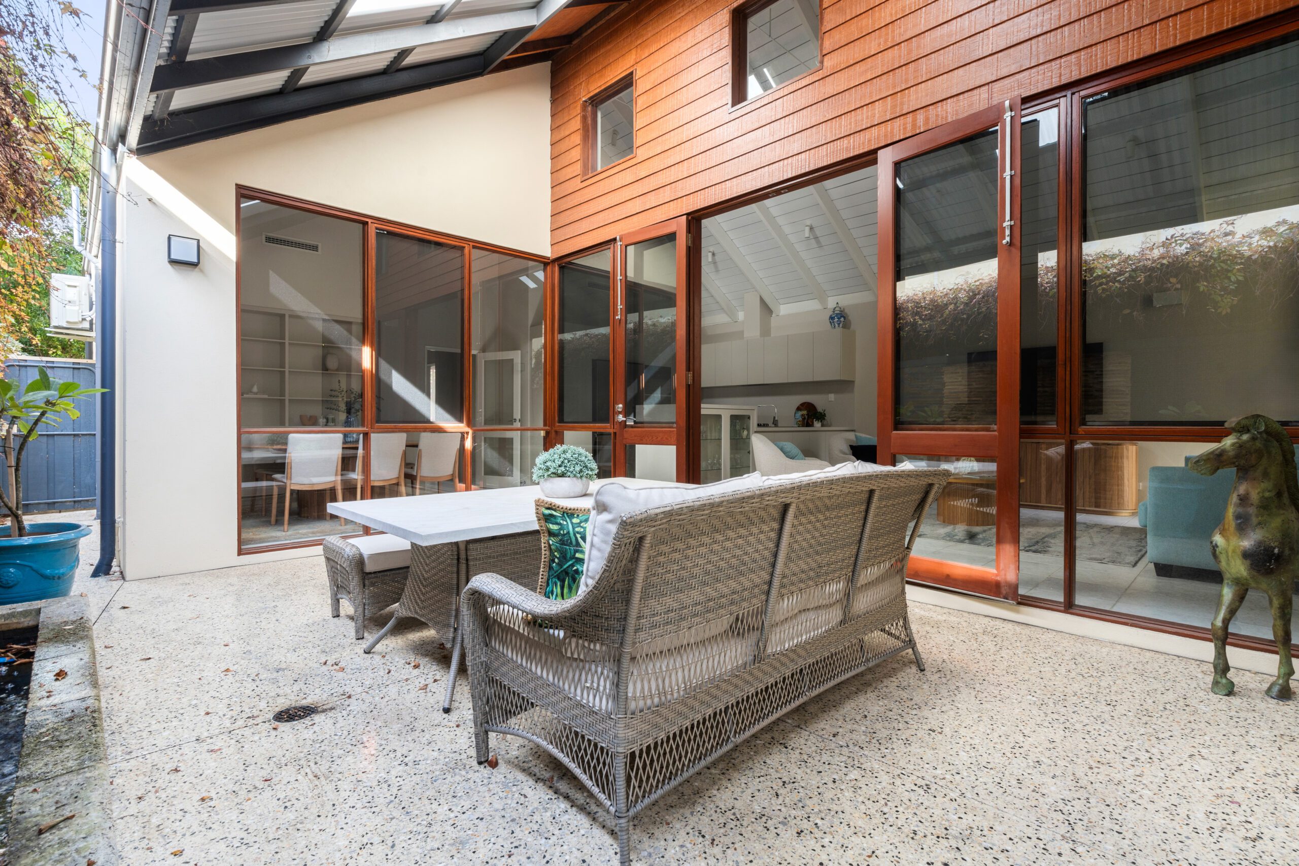 The north facing courtyard, complete with cascading water feature and polished concrete aggregate paving is an excellent extension of the indoors living. Atrium-like in its dimensions it makes for a great outdoor living and entertaining zone, year round.