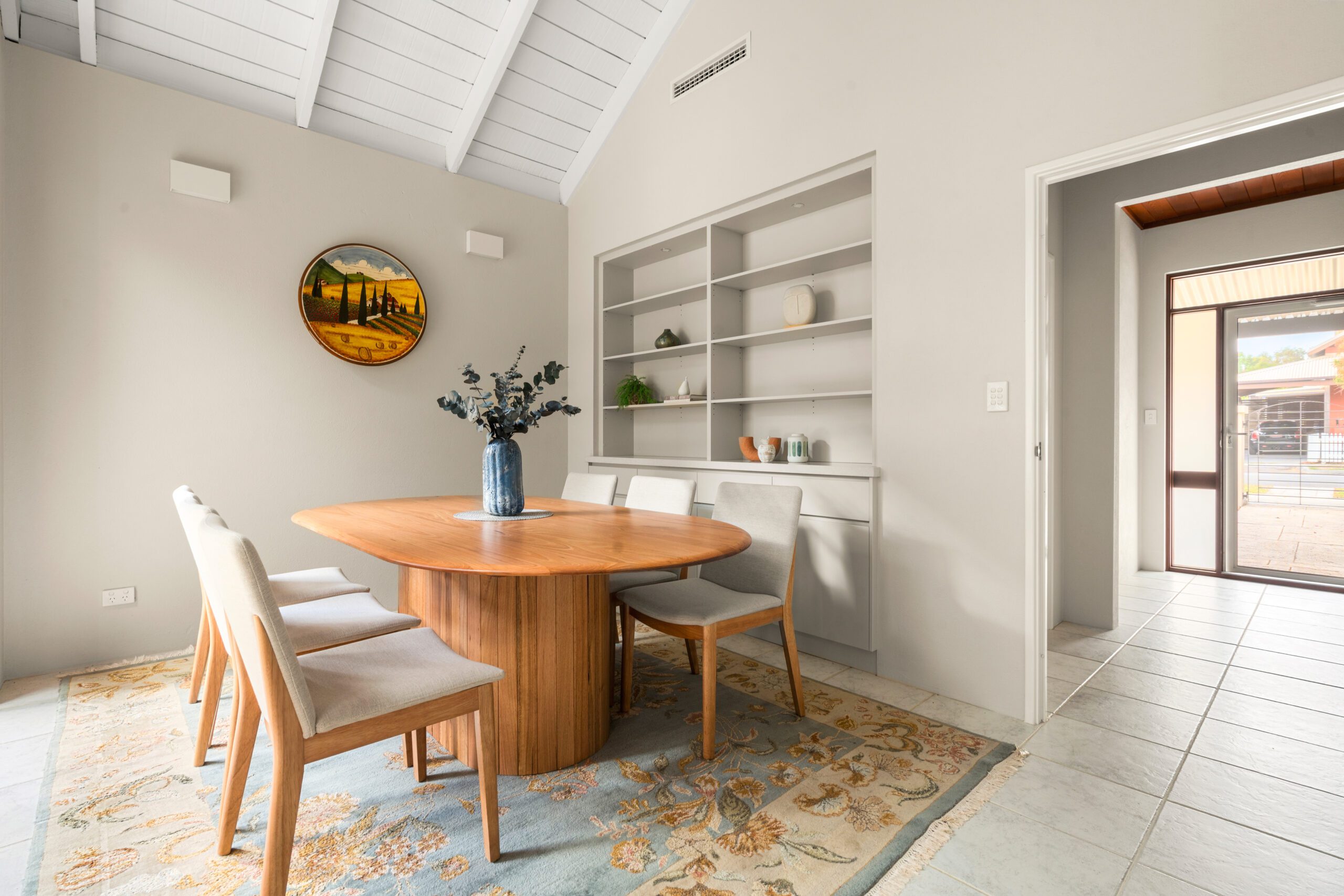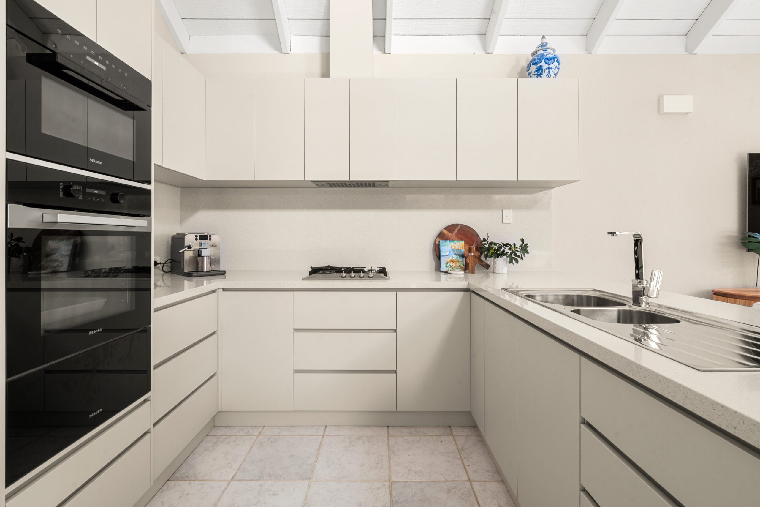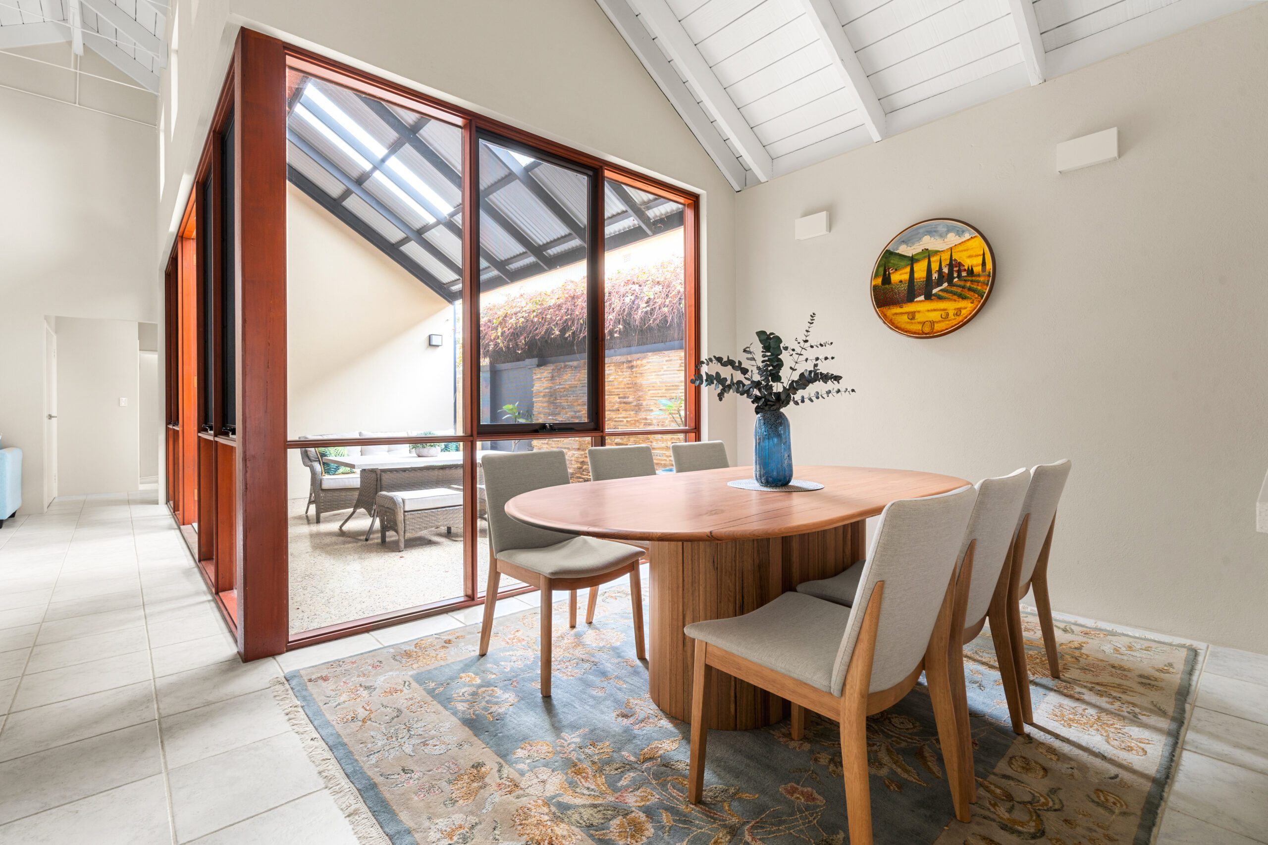 The main open plan living area sprawls out under a lofty vaulted ceiling, with large north facing windows, wrapping around a central northern courtyard. This is an open, spacious, light filled sanctuary.