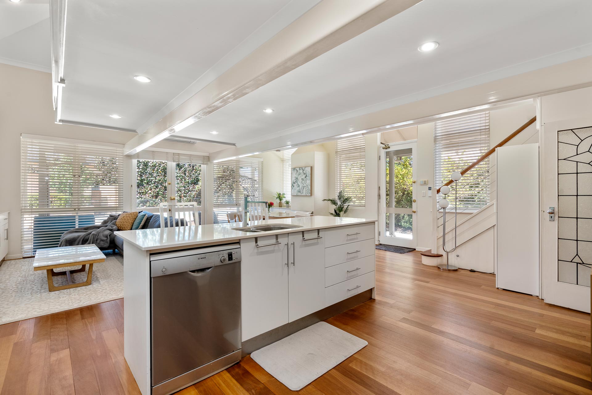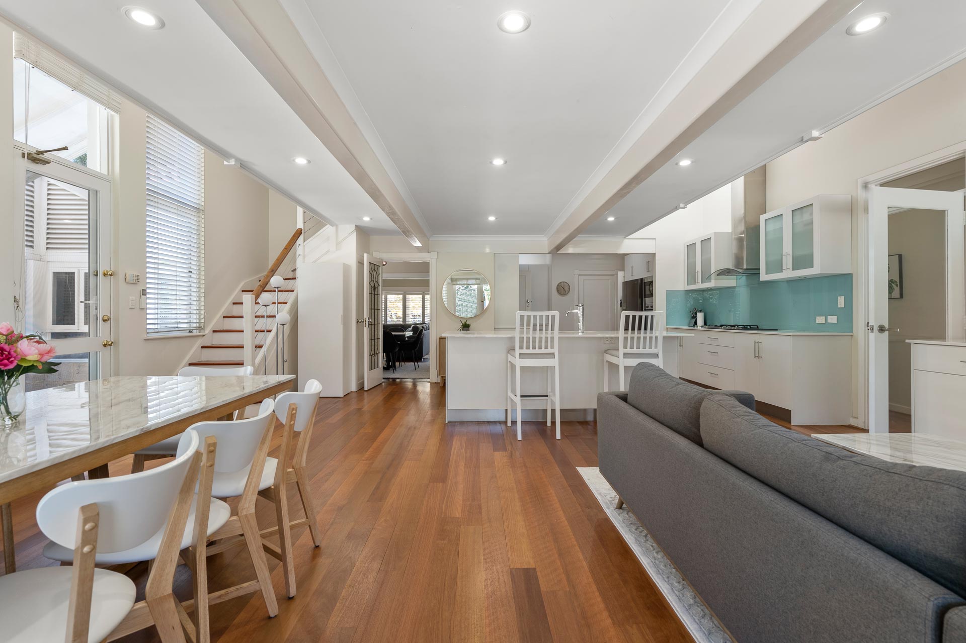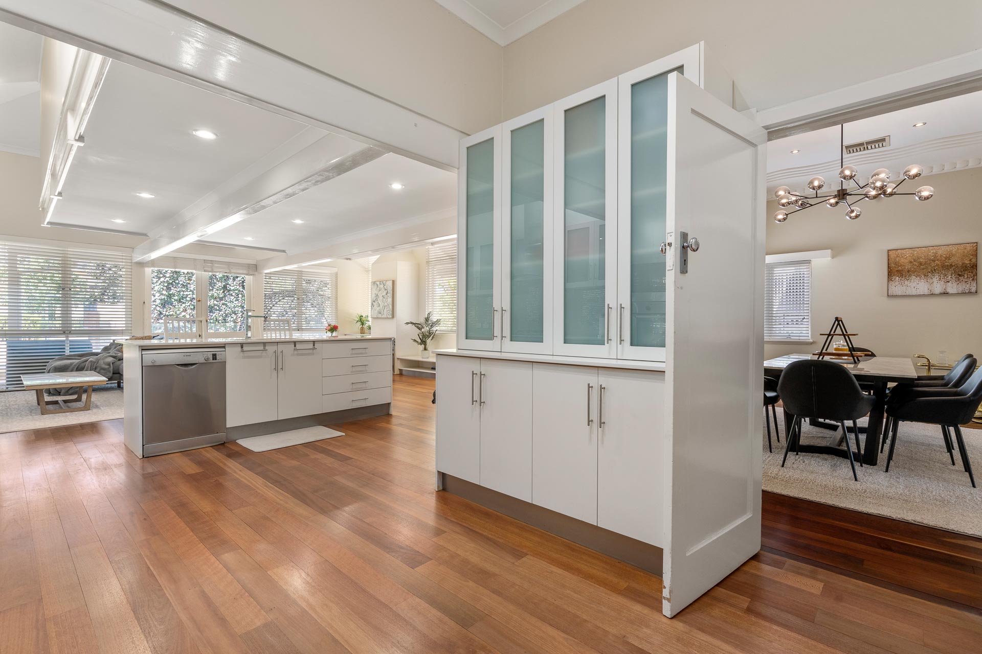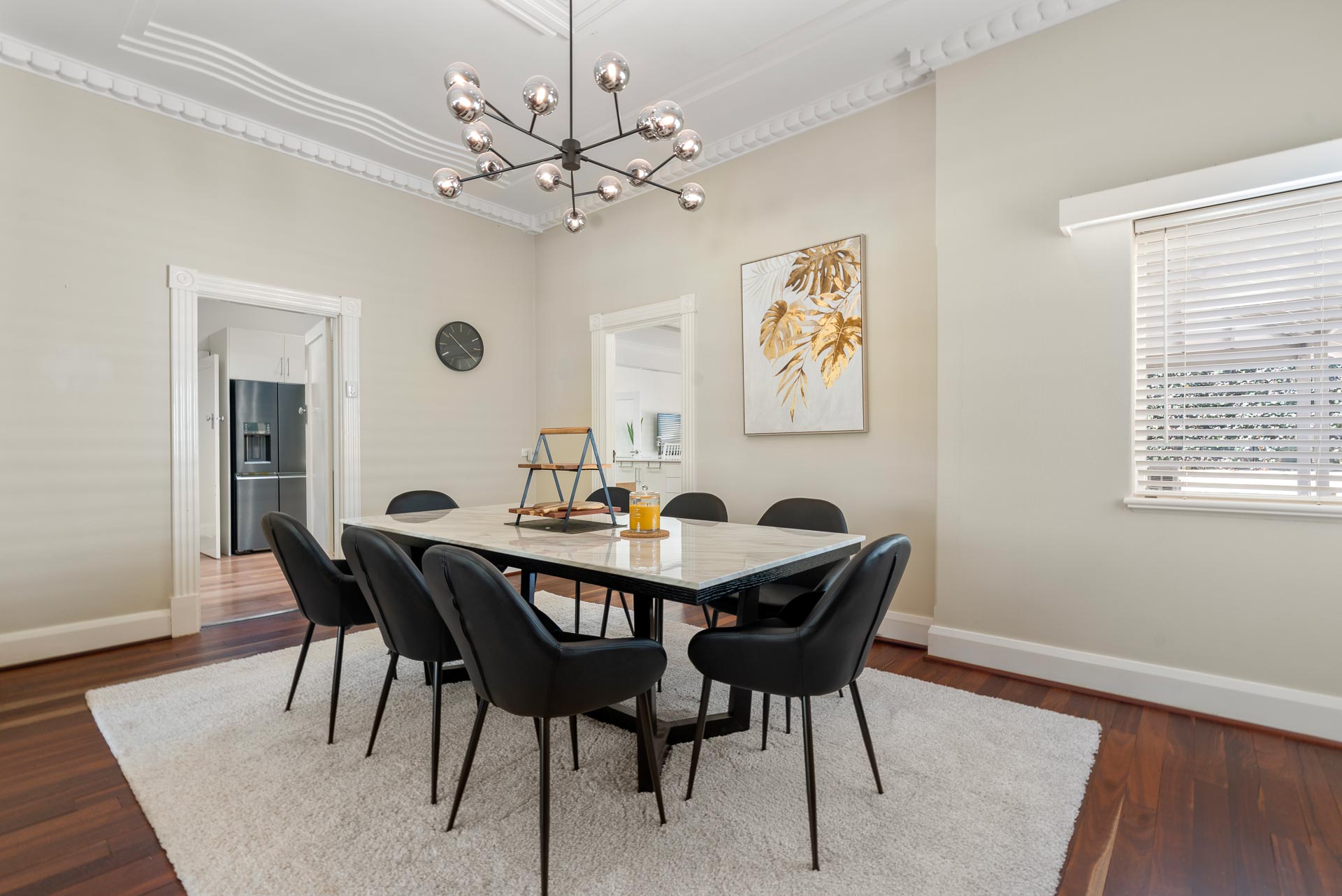 The more formal rooms at the front of the home are ideal for family gatherings or dinner parties. This elegant area facing the manicured front lawn has stand-out contemporary touches such as unique statement lighting combining very well with the home’s art deco foundations.