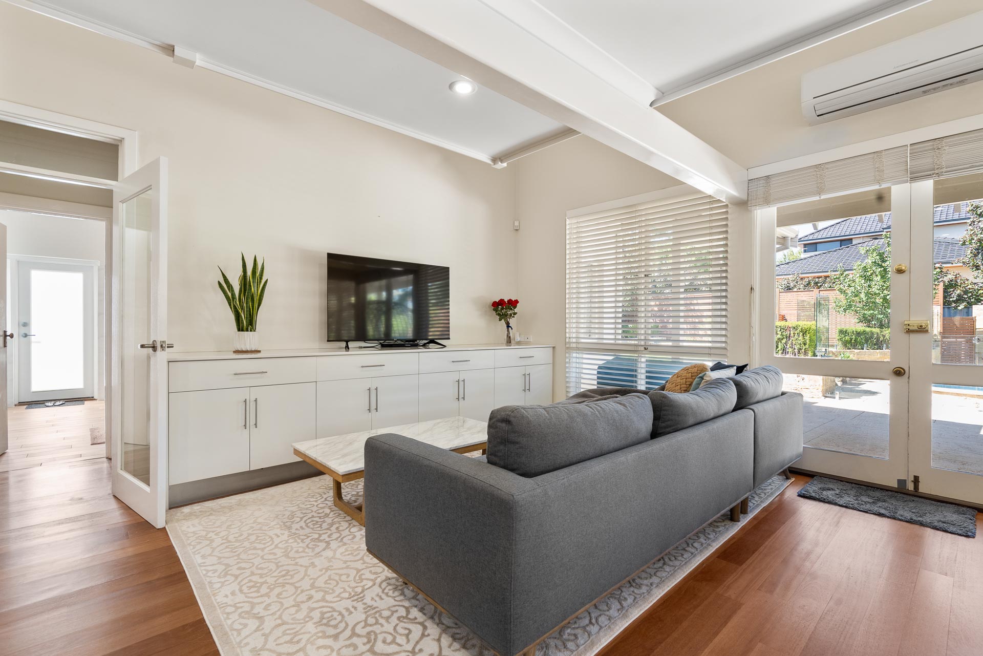 Adjoining is a casual living and dining area with a continuation of the timber floor boards from entry, built-in timber TV cabinetry, gas fireplace, and split system AC. From here, throw open the double doors and bring the outside in, thanks to a sunny outlook over the rear garden and swimming pool.