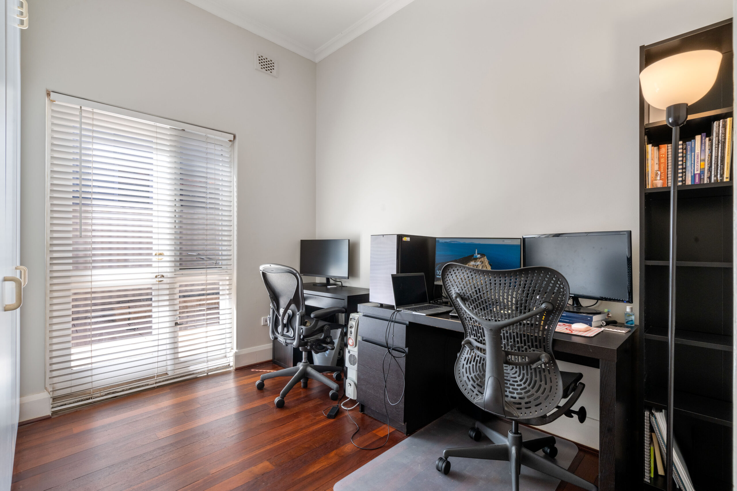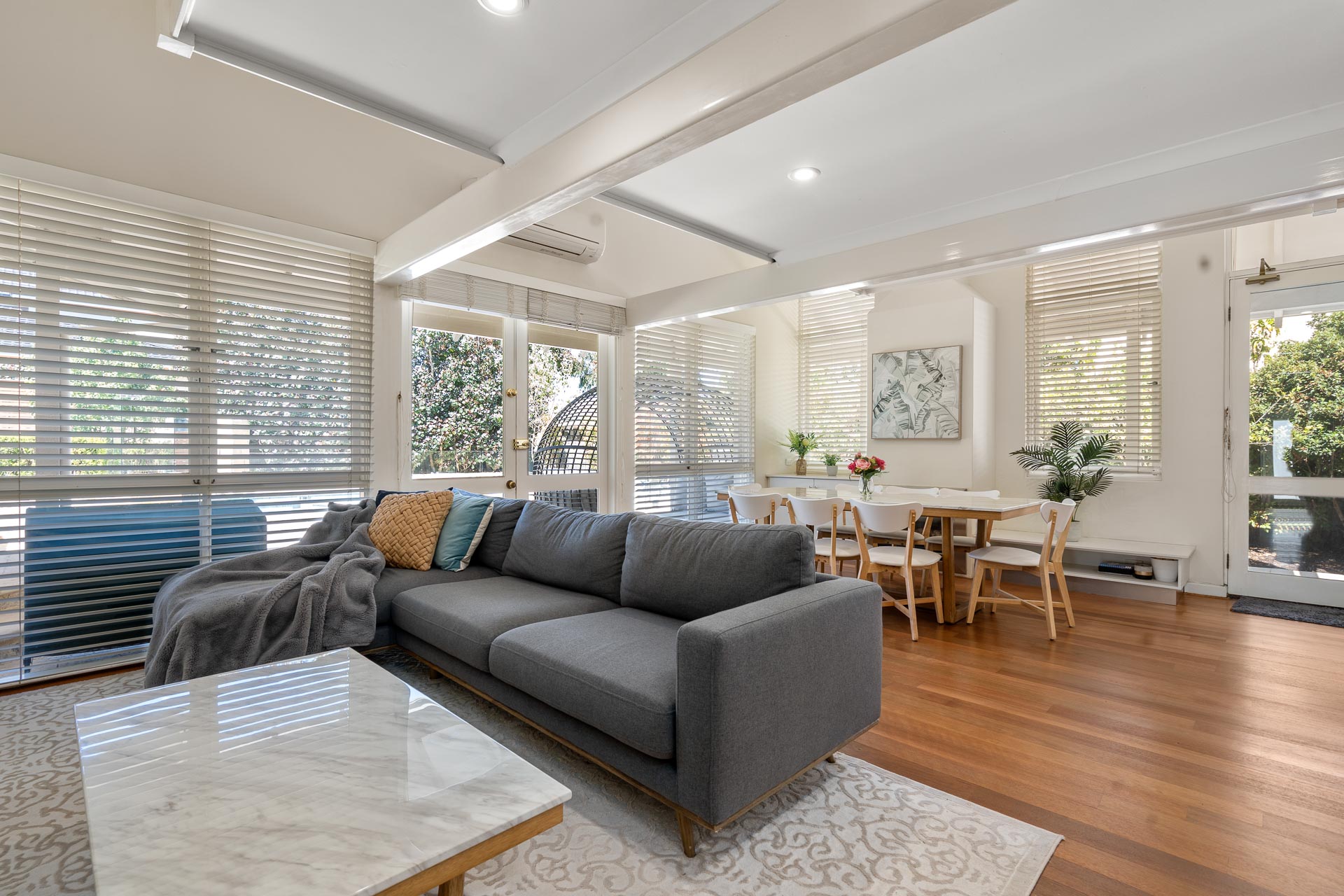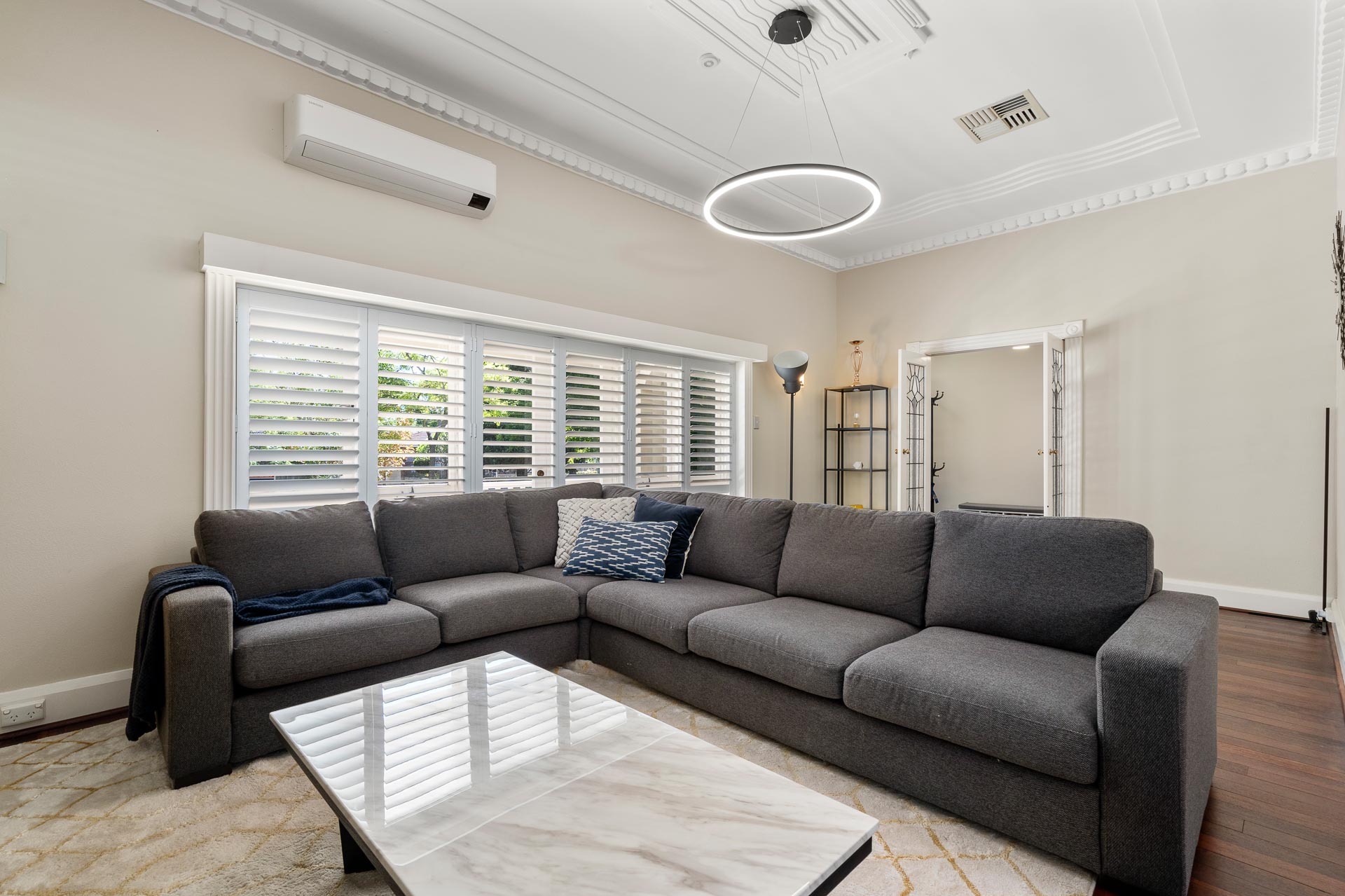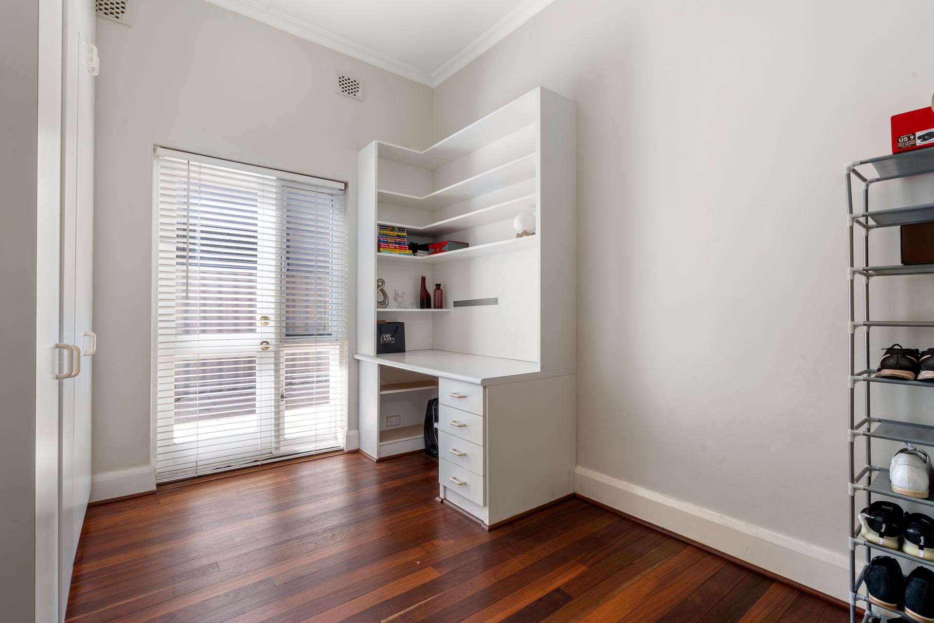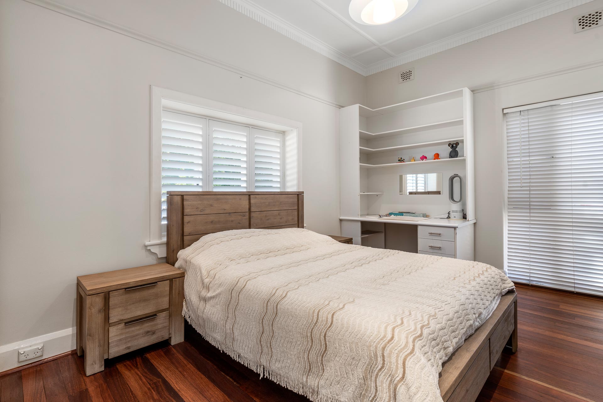 At the front of the property, a large fourth bedroom offers built-in robes, desk and lovely plantation shutters, a design feature also seen in the formal living and dining area.