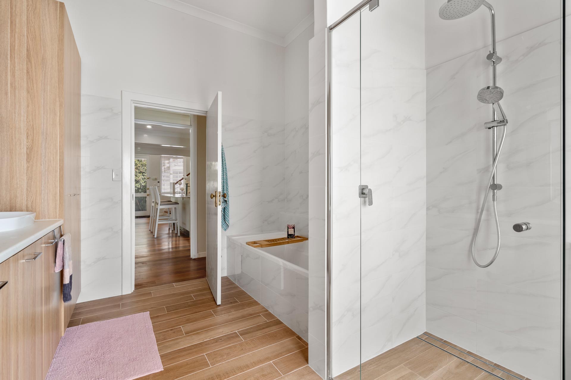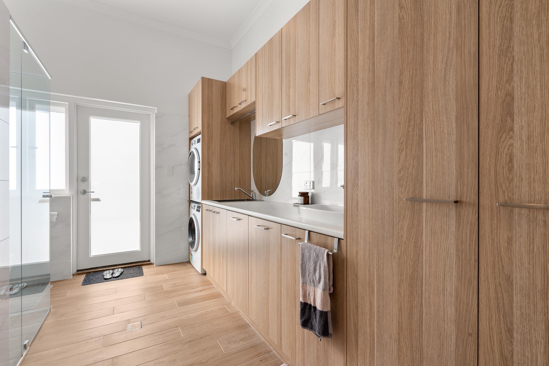 Back downstairs, two more bathrooms are on offer, one that combines a modern, family-sized laundry with top and bottom storage, tub and linen cupboard with a frameless rain shower, bath, and WC. A third bathroom is equally as practical for all ages, with a frameless rain shower and WC.