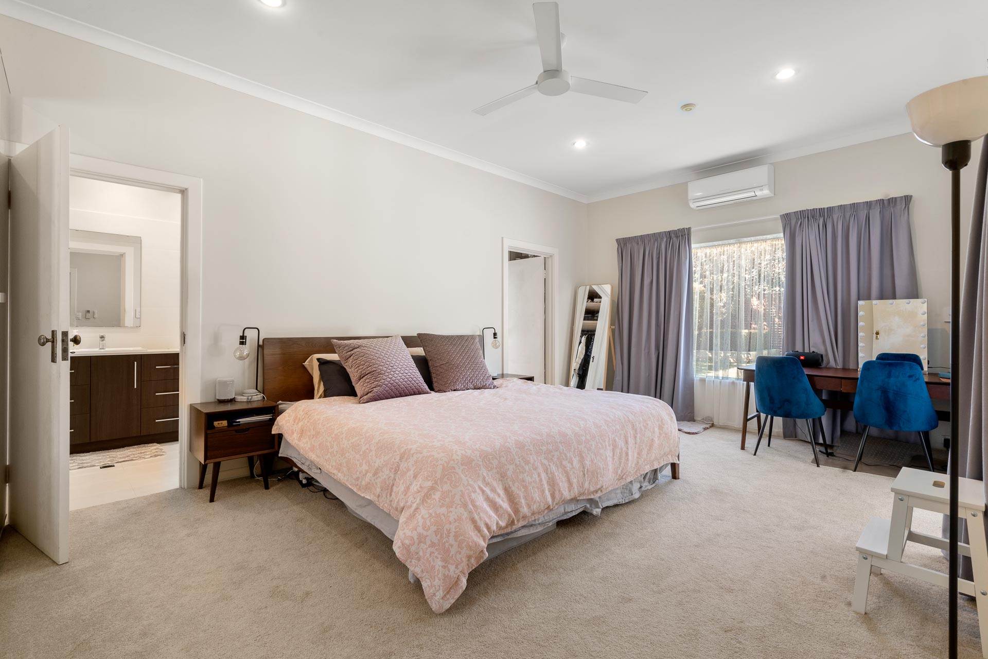 As part of the modern extension, find your very own retreat in the main bedroom, complete with walk-in and built-in robes, split system AC, and a clear view across the garden. Adding to the haven-like atmosphere is a fully tiled ensuite with double vanities, frameless rain shower and heated towel.