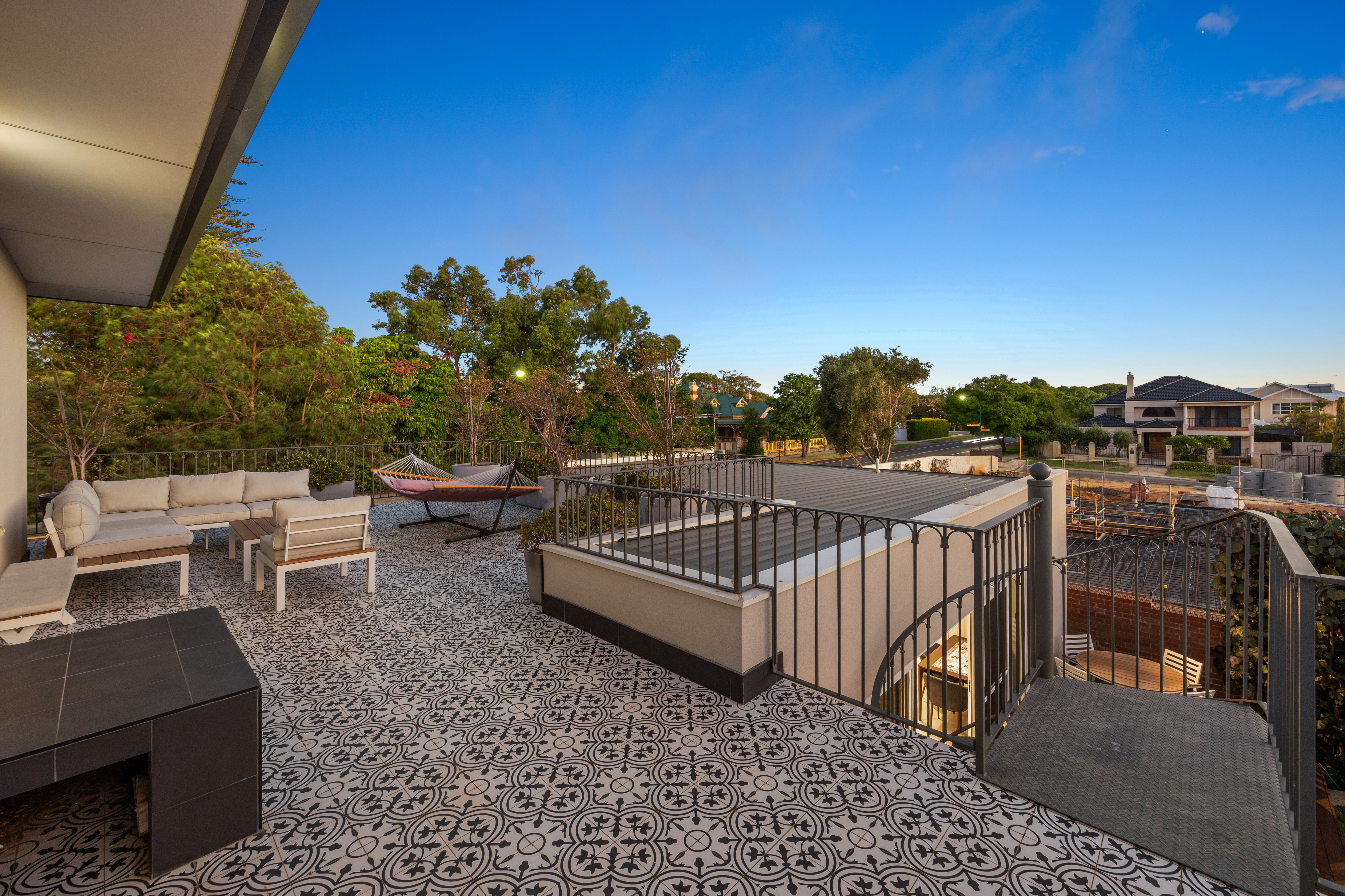 The enormous roof top terrace is a brilliant, elevated outdoor entertaining zone. Fully tiled and connected down to the private lawn, gardens and pool area via the cool circular staircase, it’s been the scene for many a gathering. A versatile space, the vibe may be chilled out on a warm Perth summer evening, or pumping as part of a party zone connected to the lower level when entertaining.