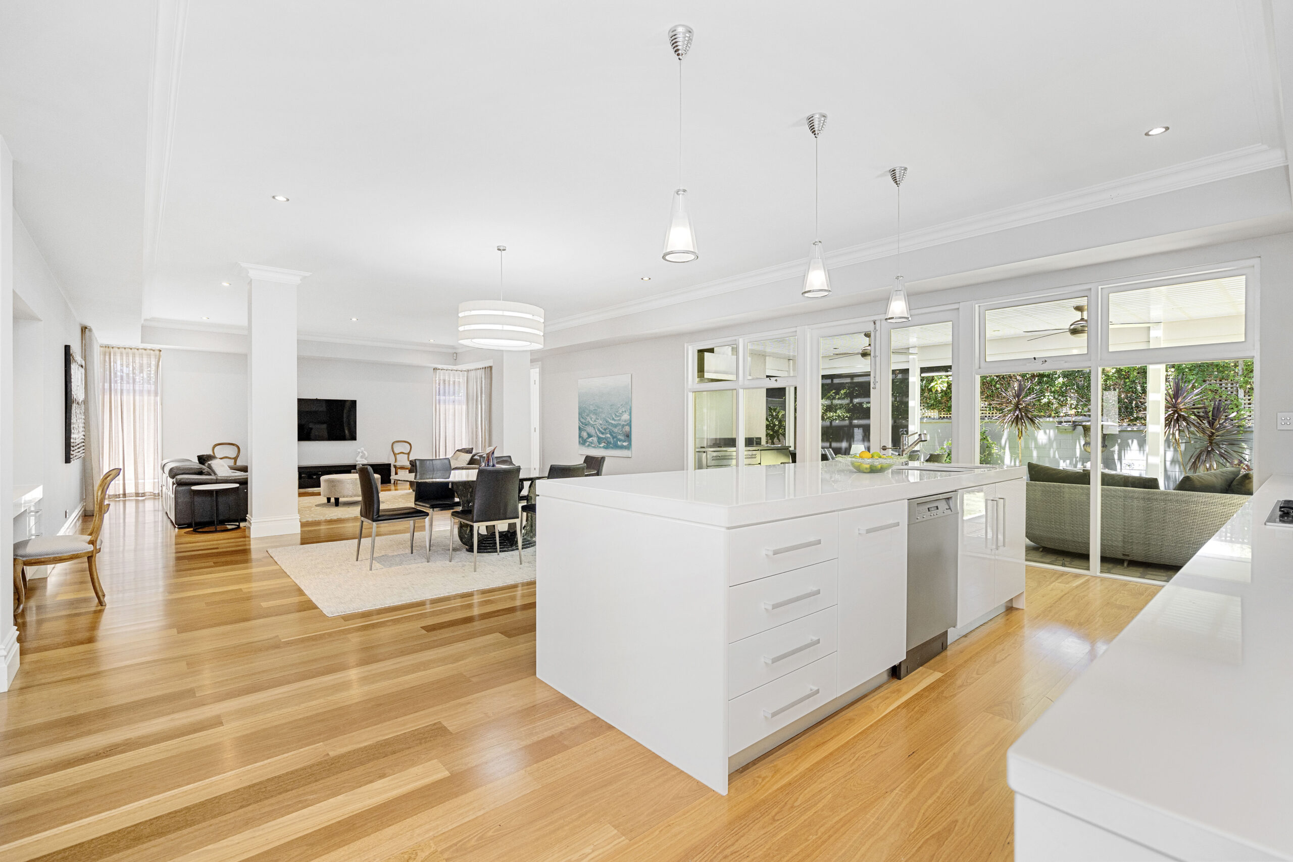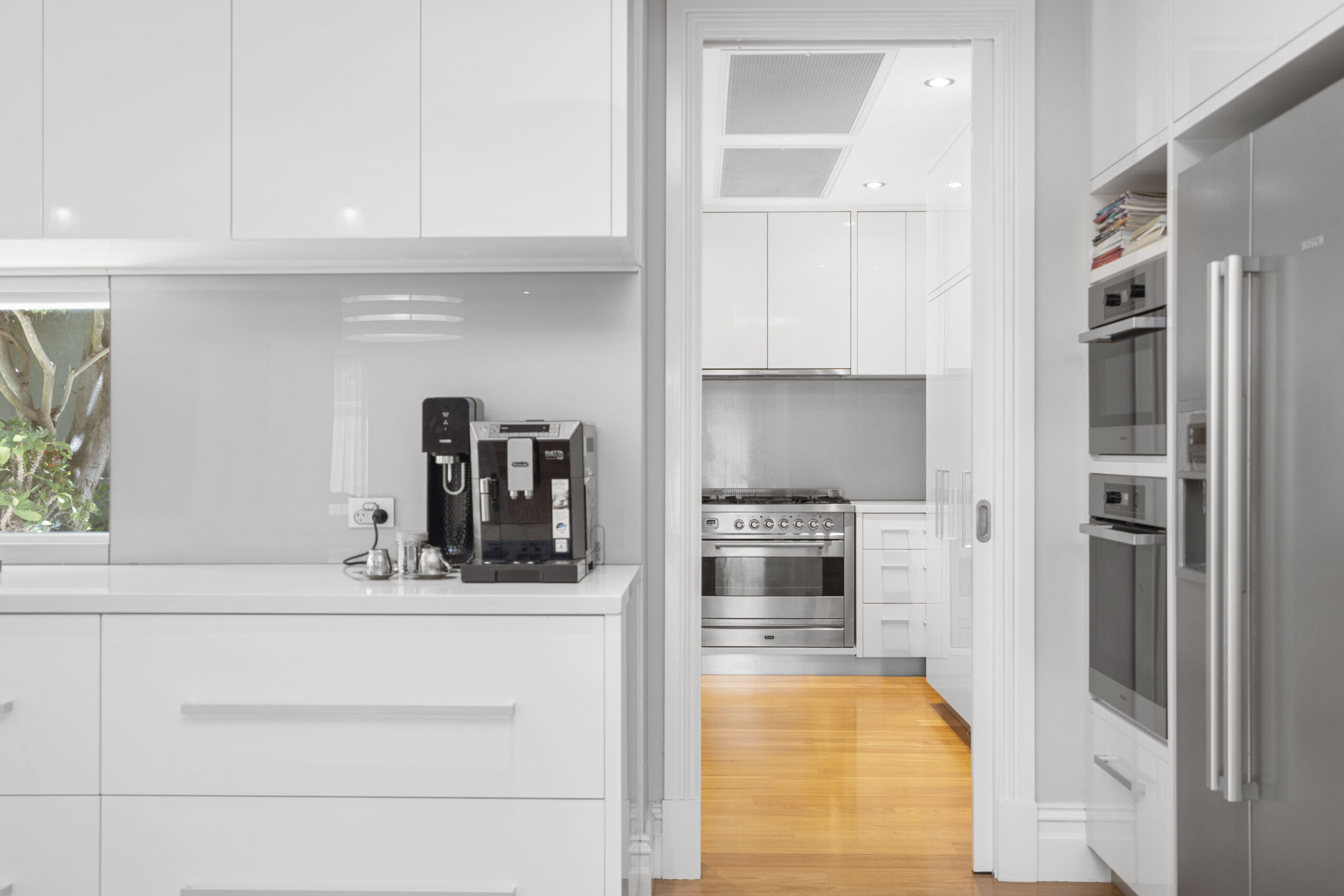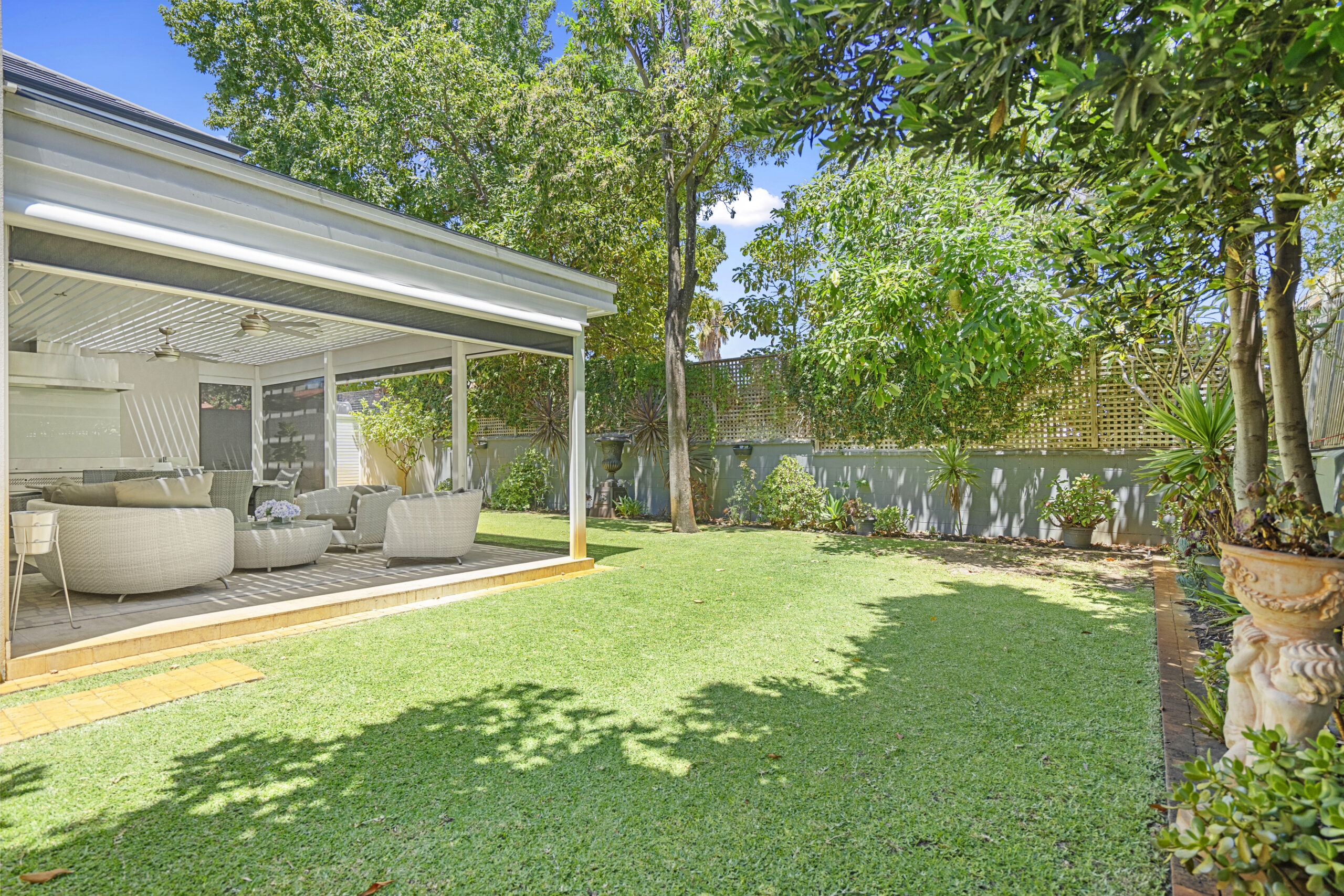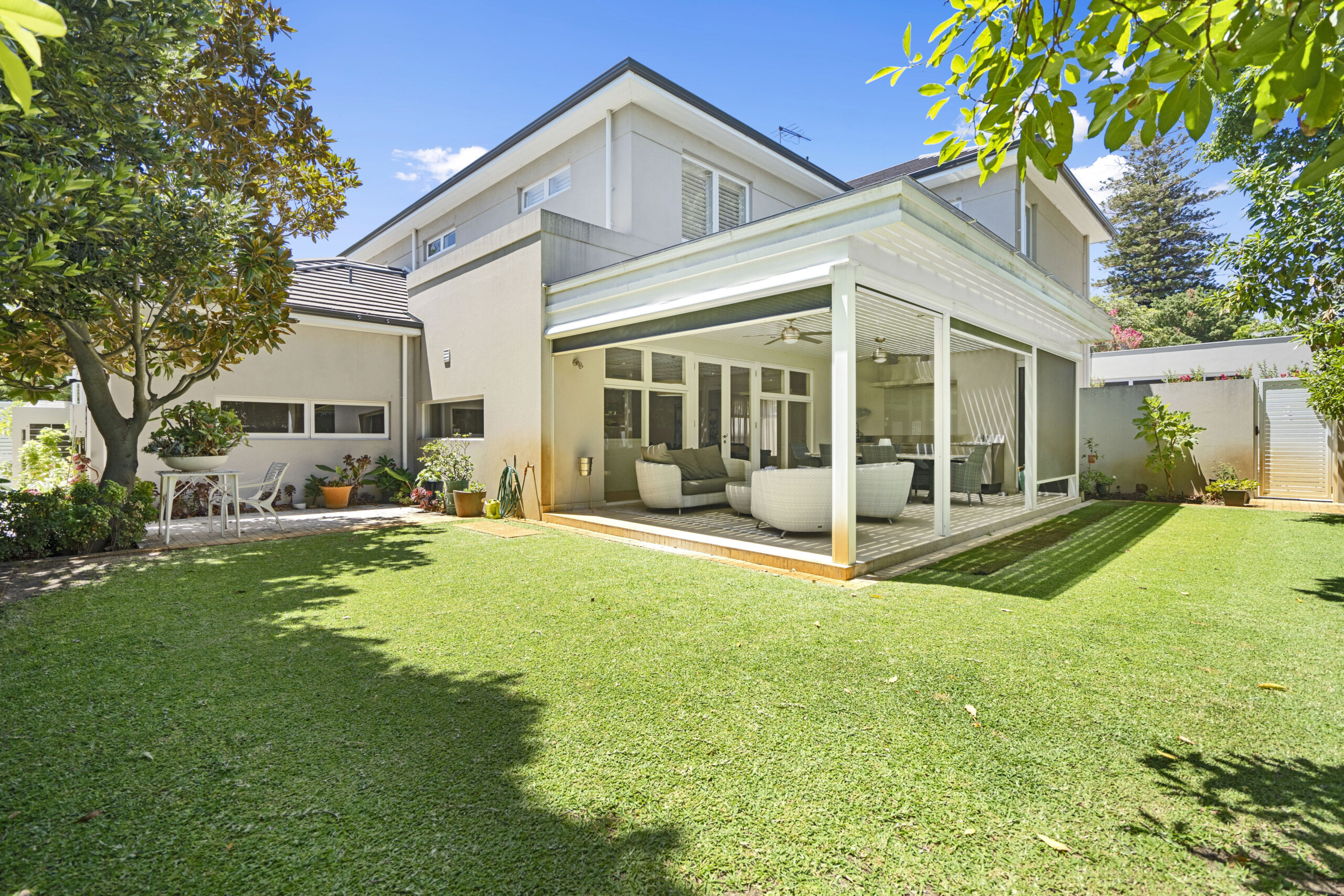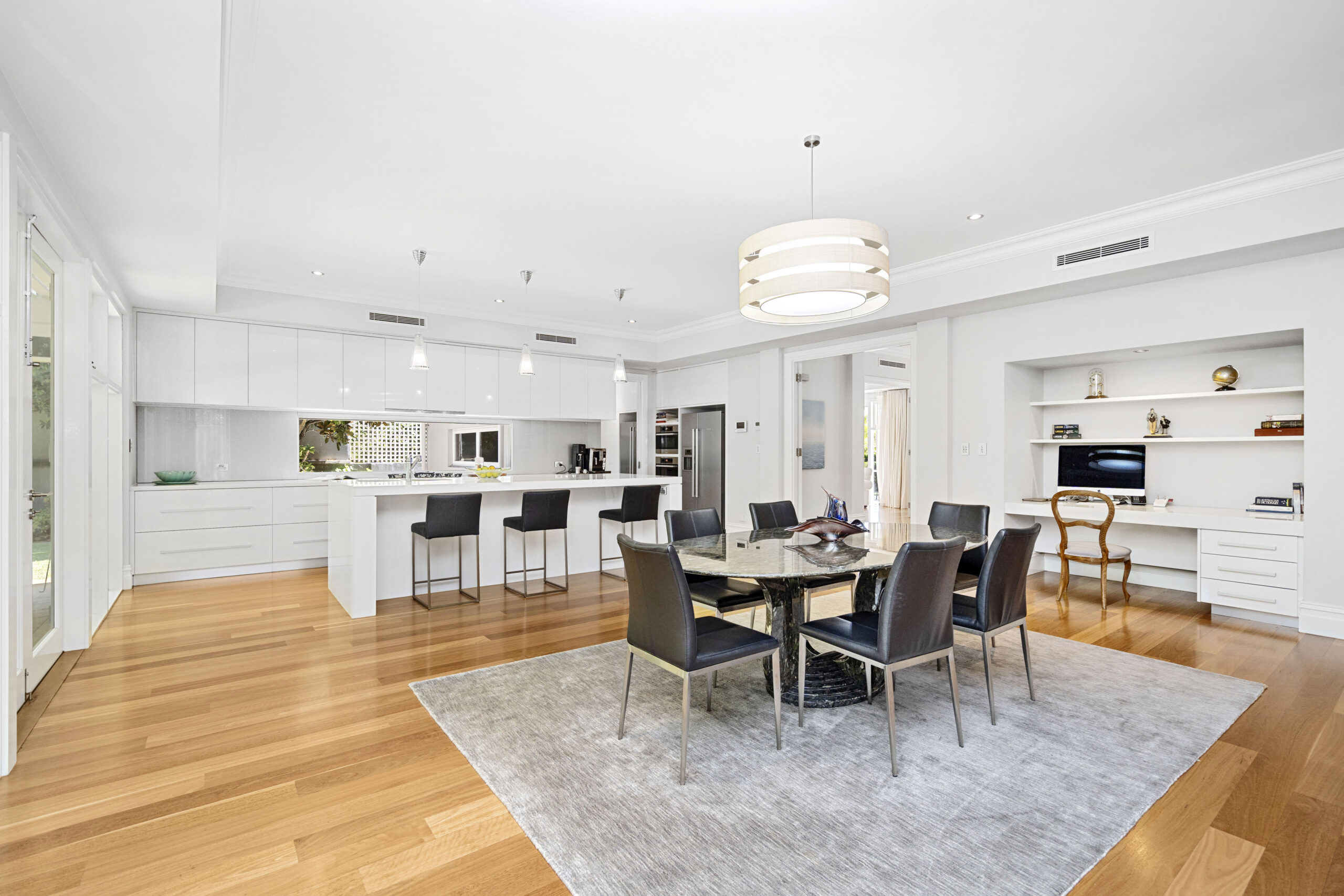 This light-filled gathering space is perfect for every occasion. You’ll enjoy connecting with family and guests, whether inside or in the delightful alfresco and outdoor kitchen, surrounded by private, established gardens. A built-in office nook provides an ideal spot to supervise after-school homework while preparing dinner or a handy utility area for keeping things tidy and charging devices.