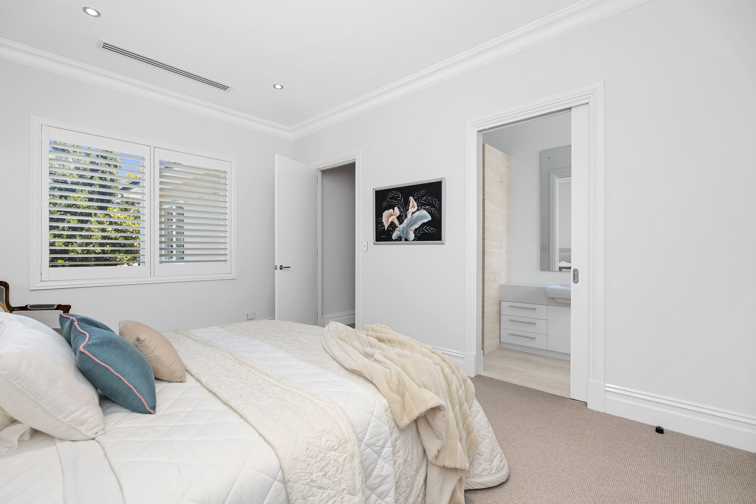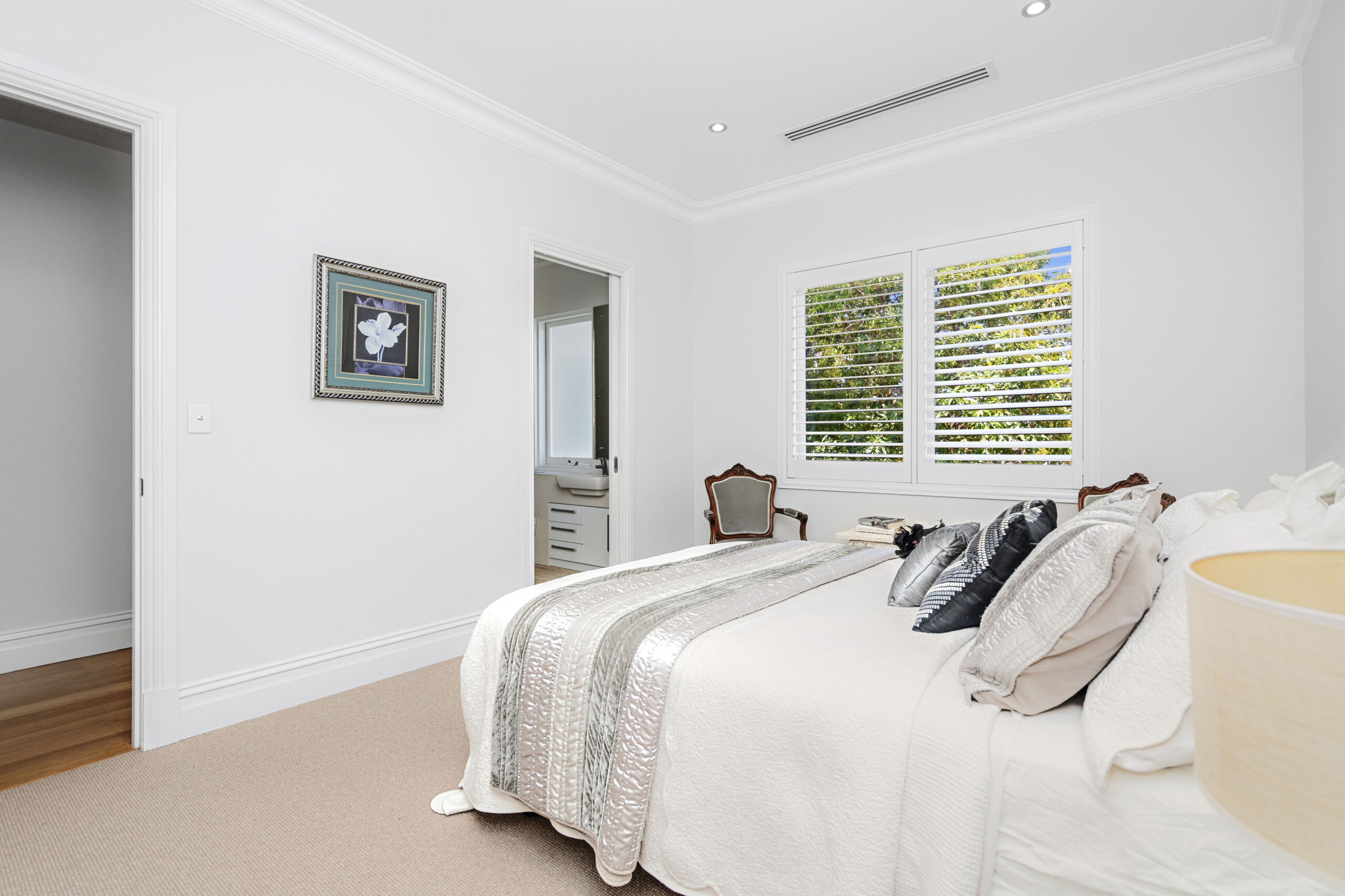 The three secondary bedrooms upstairs are carpeted, with white plantation shutters, built-in robes and contemporary private ensuites. The primary suite comprises a generous bedroom, a fully customised dressing room and a deluxe resort-style ensuite with walk-through rain showers, a vanity with dual basins, a freestanding bath and a separate WC. The ultimate adults’ retreat, it also boasts a private balcony where you can relax and enjoy the birdlife, leafy surrounds and refreshing river breezes.