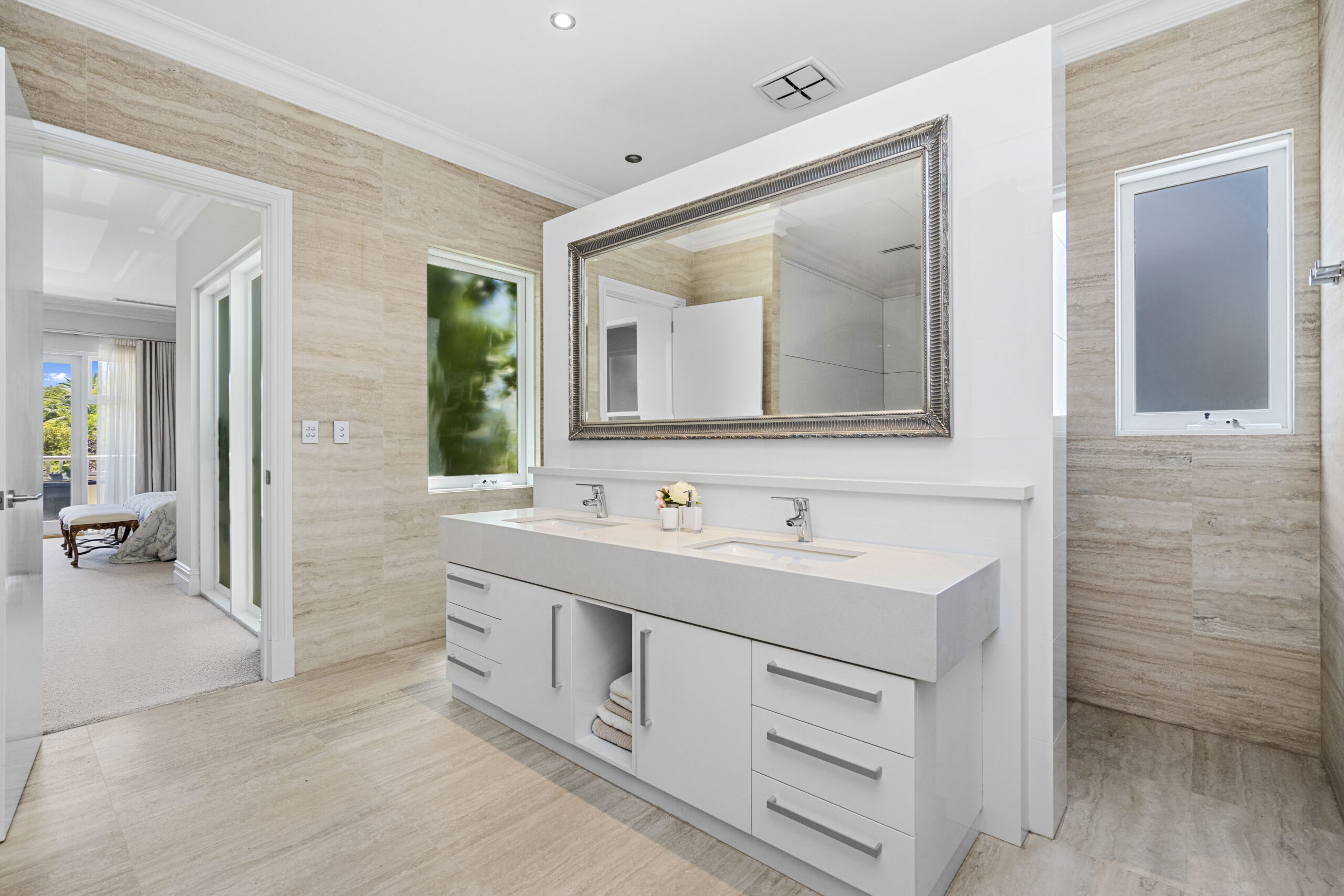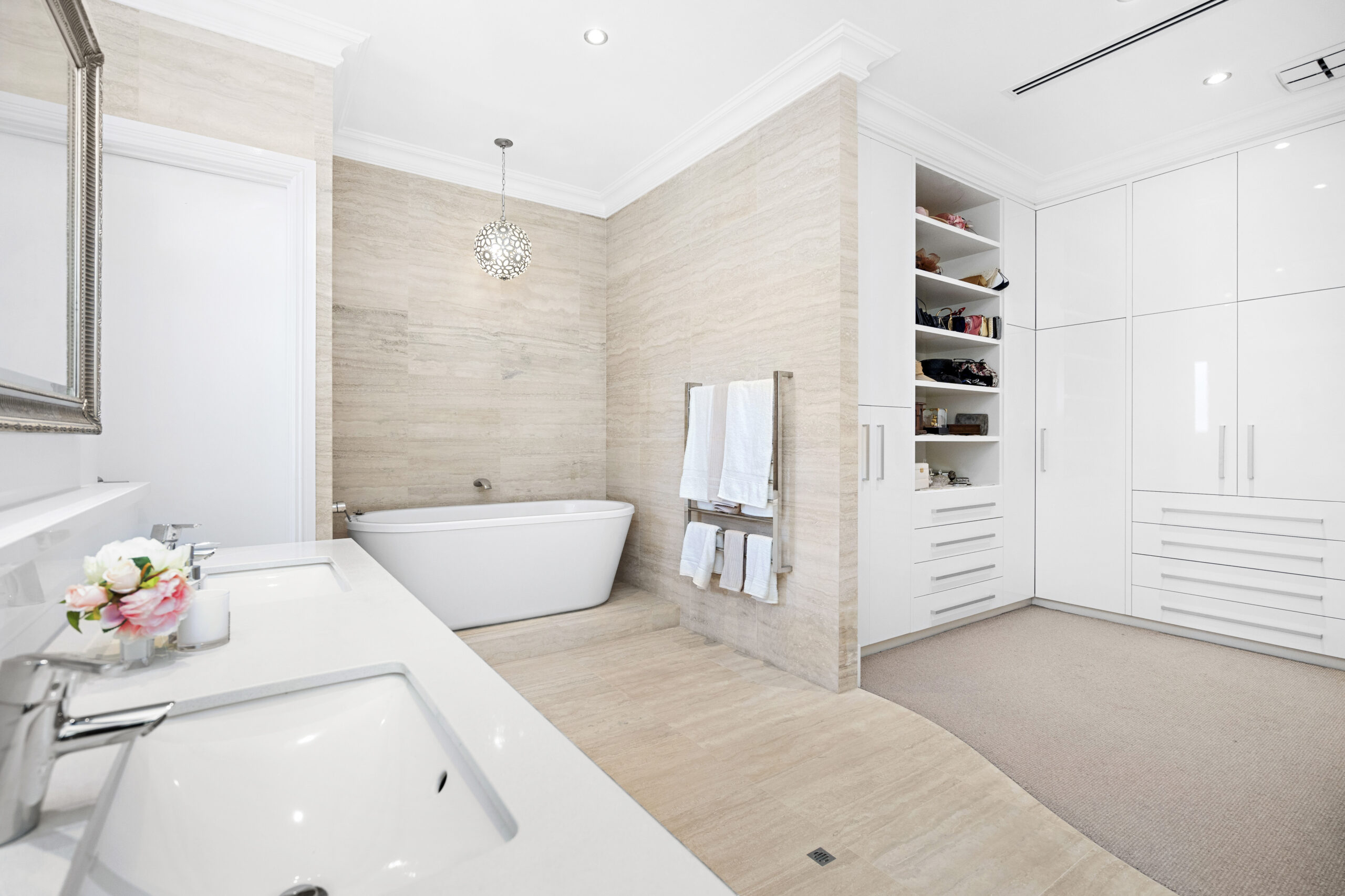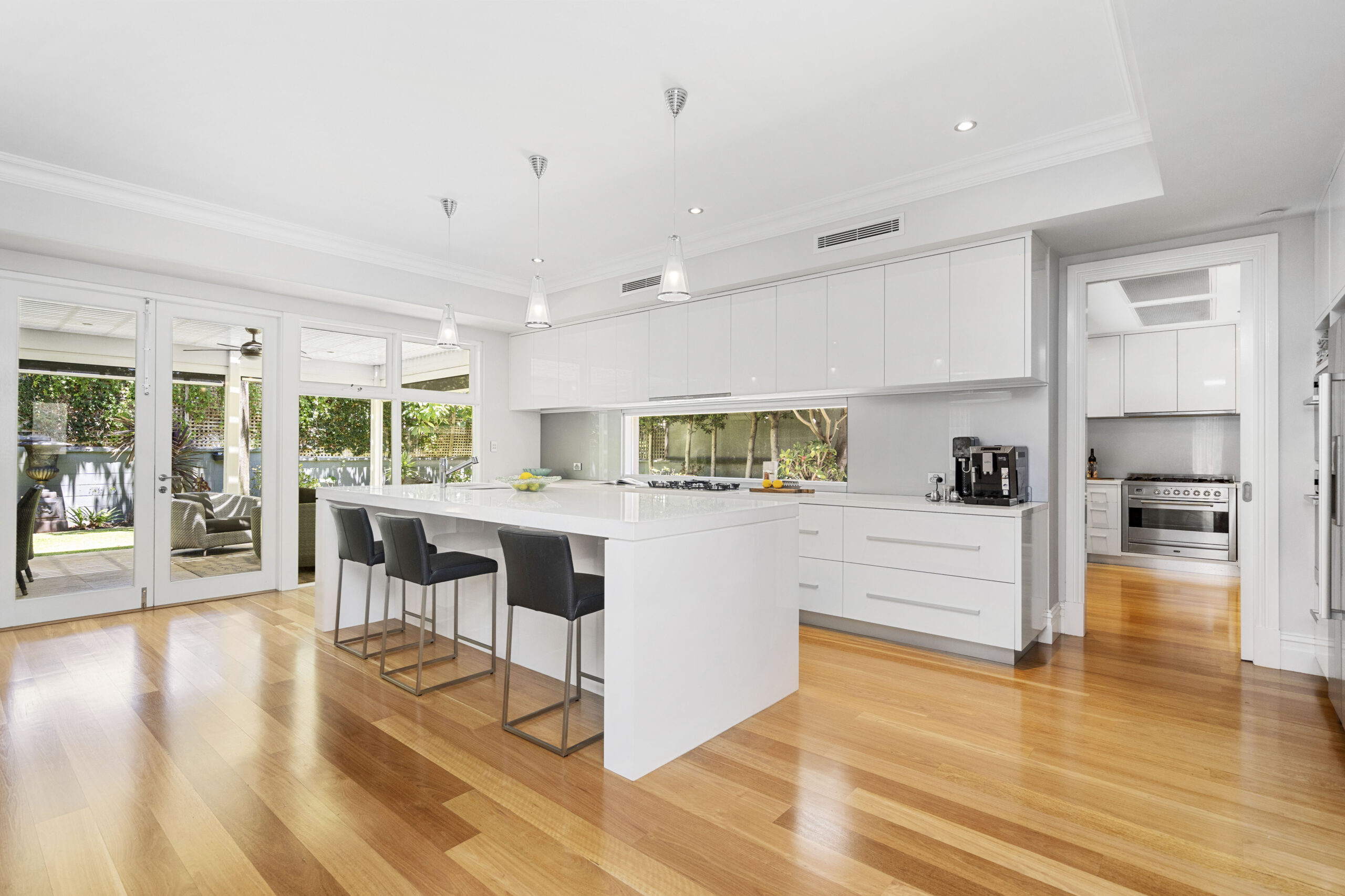The sleek designer kitchen leaves no stone unturned and is certain to impress seasoned entertainers. It includes an adjoining scullery with a second dishwasher and Ilve oven, pantry storage, extra sinks and fridge recess. There’s plenty of space at the island breakfast bar, engineered stone benchtops and glass splash backs, and a suite of Miele appliances, including double ovens, a 5-burner cooktop and a dishwasher.