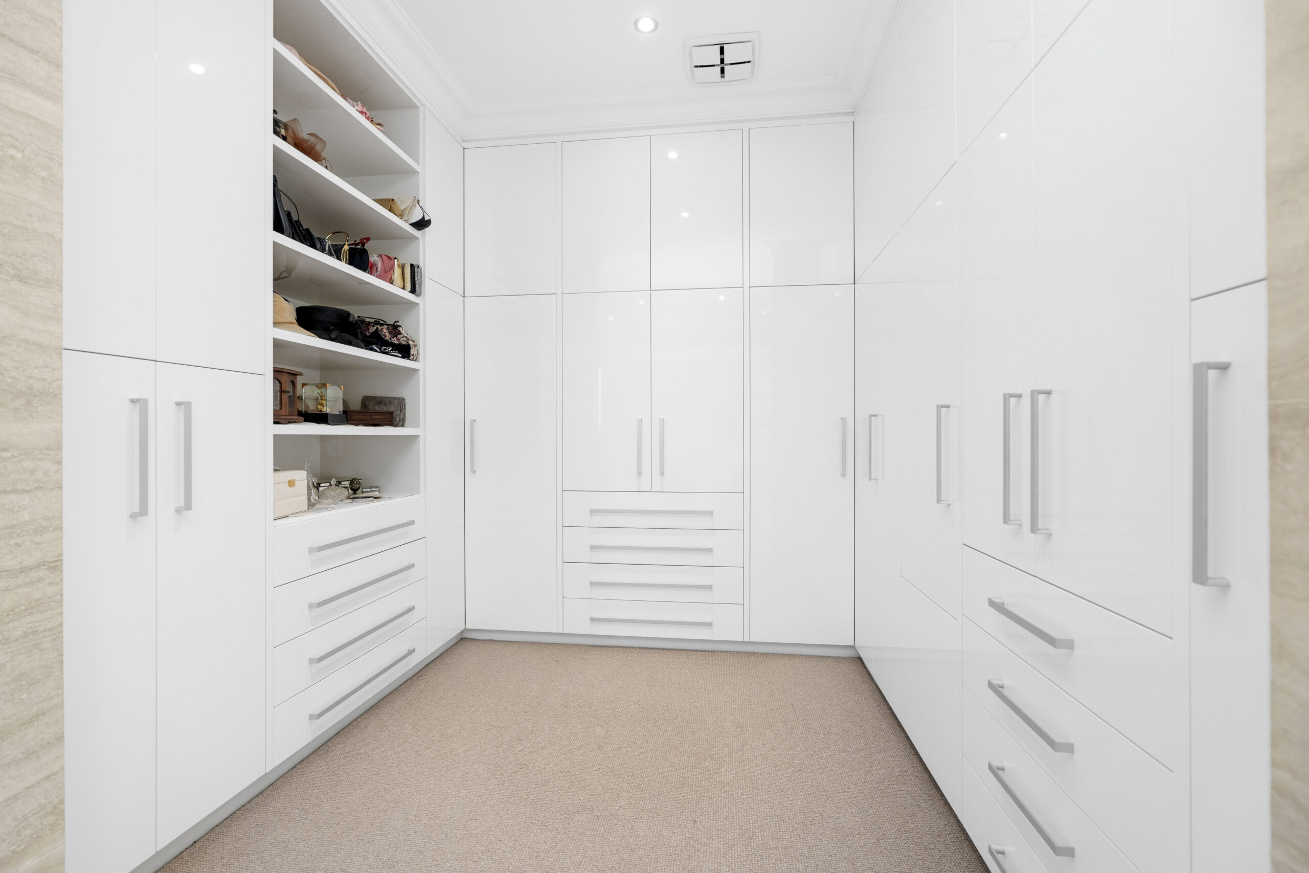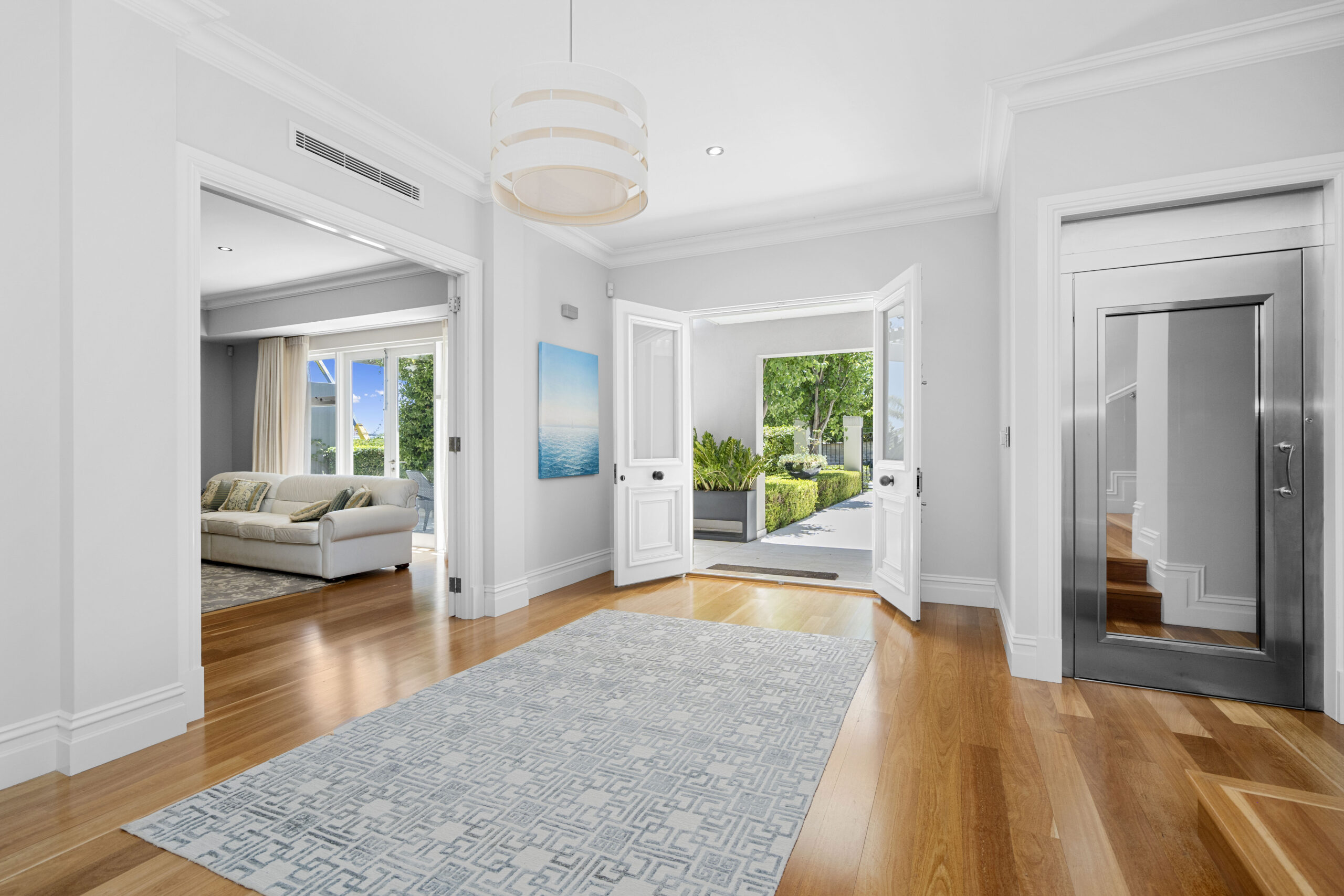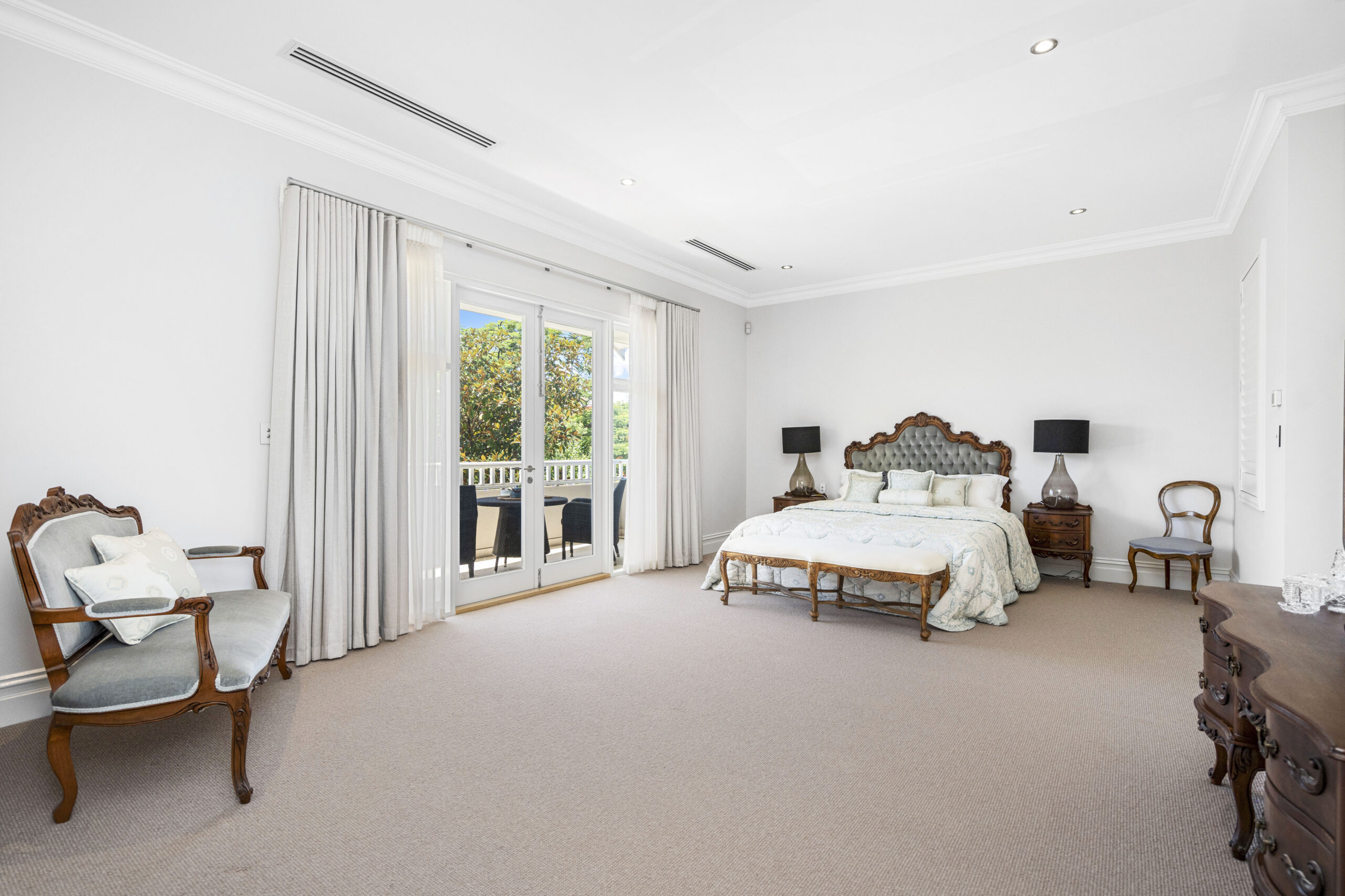 The sleek designer kitchen leaves no stone unturned and is certain to impress seasoned entertainers. It includes an adjoining scullery with a second dishwasher and Ilve oven, pantry storage, extra sinks and fridge recess. There’s plenty of space at the island breakfast bar, engineered stone benchtops and glass splash backs, and a suite of Miele appliances, including double ovens, a 5-burner cooktop and a dishwasher.